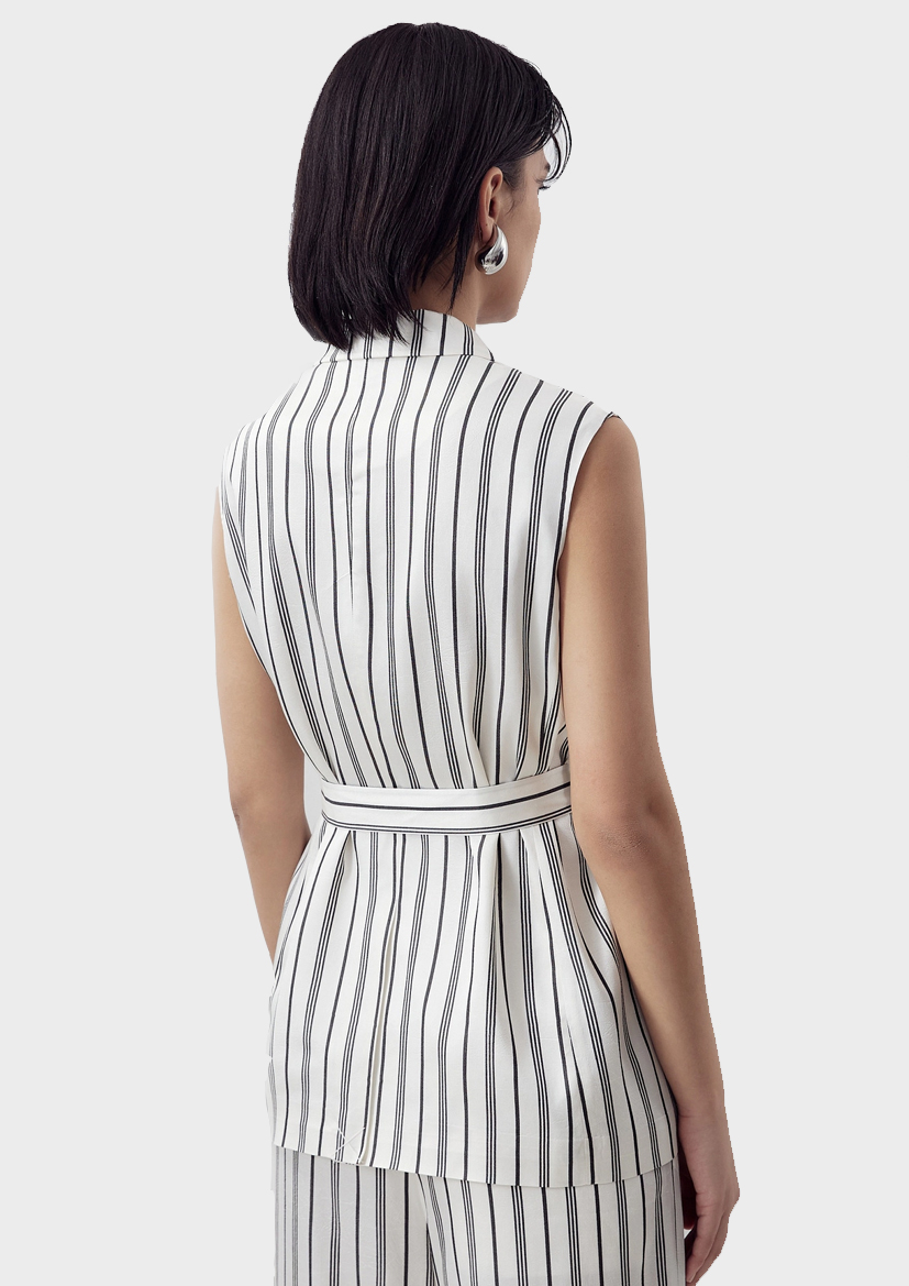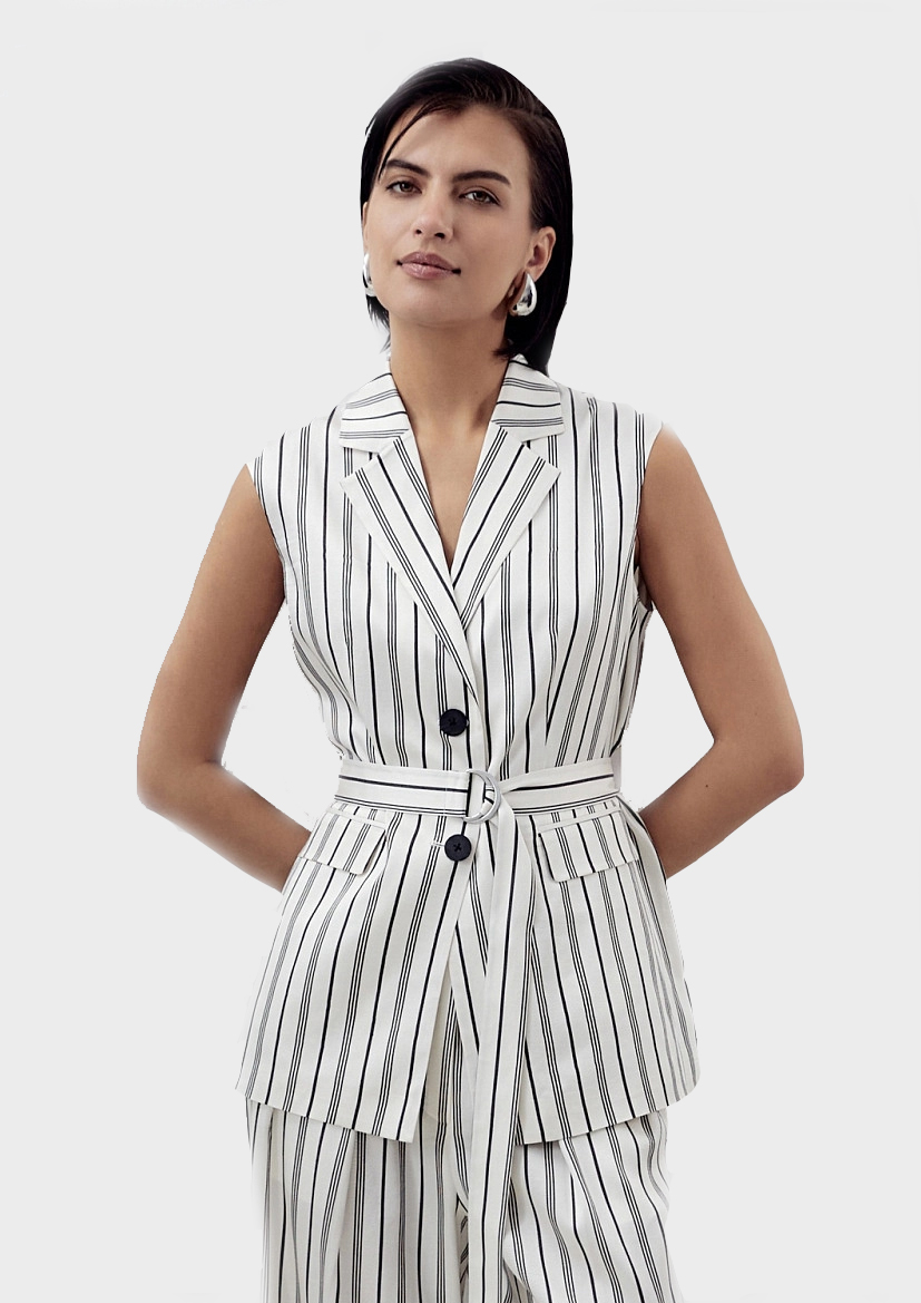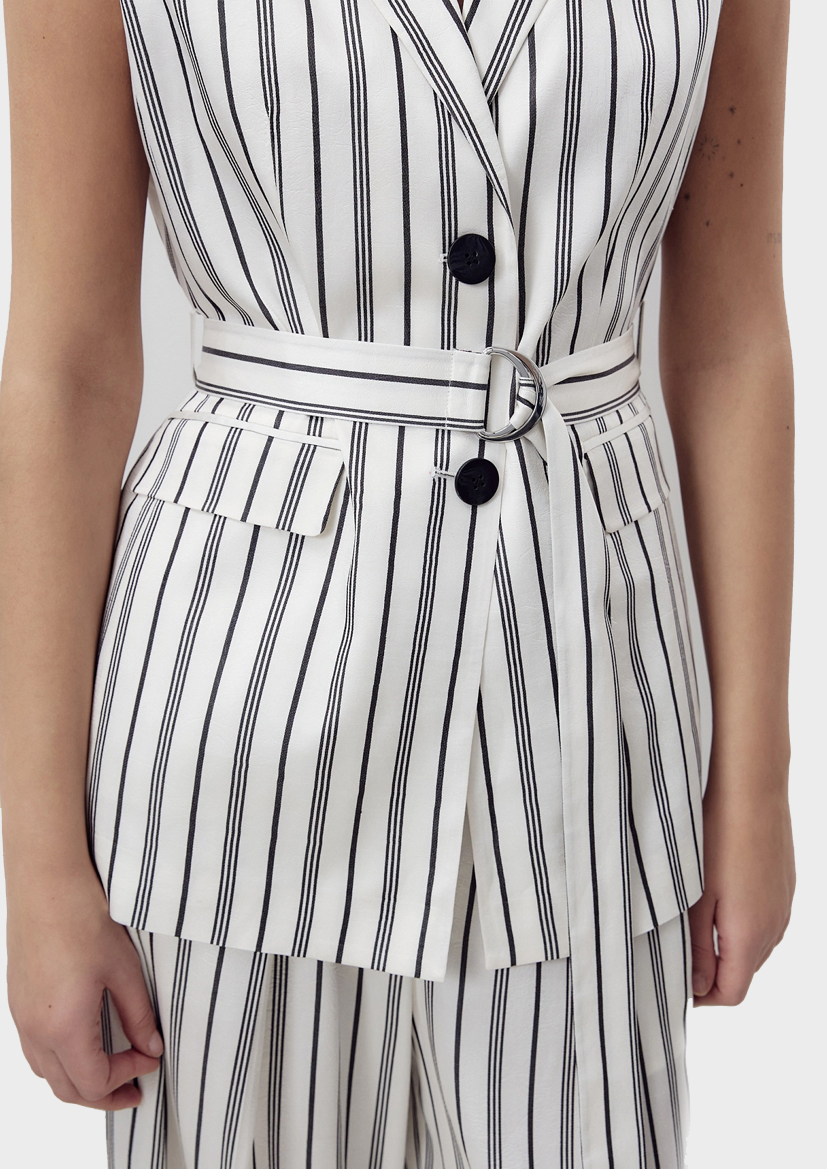 Прямой удлинённый жилет с английским воротником и V-образным вырезом, на двух пуговицах. На полочке прорезные карманы с клапанами. В комплект входит пояс из основной ткани с полукольцами. Создаст стильный весенний образ с брюками из одной ткани.