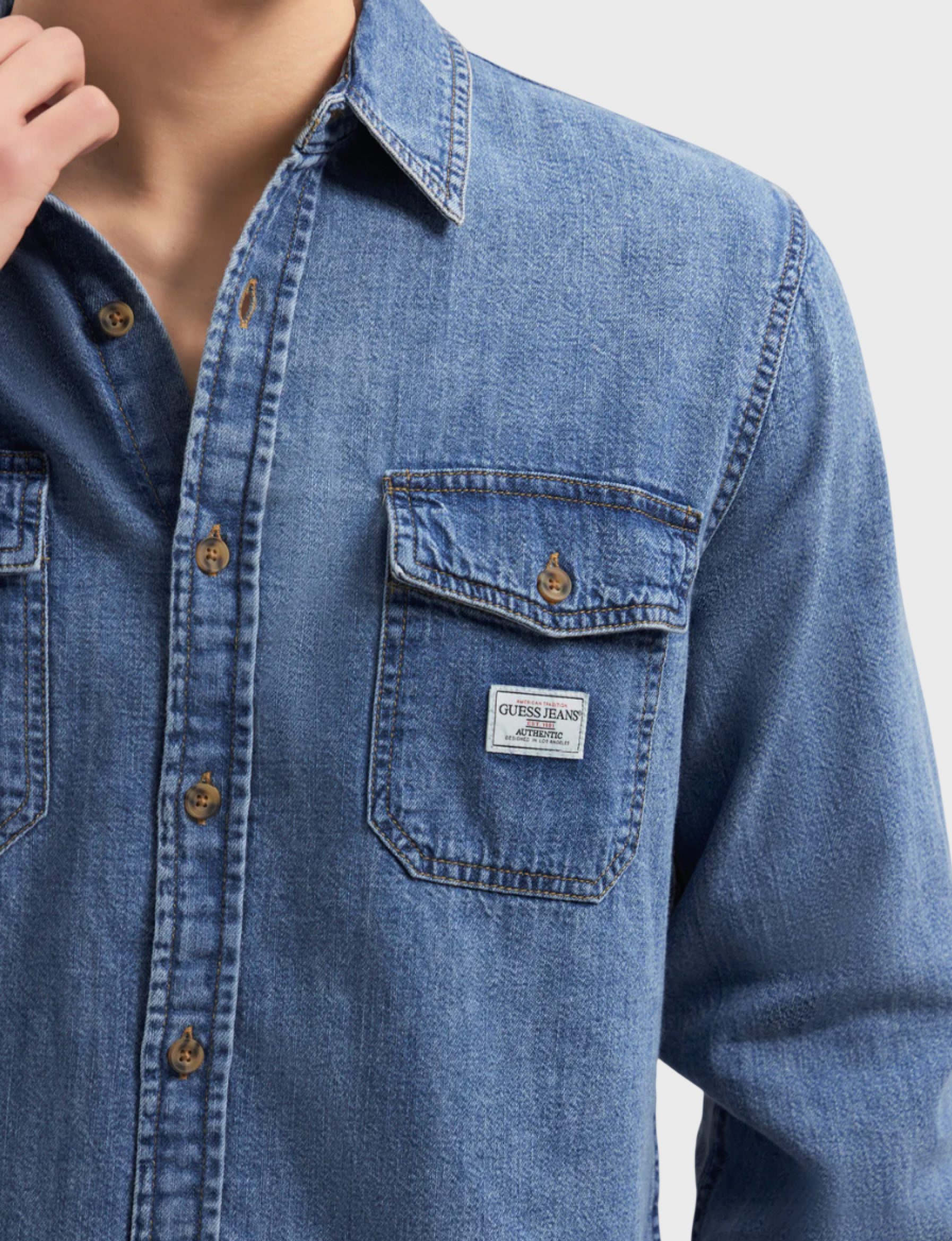 Джинсовая рубашка GUESS Jeans – Элегантность и комфорт благодаря 100%-ному хлопку. Классический синий цвет легко сочетается с джинсами, брюками и шортами.