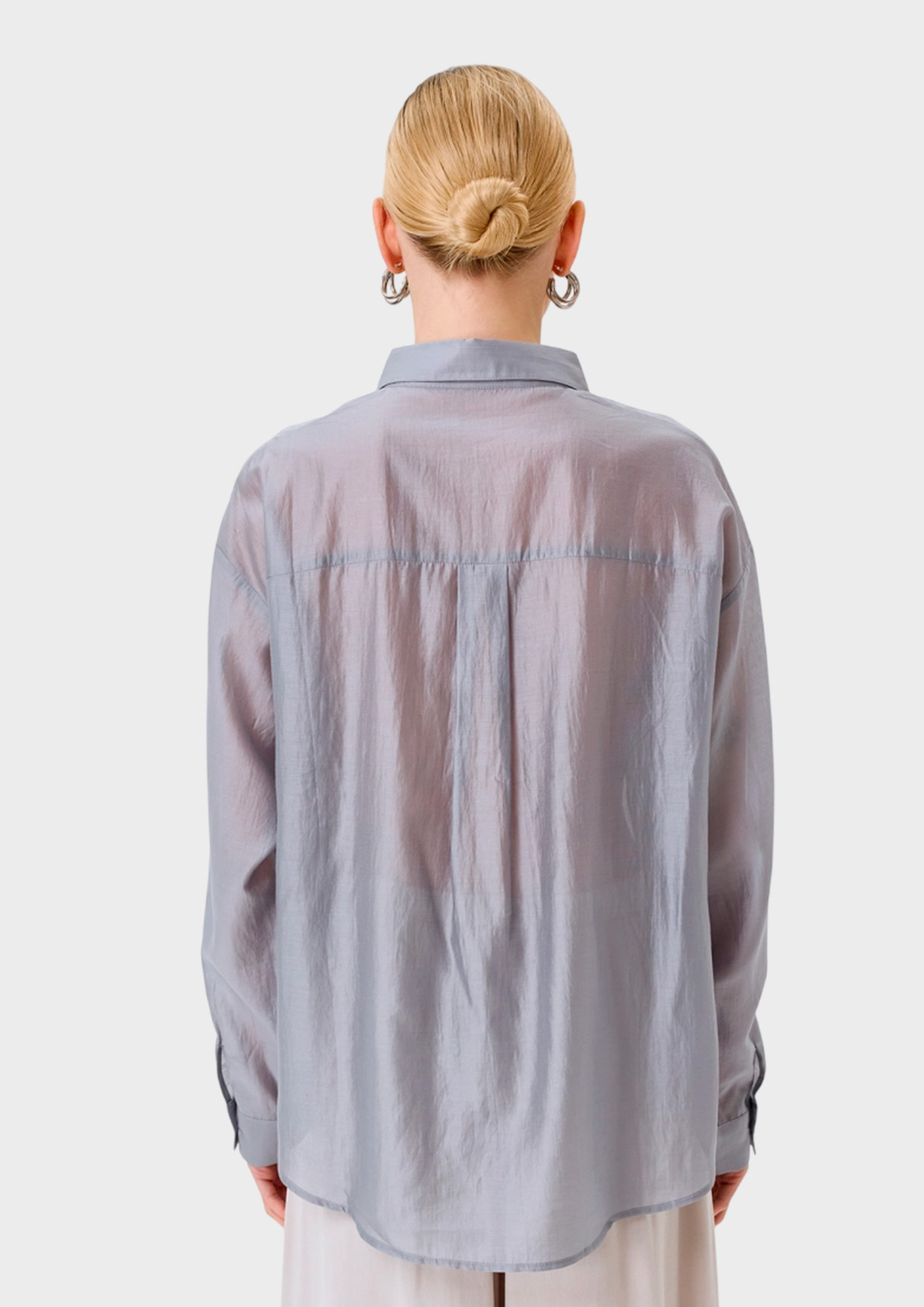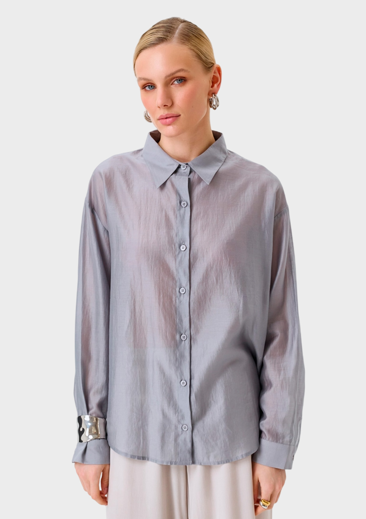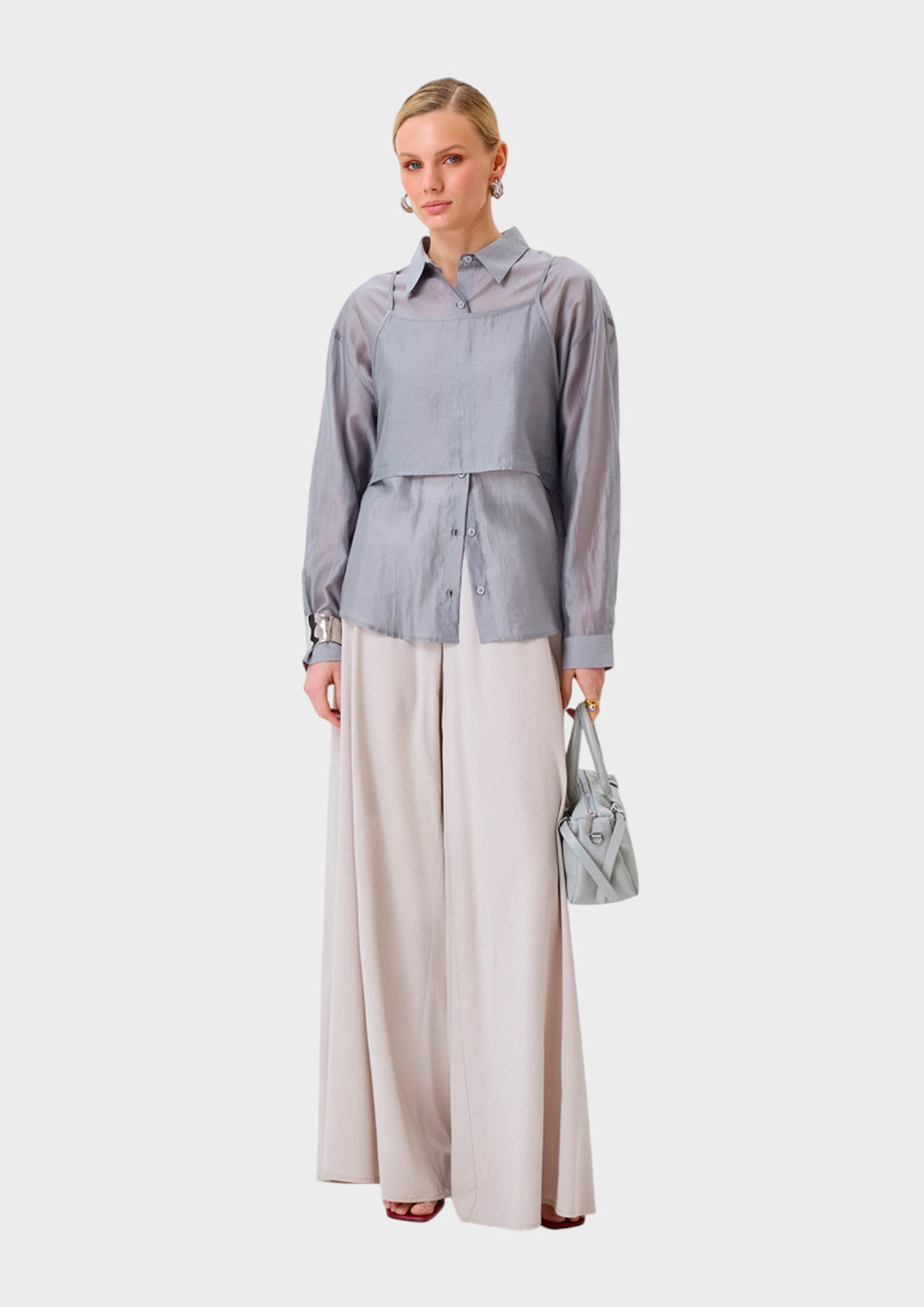 Комбинированная блузка с топом из воздушного полупрозрачного текстиля. Свободный силуэт. Спущенная линия плеч. Отложной воротник. Застежка на пуговицы. Спинка немного удлинена. Длинные объемные рукава. Дополнена съемным топом свободного силуэта. В составе тенсель.