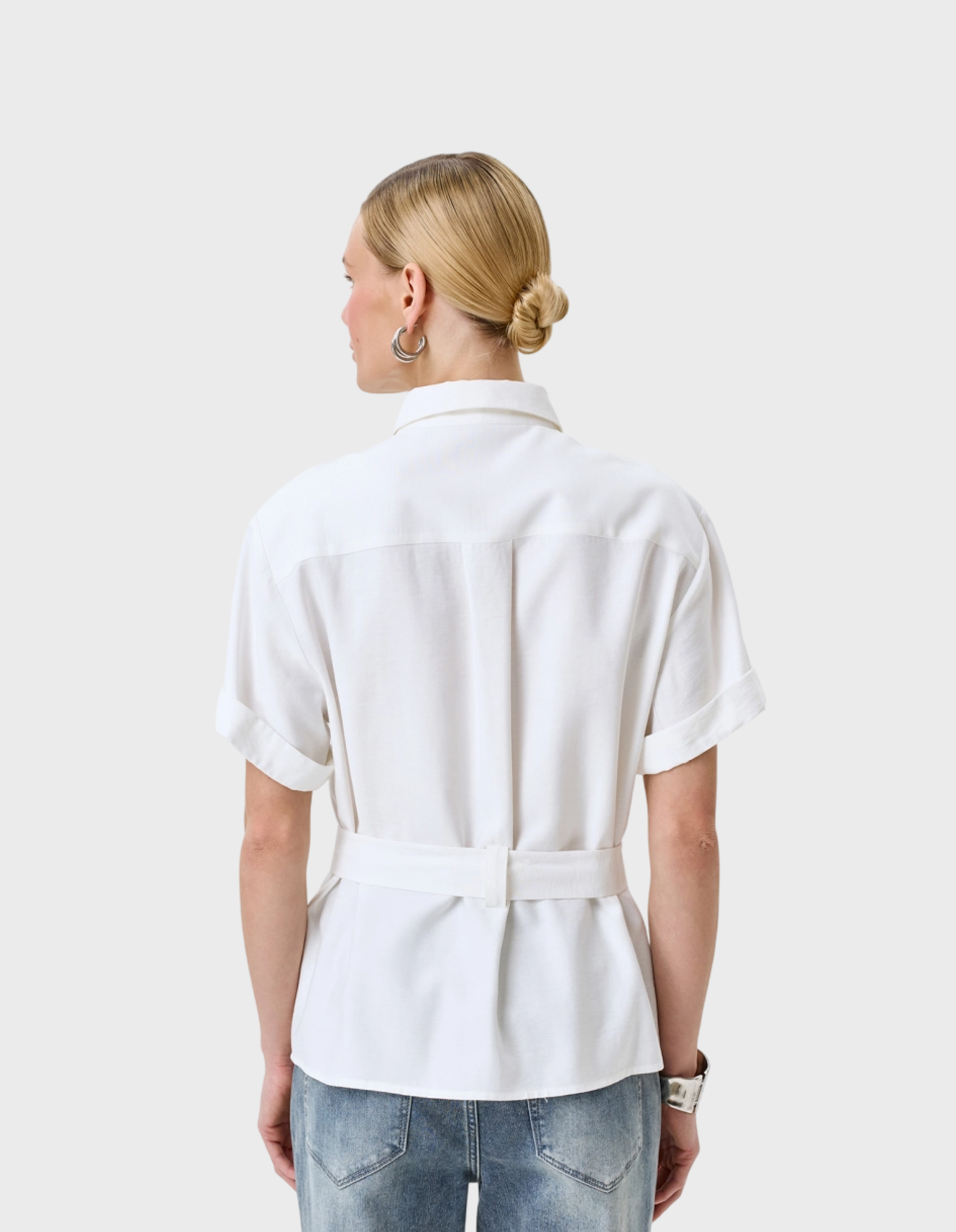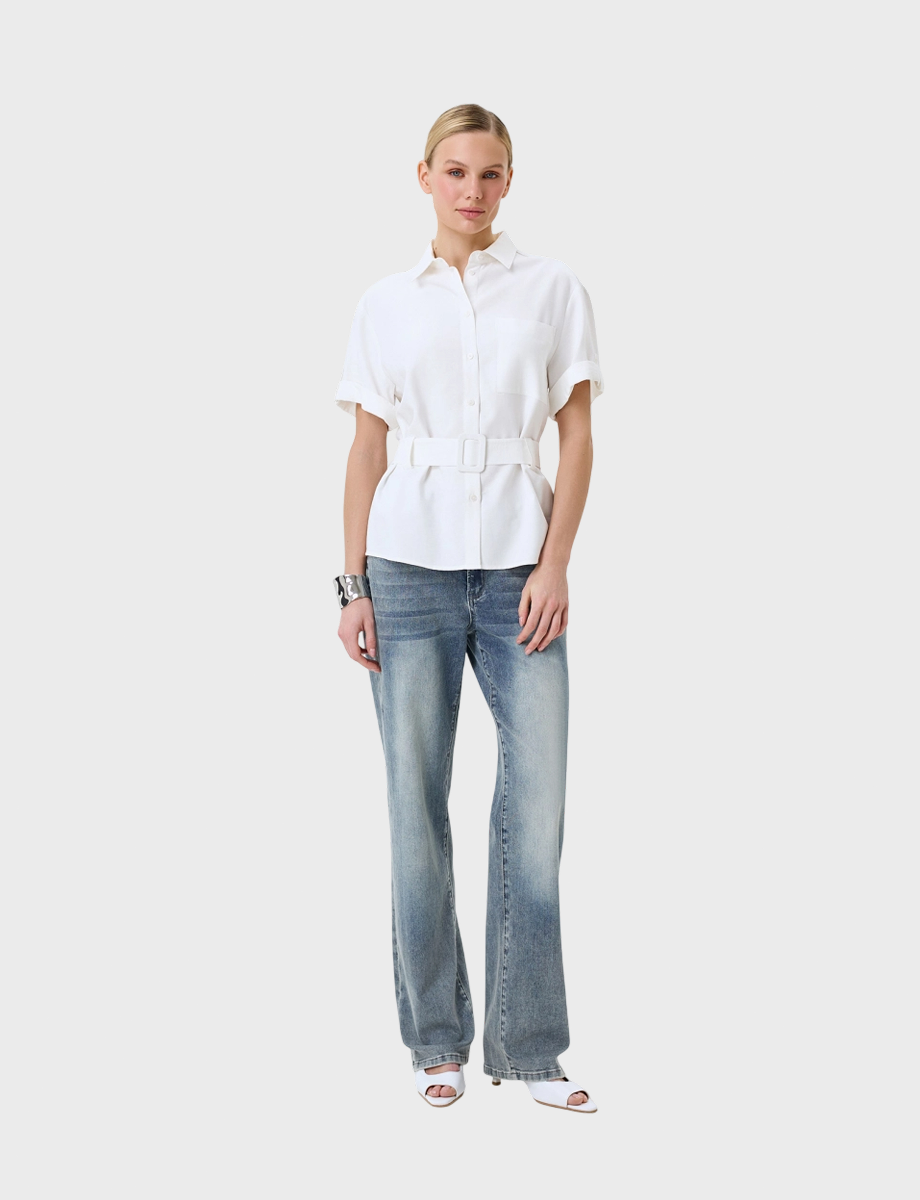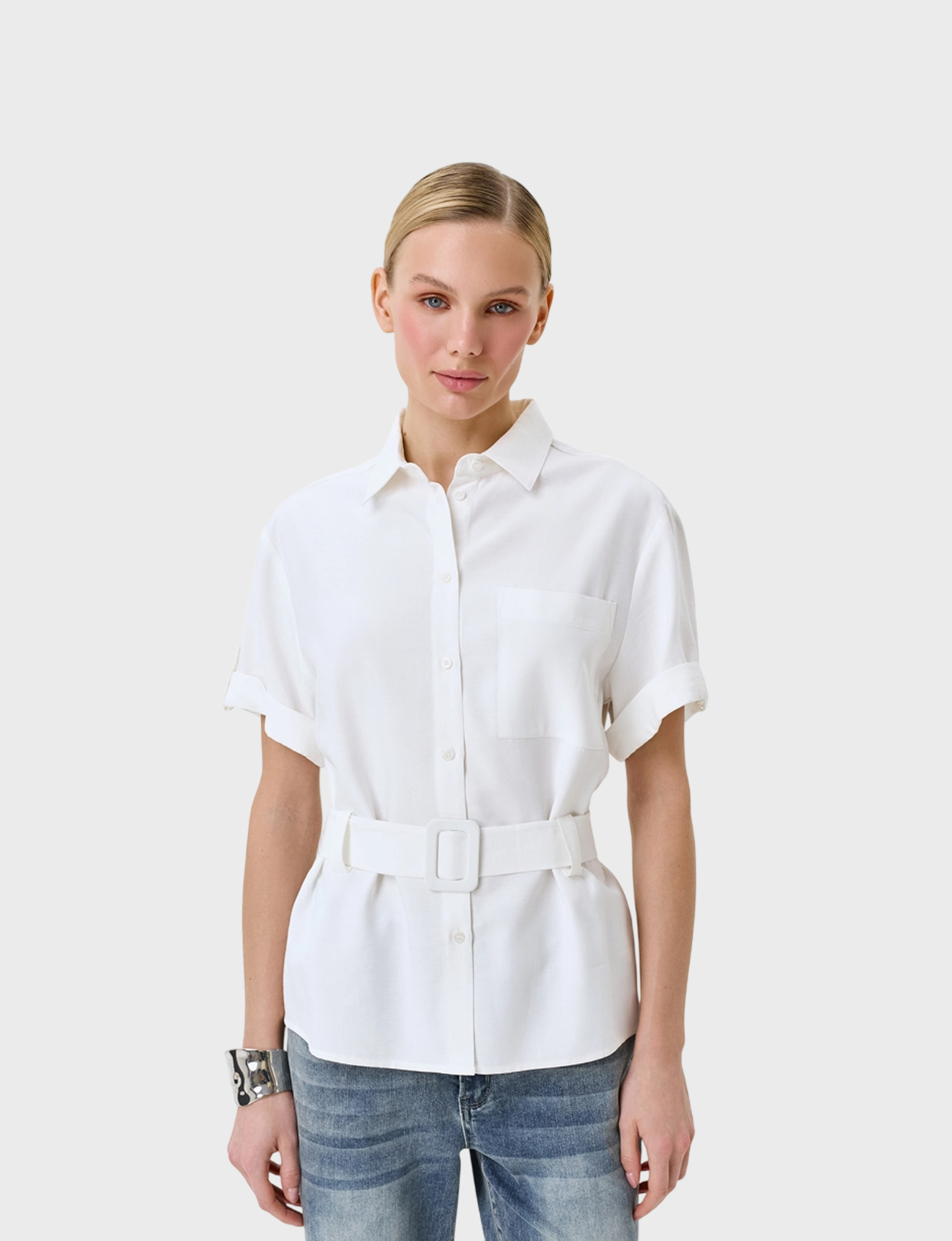 Классическая блузка прямого силуэта из вискозы. Короткие свободные рукава. Застежка на пуговицы. Отложной воротник. Накладной нагрудный карман. Прямой силуэт можно приталить широким текстильным поясом с пряжкой.