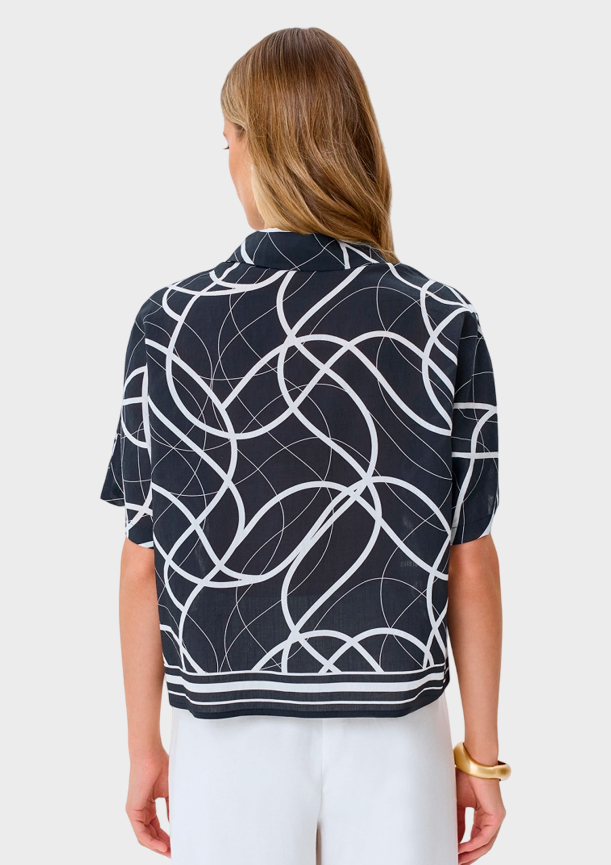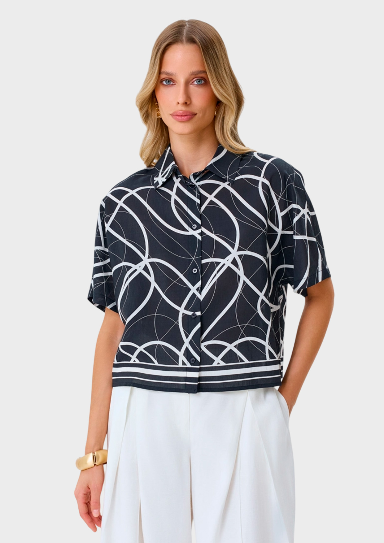 Яркая укороченная блузка с фантазийным принтом. Свободный силуэт. Отложной воротник. Застежка на пуговицы. Спущенная линия плеч дополнена широкими укороченными рукавами. Купонный кант по низу изделия. В составе район и тенсель.