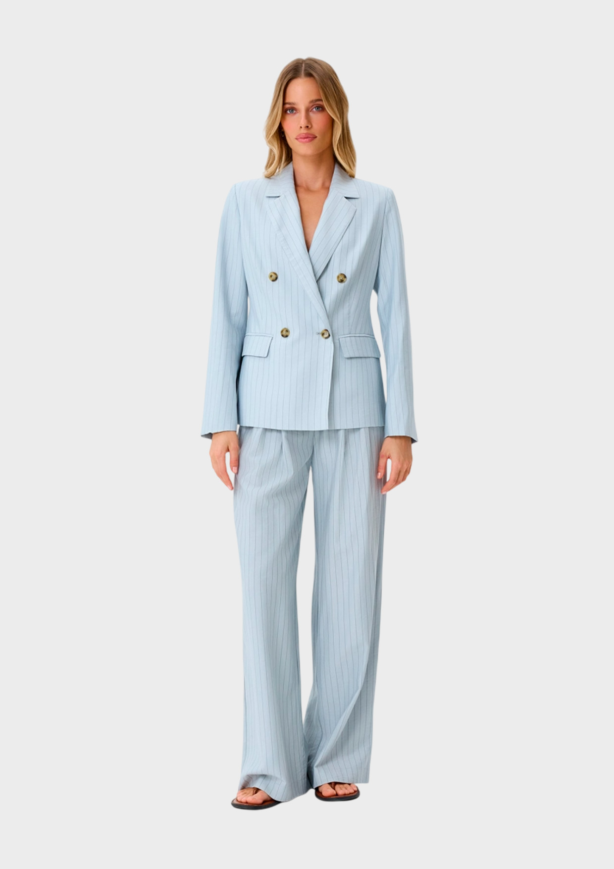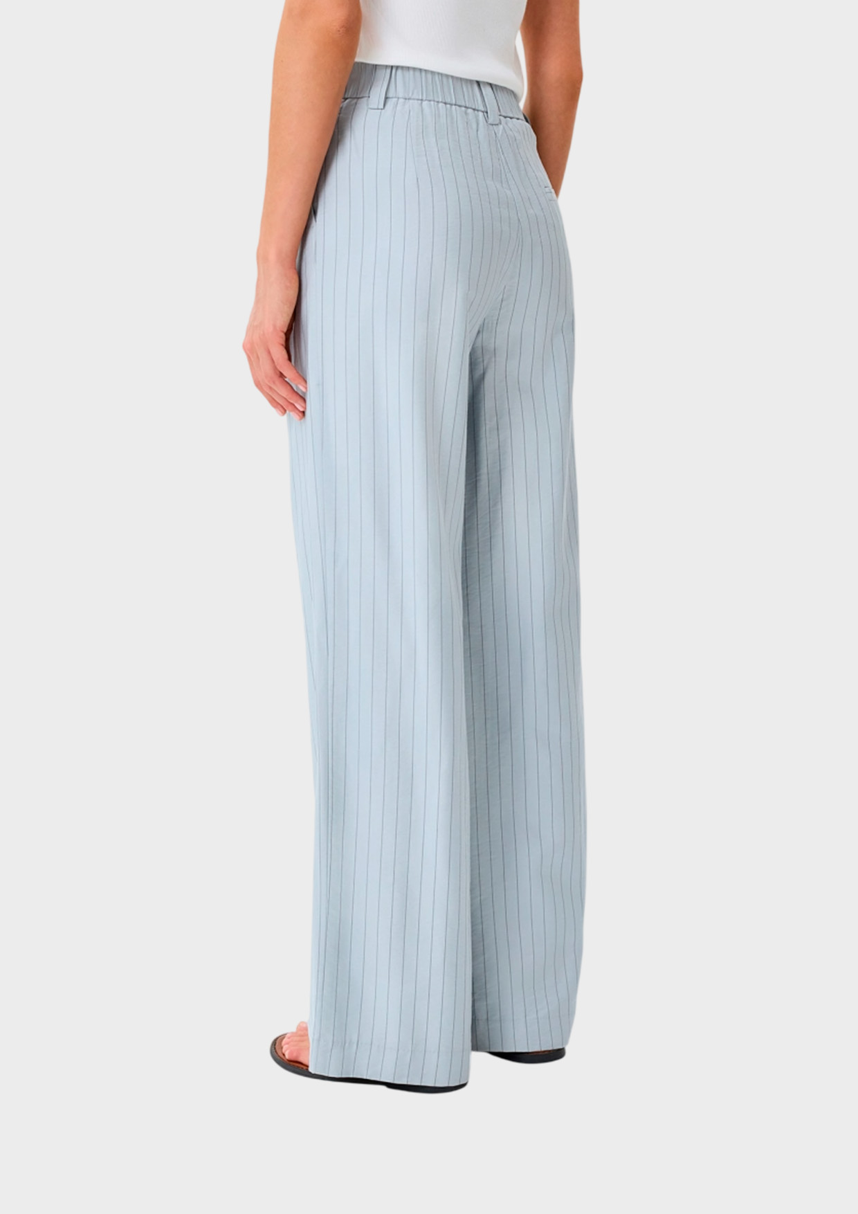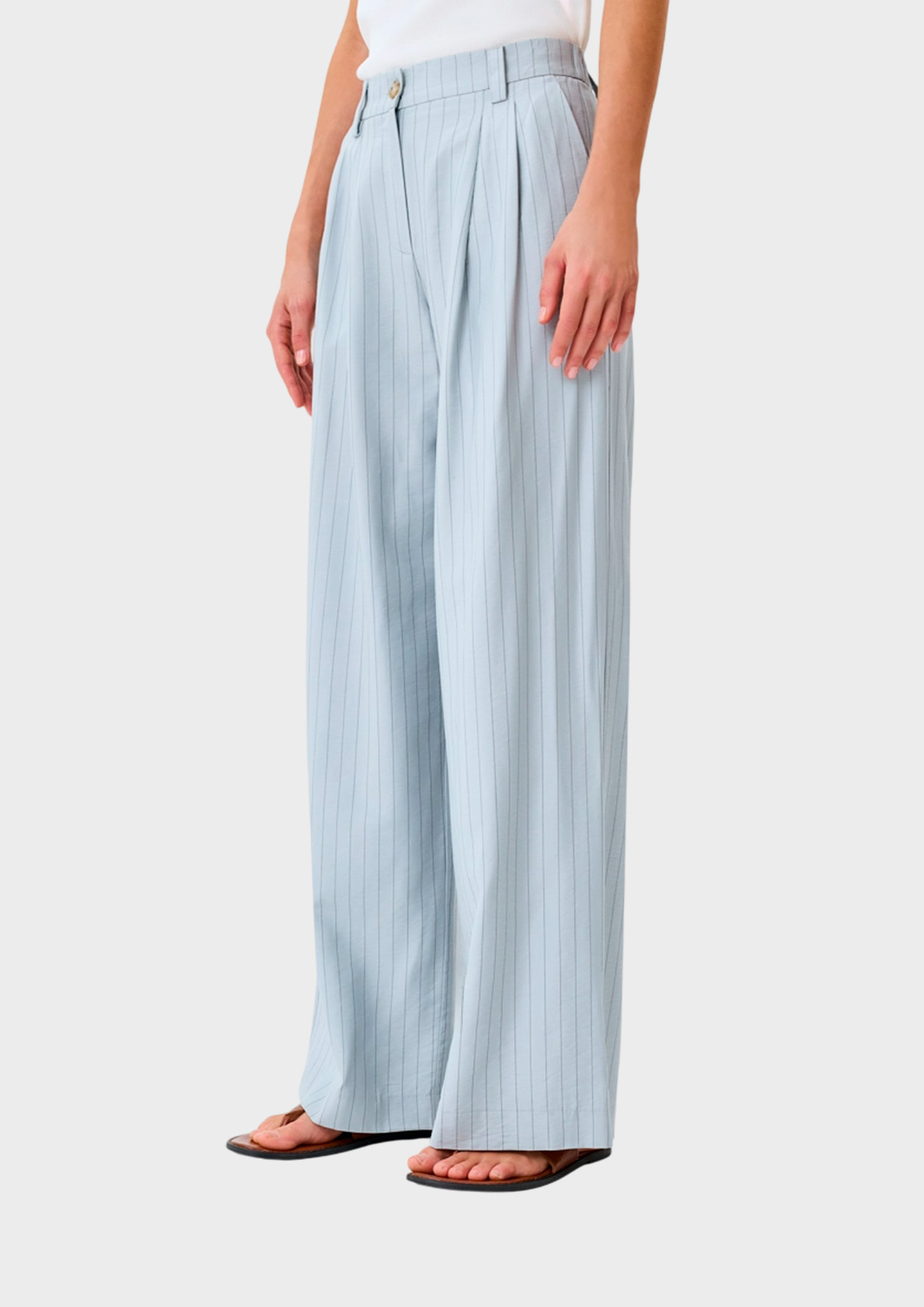 Широкие брюки палаццо в тонкую полоску. Свободный силуэт. Застежка на молнию и пуговицу. Боковые карманы в швах.