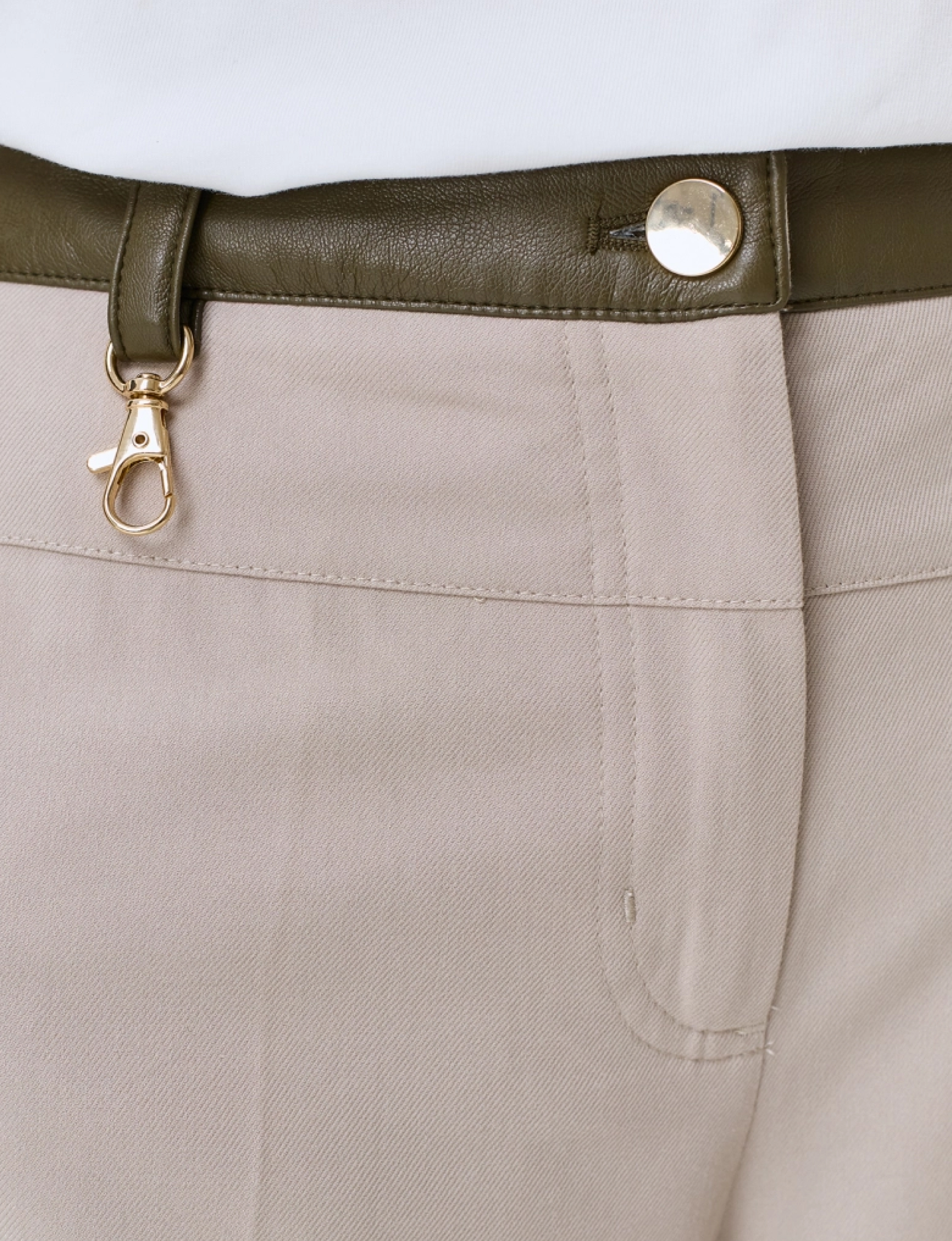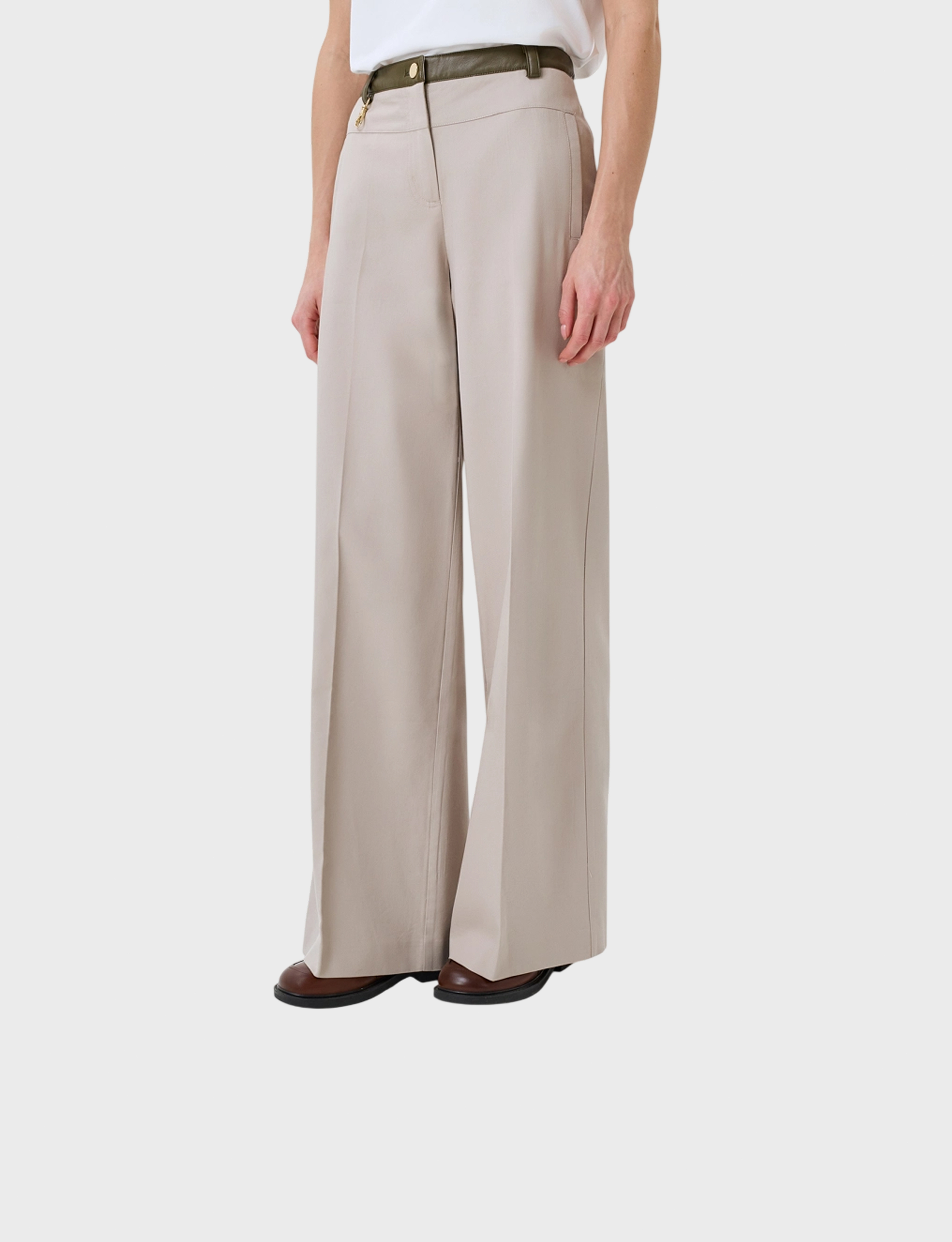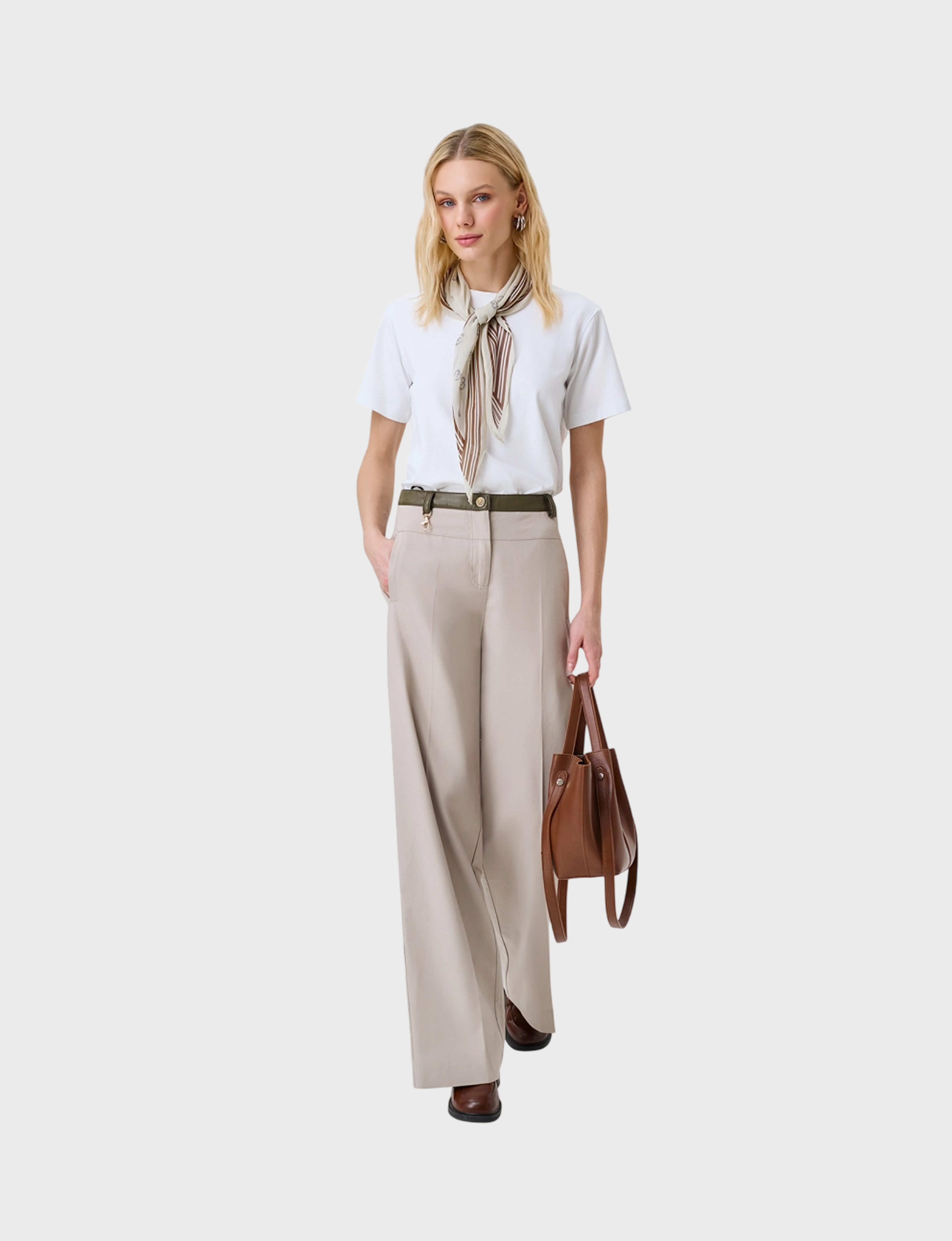 Широкие романтичные брюки с мягкими стрелками. Свободный силуэт. Боковые карманы в швах. Контрастный пояс из эко кожи с металлическим декором. Застежка на молнию и пуговицу. В составе вискоза и хлопок.
