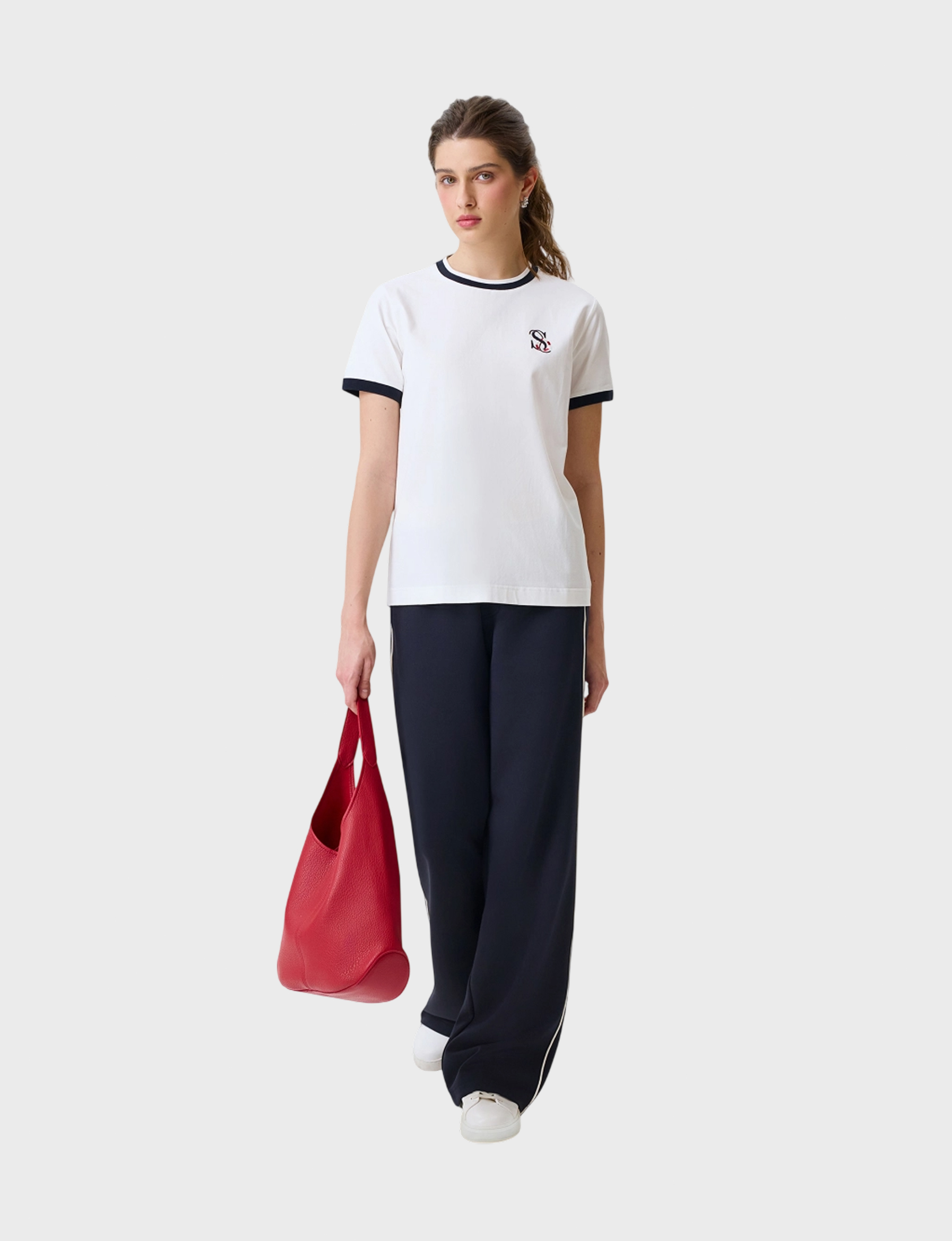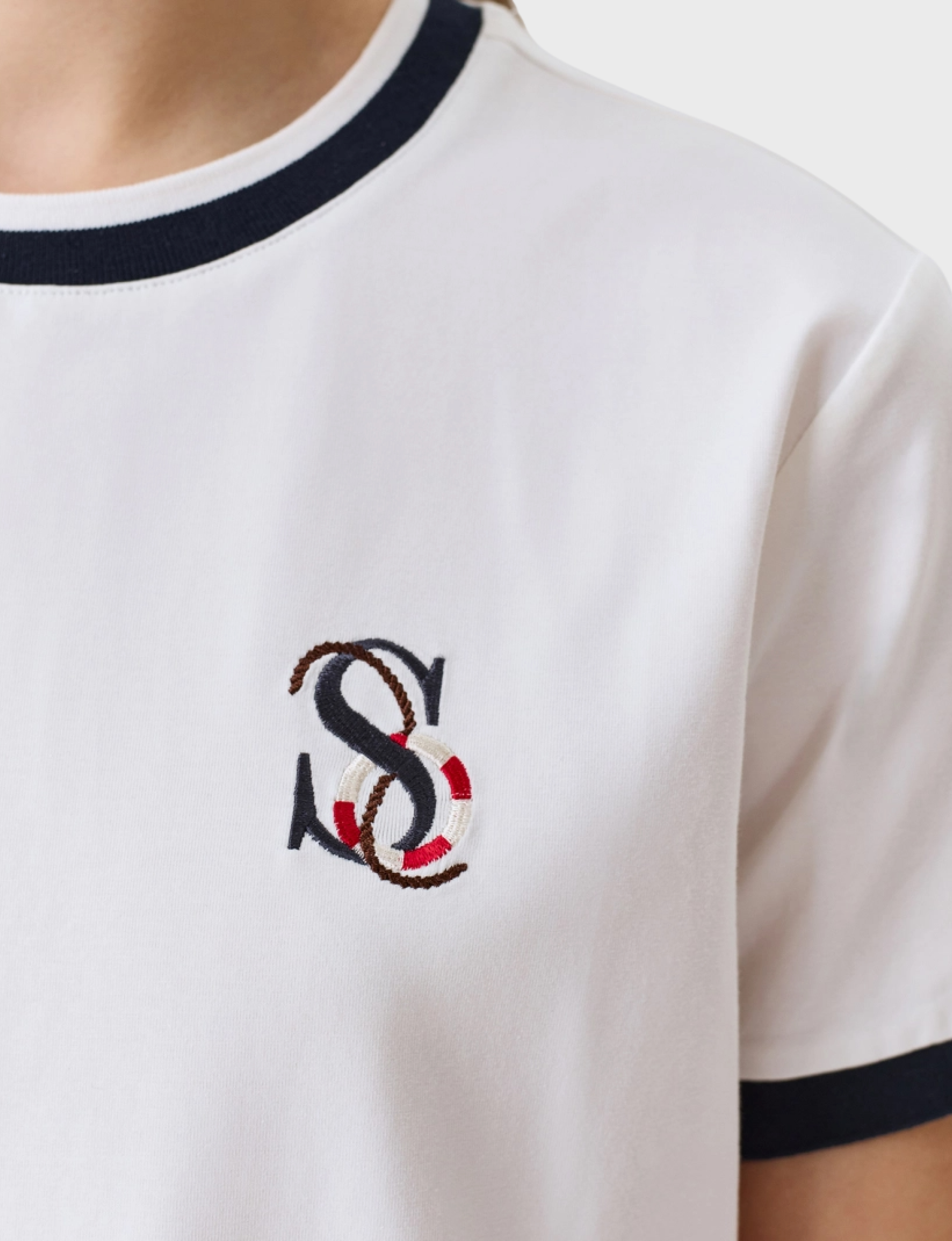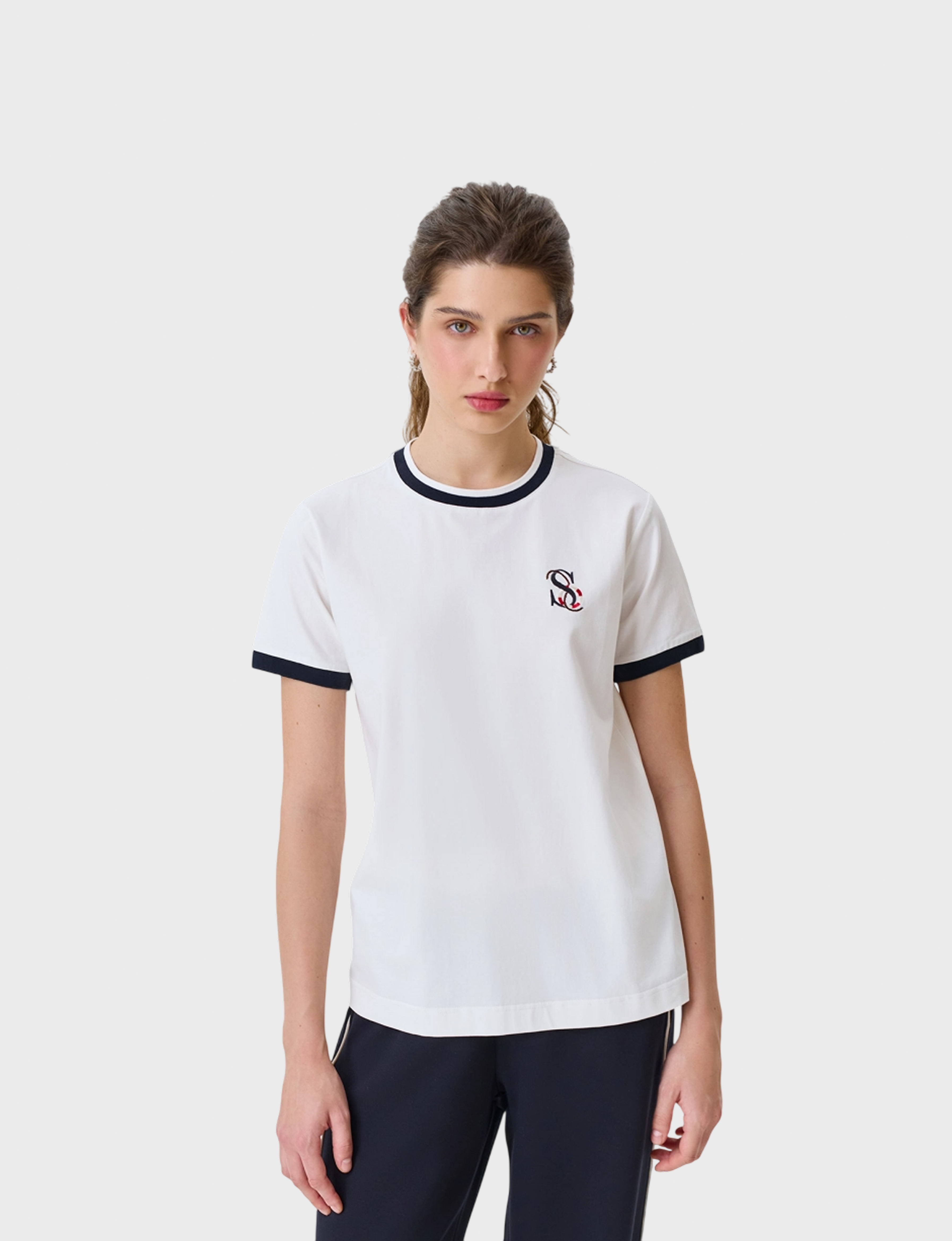 Футболка с контрастными деталями. Прямой силуэт. Круглый вырез. Короткие втачные рукава. Контрастный риб по горловине и низу рукавов. Дополнена яркой вышивкой монограммой. В составе хлопок.