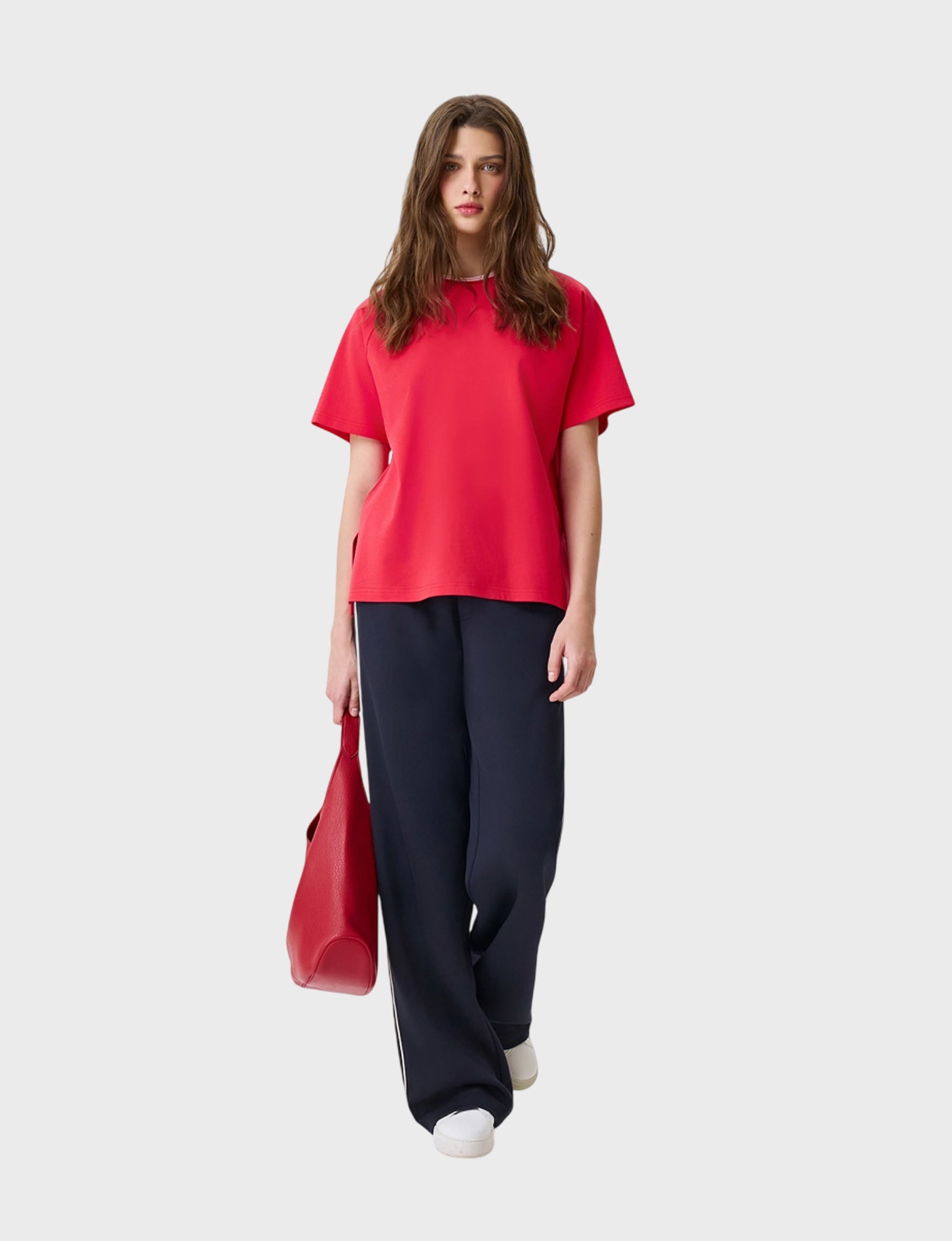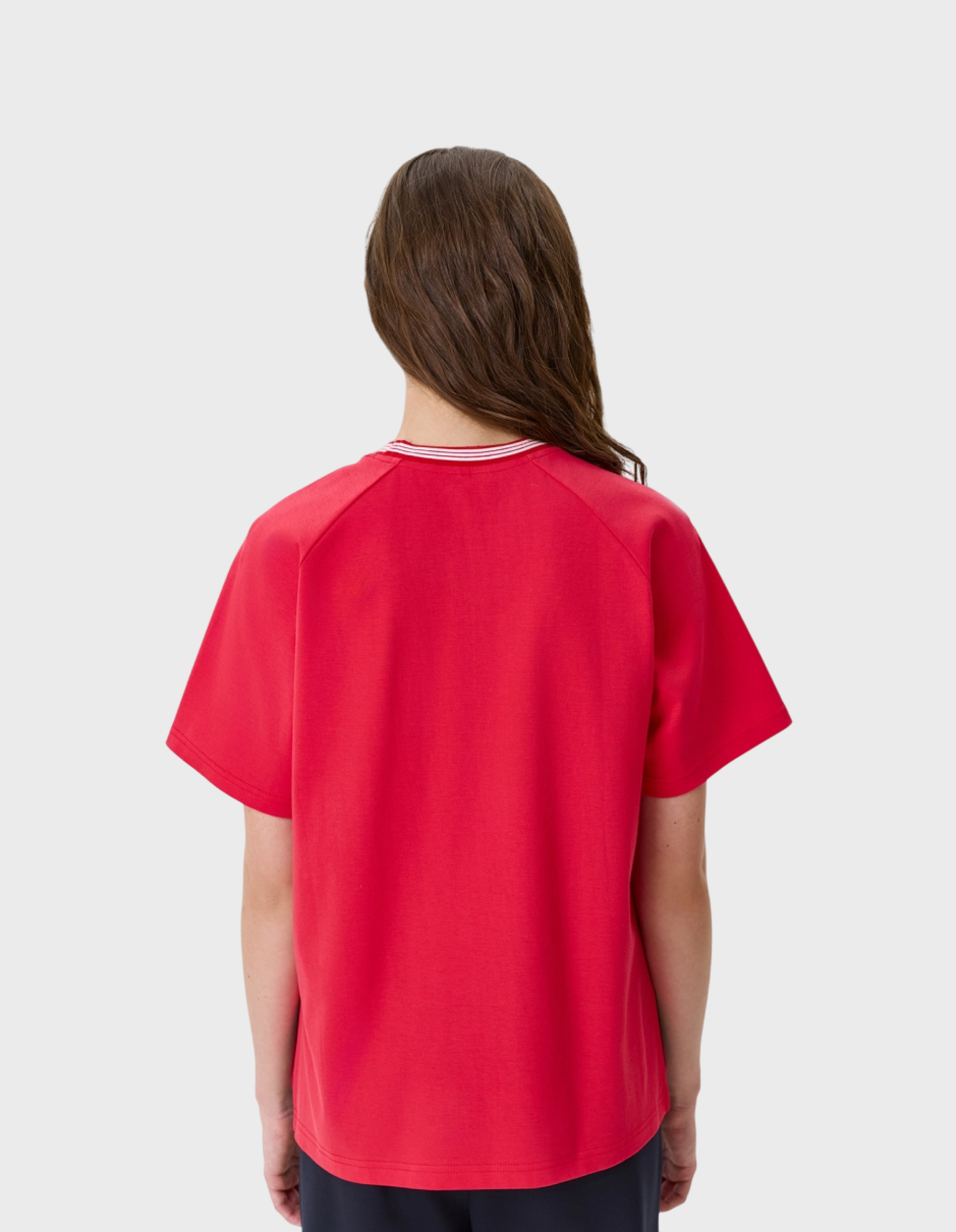 Яркая футболка Oversize из 100% хлопка. Свободный силуэт. Круглый вырез. Объемные укороченные рукава реглан. Дополнена контрастным рибом по горловине. Боковые разрезы в швах.