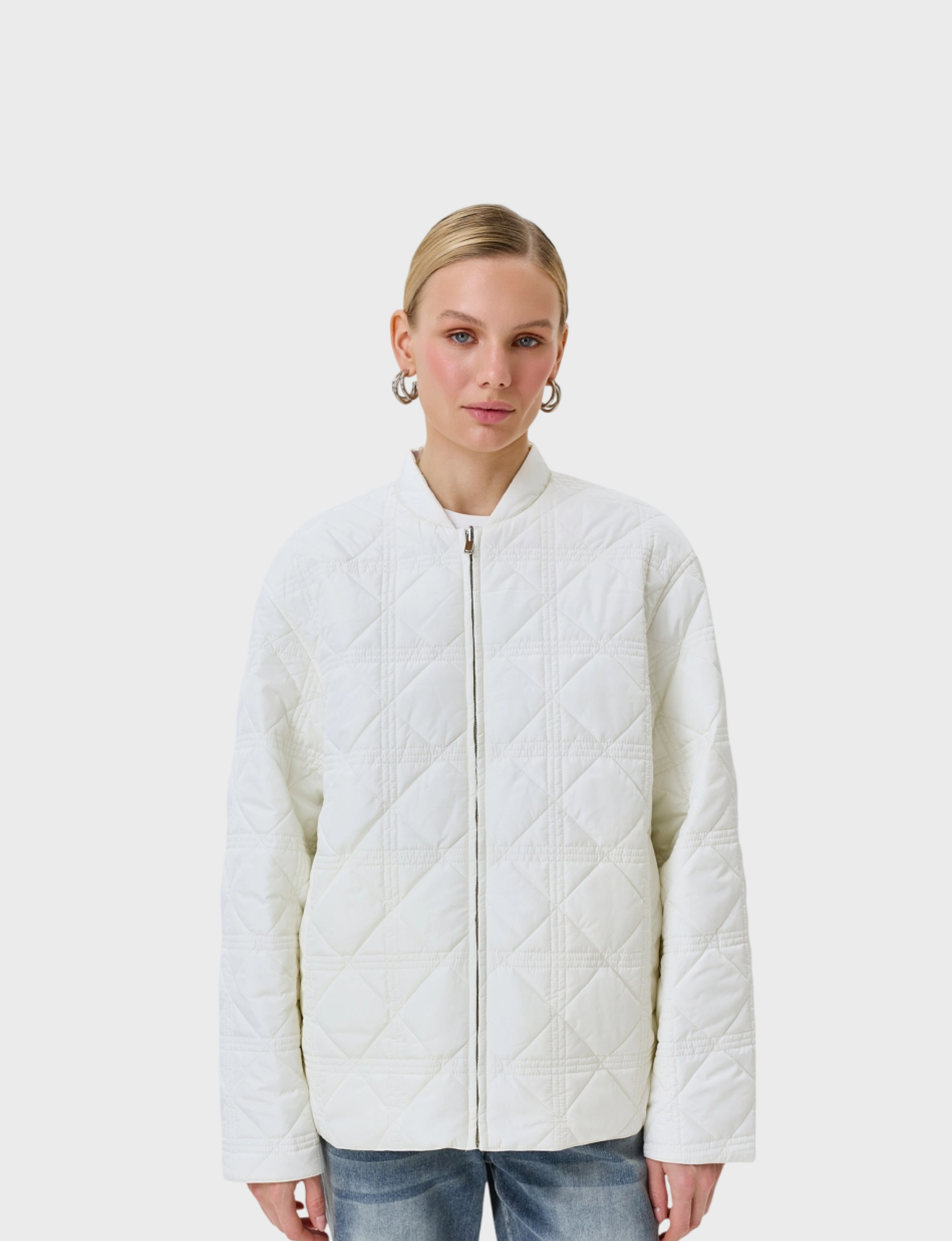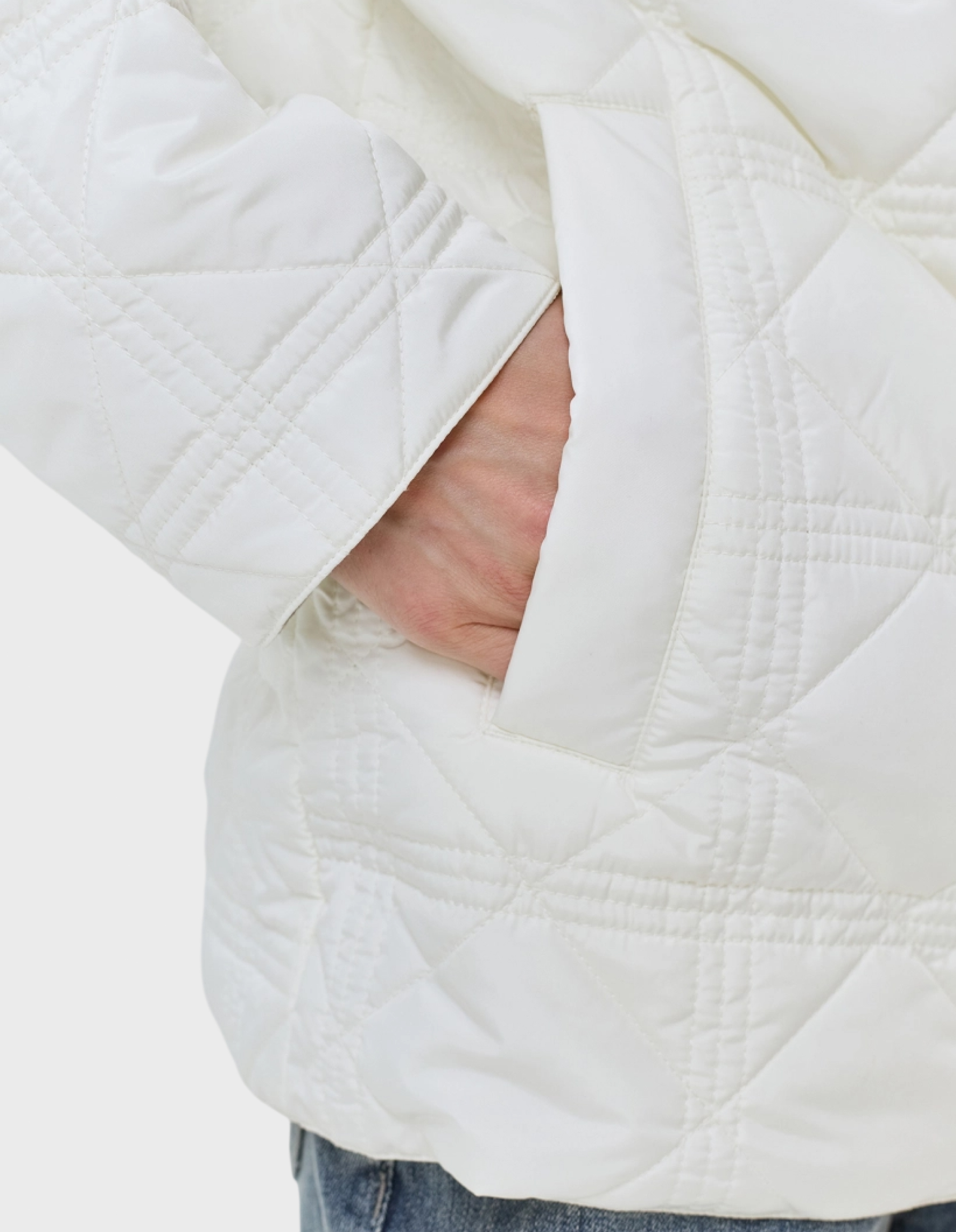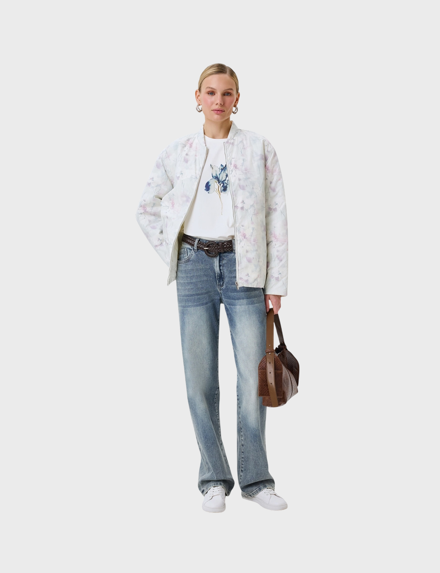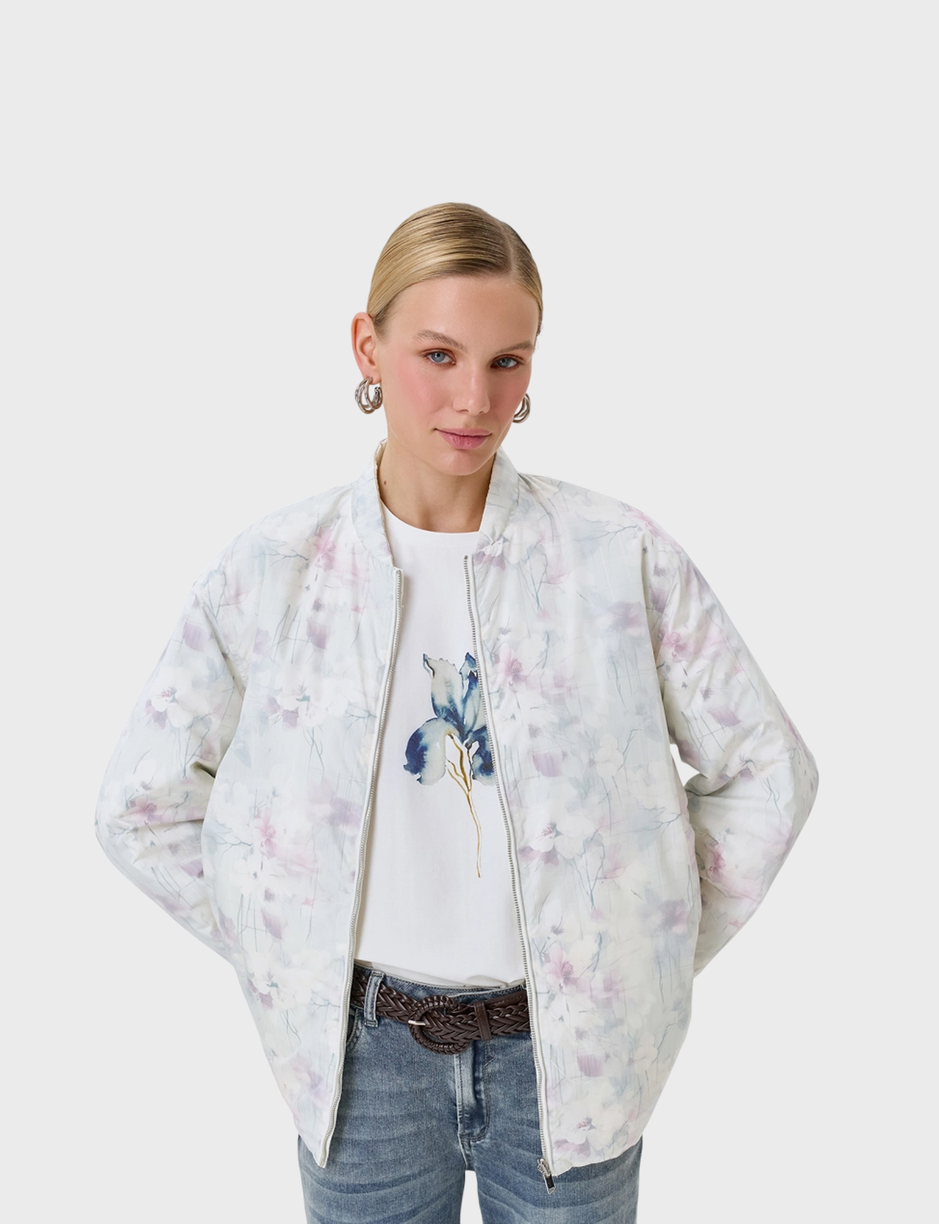 Двусторонняя куртка с флоральным принтом меняющимся на однотонную стеганную куртку. Прямой силуэт. Линия плеч немного спущена. Воротник небольшая стойка. Застежка на молнию. Боковые карманы с листочками. Искусственный утеплитель.