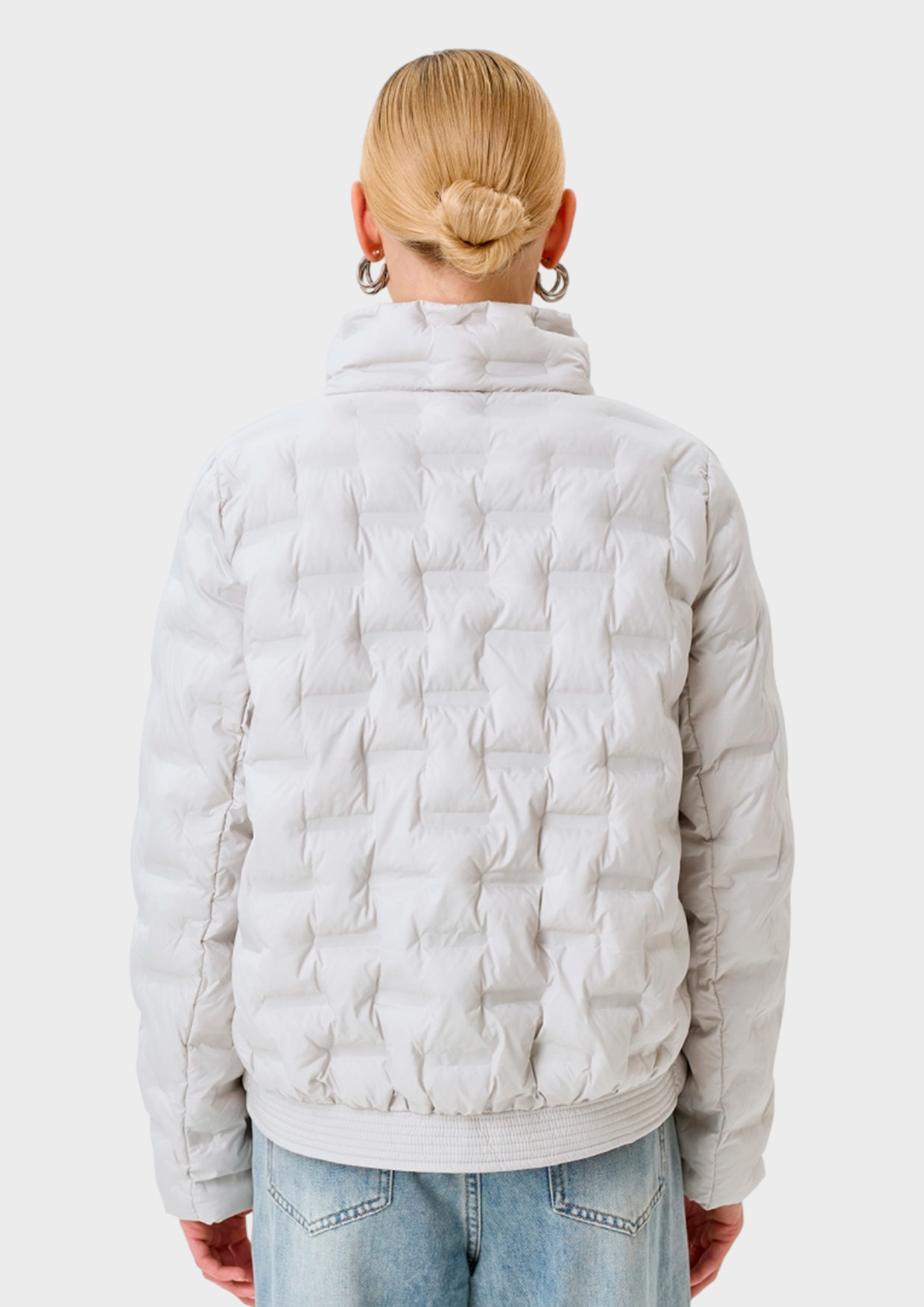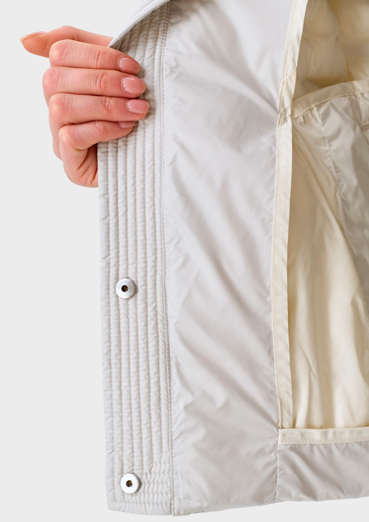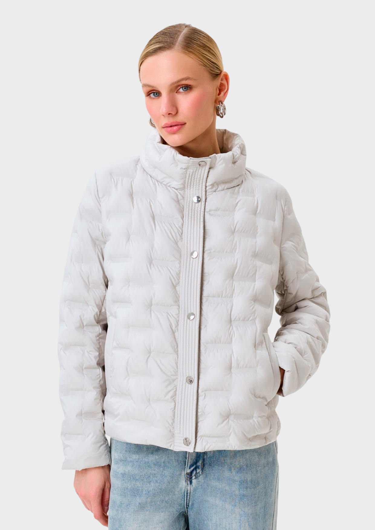 Легкая куртка с абстрактной сквозной термо стежкой на искусственном утеплителе. Свободный силуэт. Воротник стойка на кнопках. Застежка на кнопки. Боковые карманы с листочками.