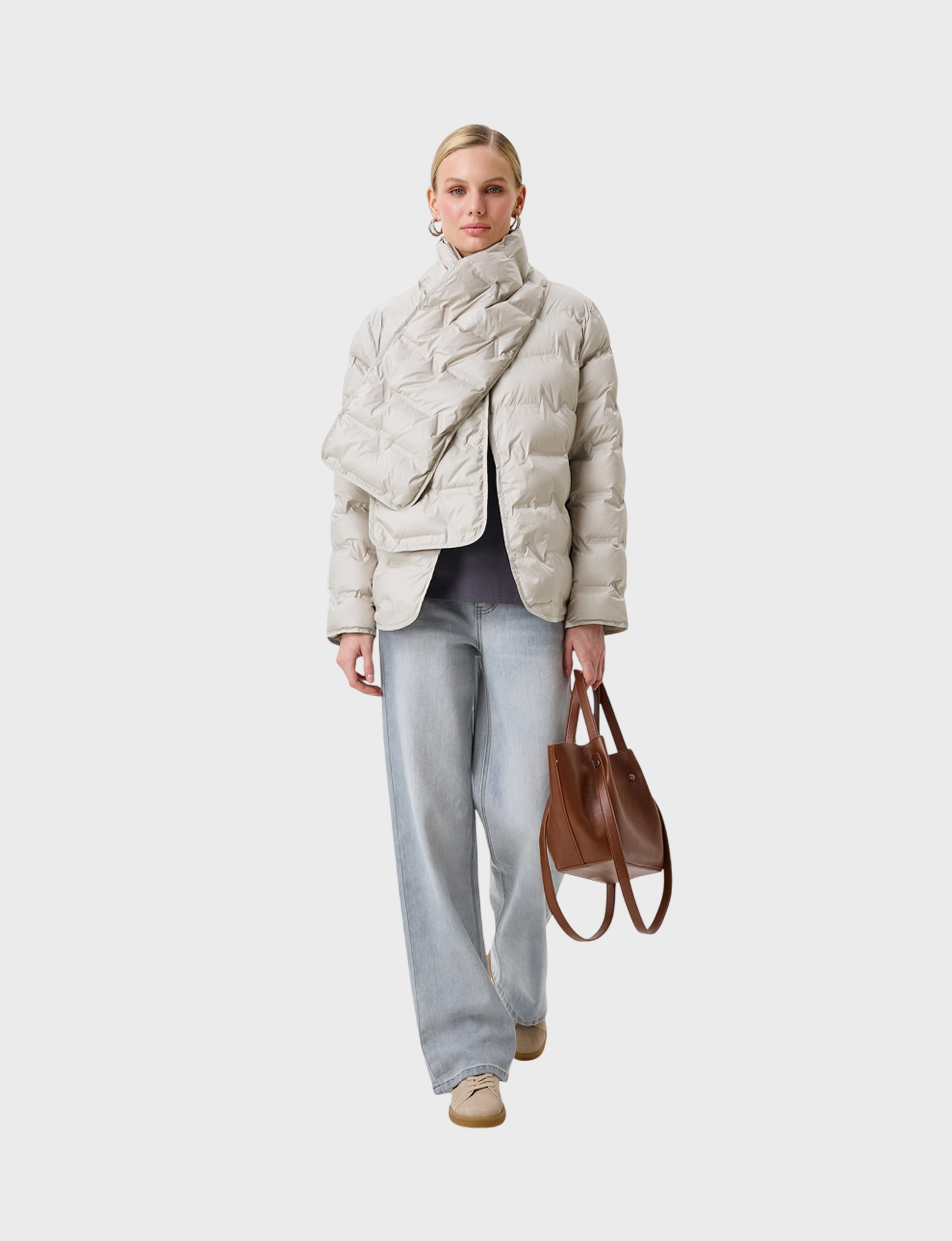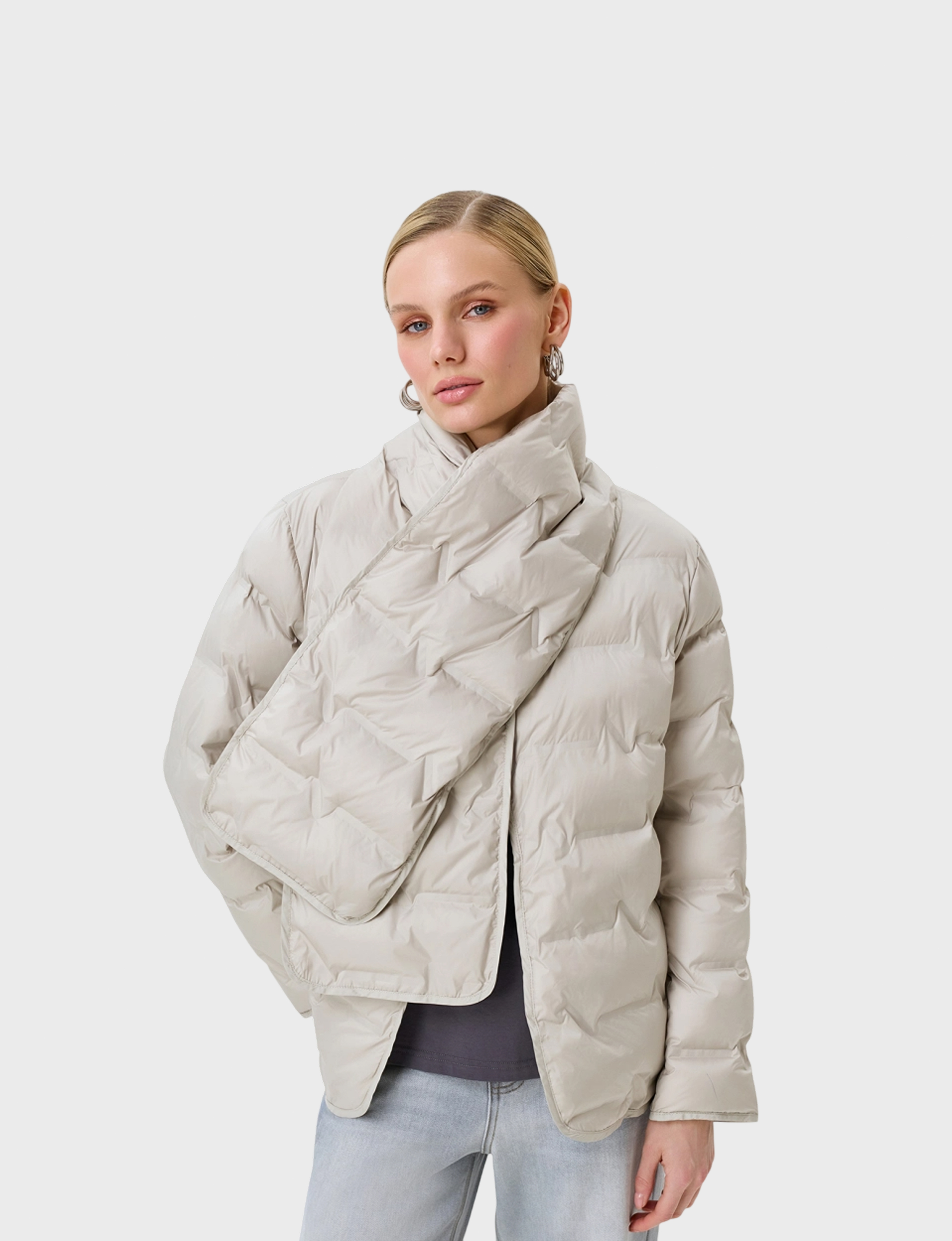 Фактурная куртка с термостежкой и акцентным шарфом. Прямой силуэт. Круглый вырез. Застежка на магнитные кнопки. Боковые карманы на потайных молниях. Дополнена акцентным съемным шарфом с застежкой на магнитные кнопки. Искусственный утеплитель.