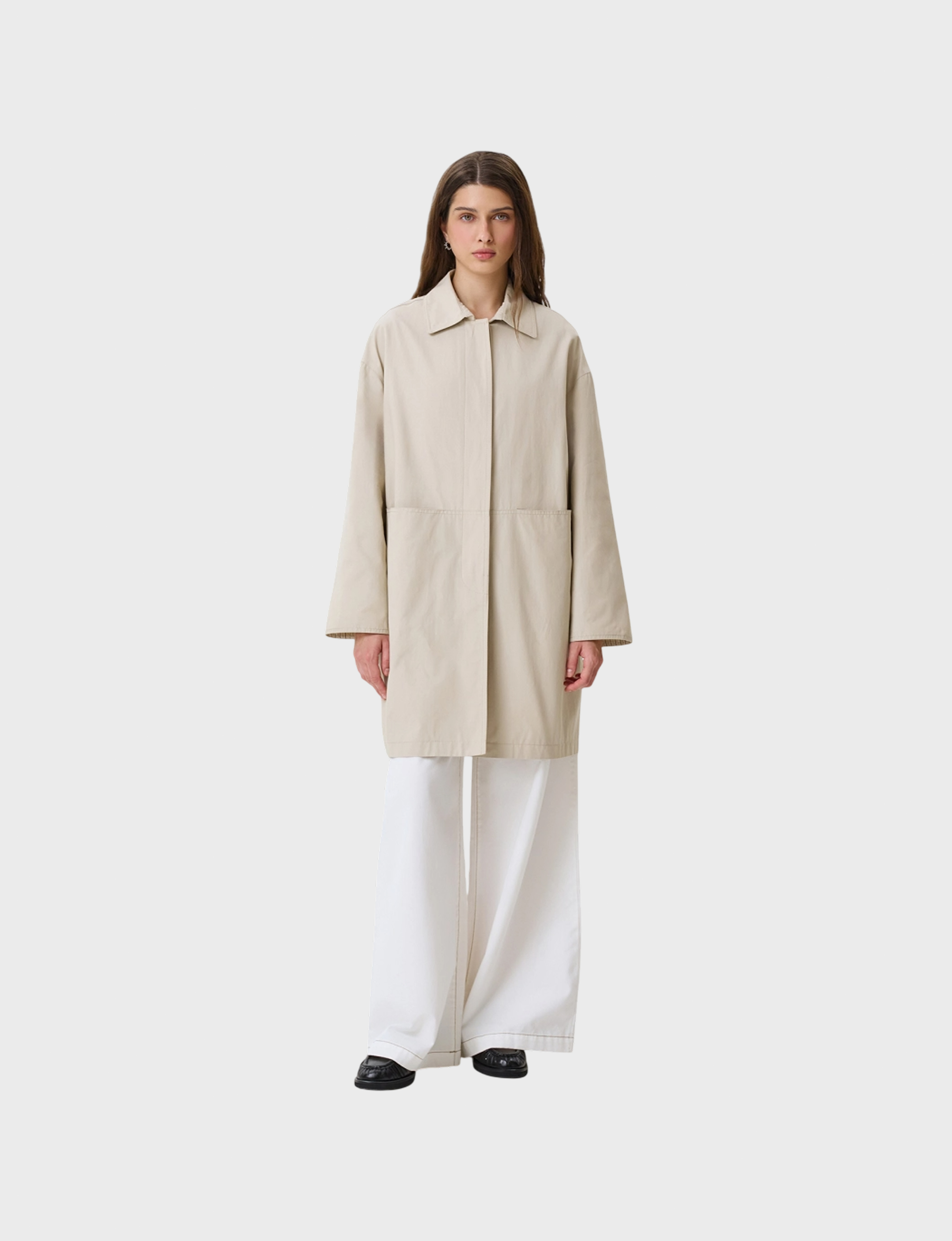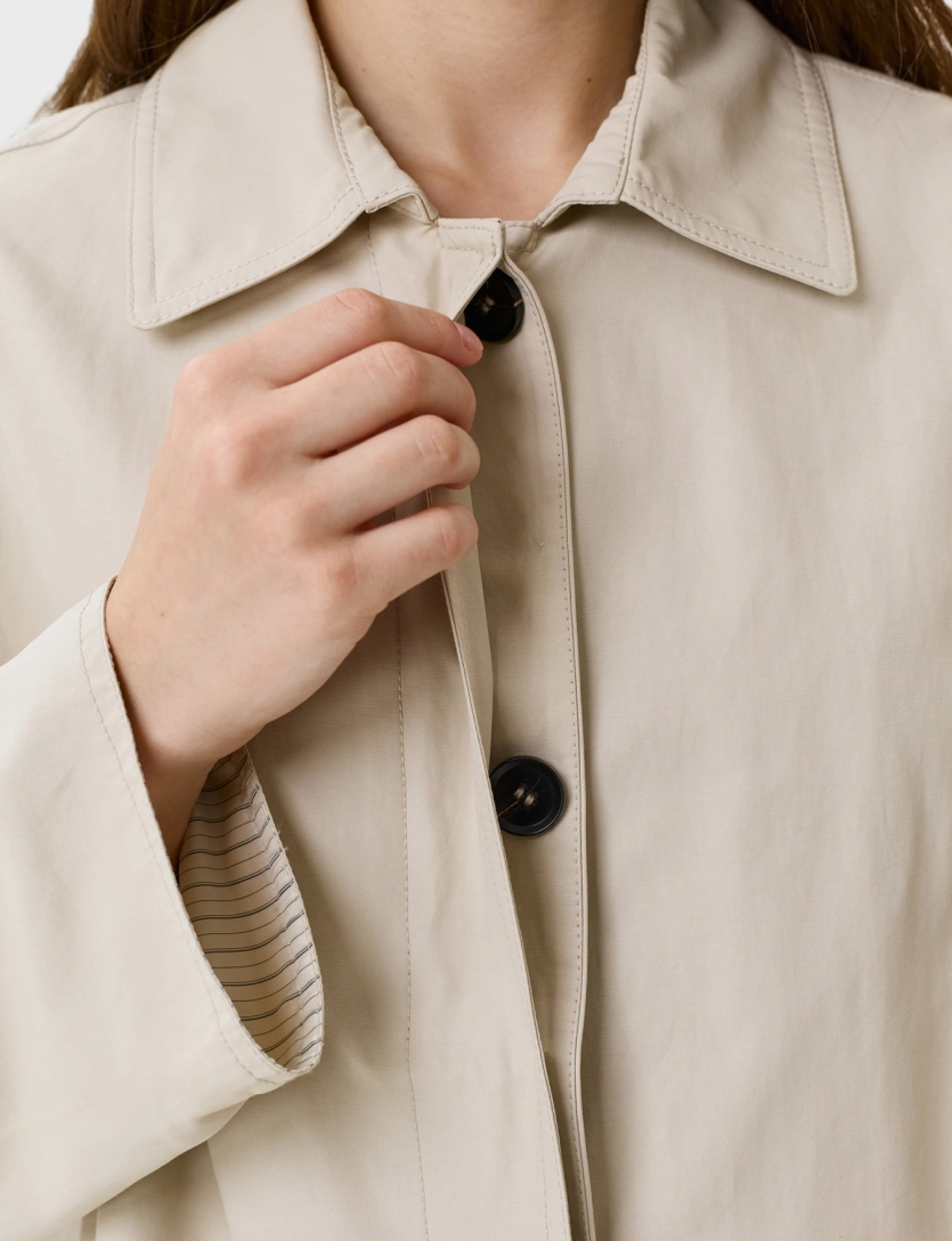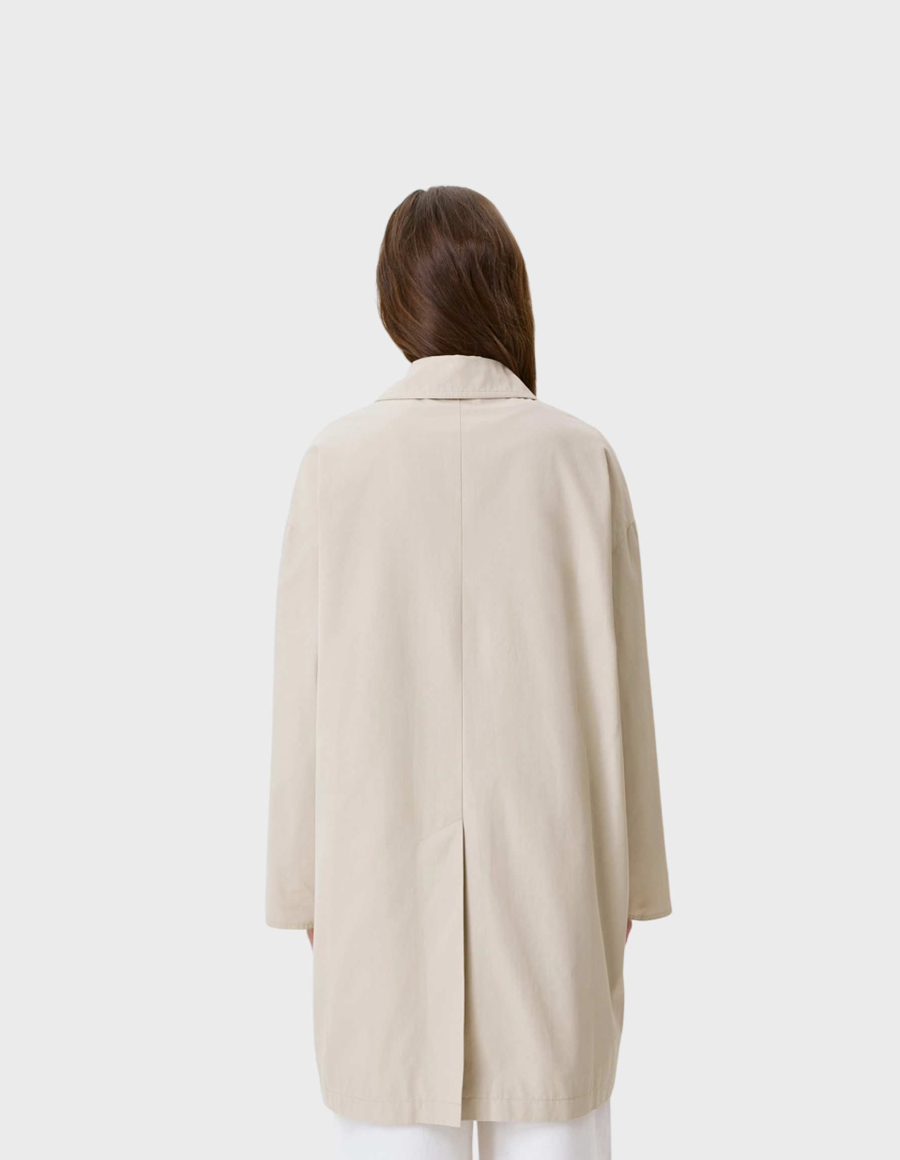 Укороченный плащ из нейлона и хлопка. Свободный силуэт. Отложной воротник. Спущенная линия плеч. Накладные боковые карманы. Супатная застежка. Дополнен принтованной подкладкой.