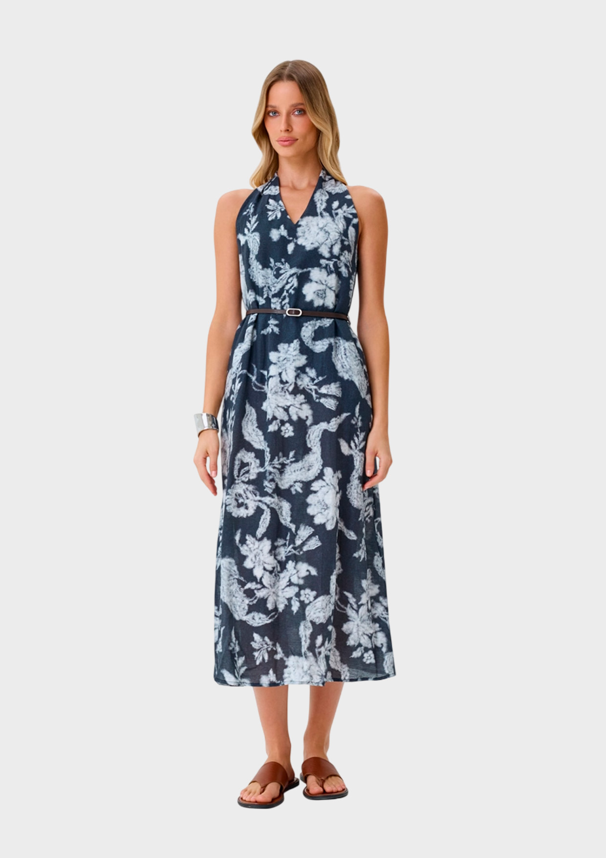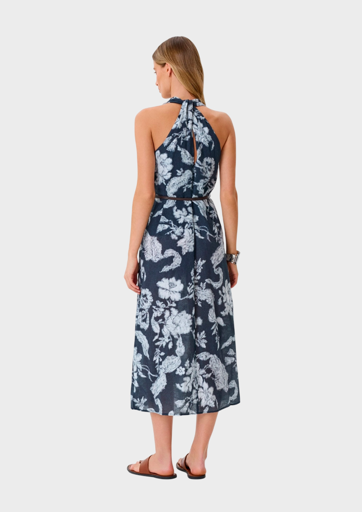 Платье-миди из смесовой вискозы с флоральным принтом. Свободный силуэт можно приталить поясом из эко кожи. Вырез халтер с защипами по спинке. Боковые карманы в швах. Подкладка из 100% хлопка.
