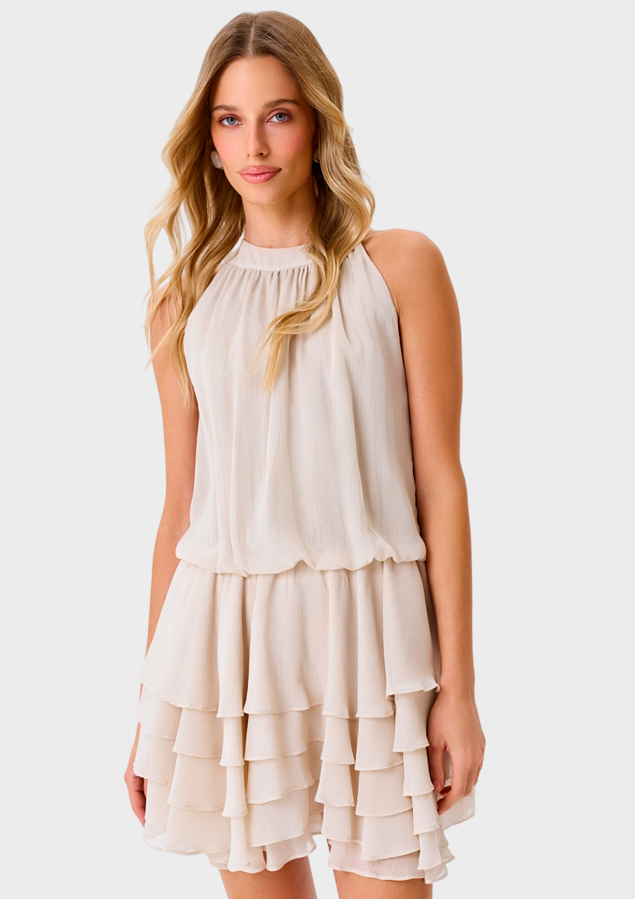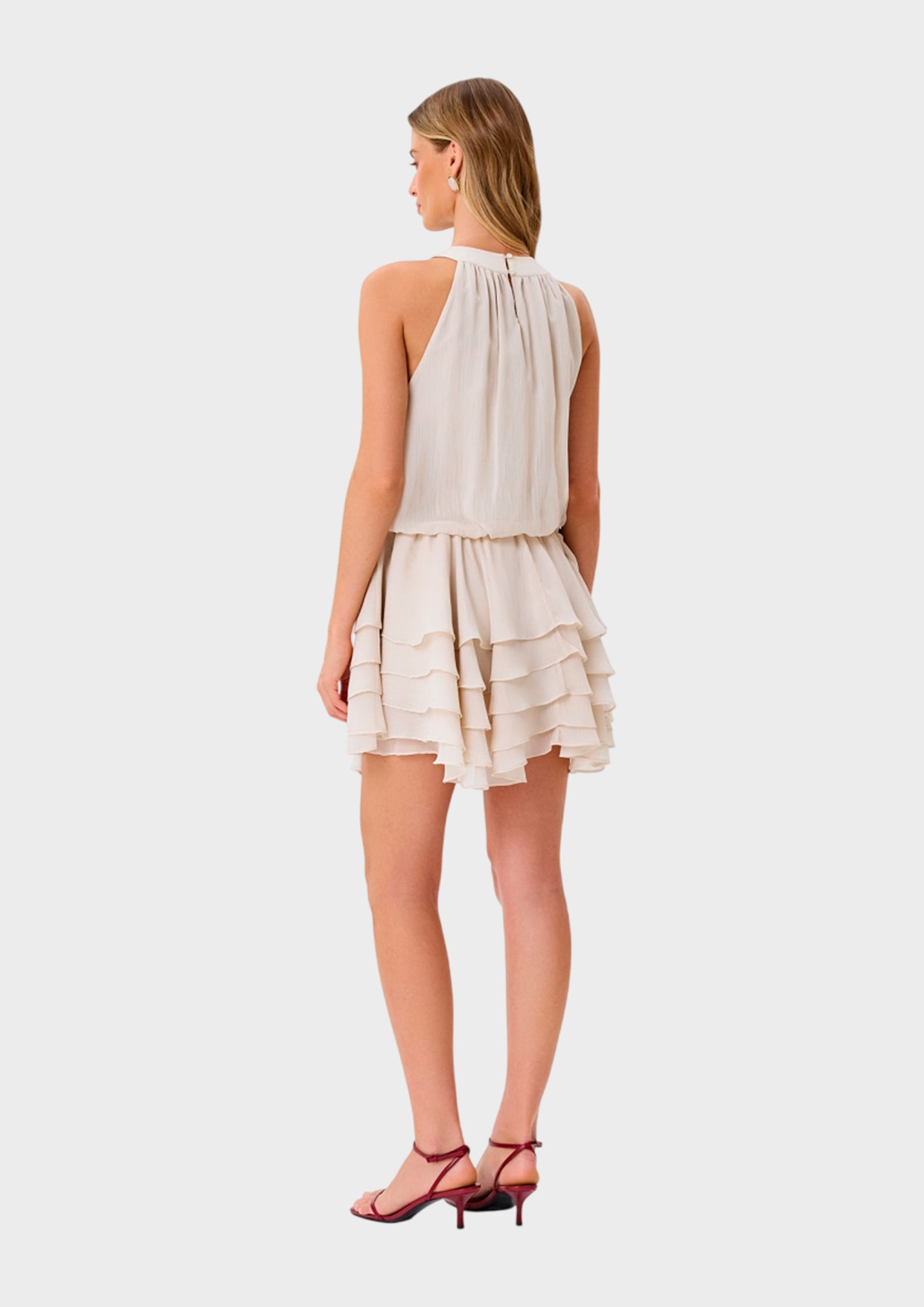 Романтичное платье-мини с ярусами воланов. Свободный силуэт. Застежка на пуговицу. Вырез халтер. Резинка и напуск по линии талии. Подкладка из смесовой вискозы.