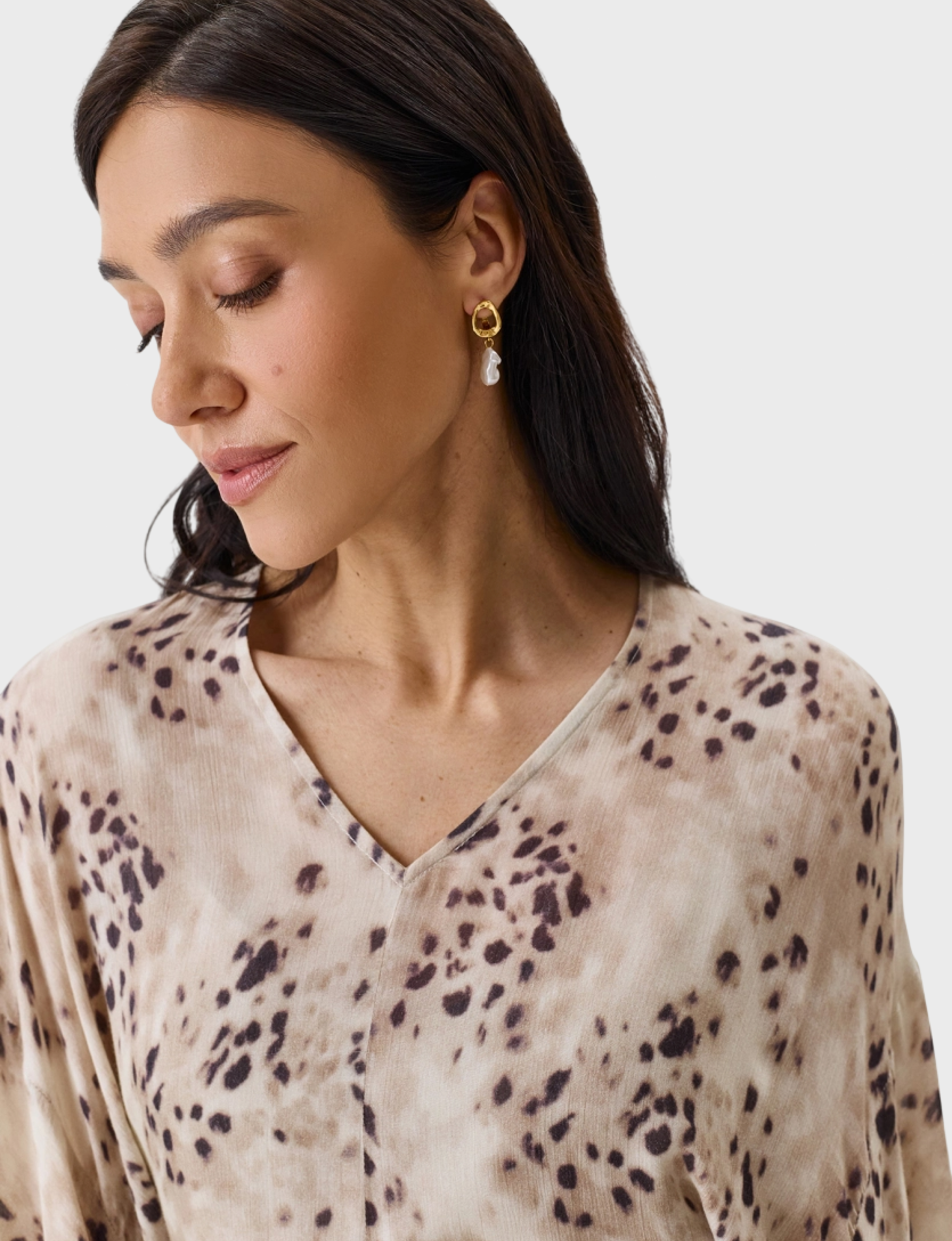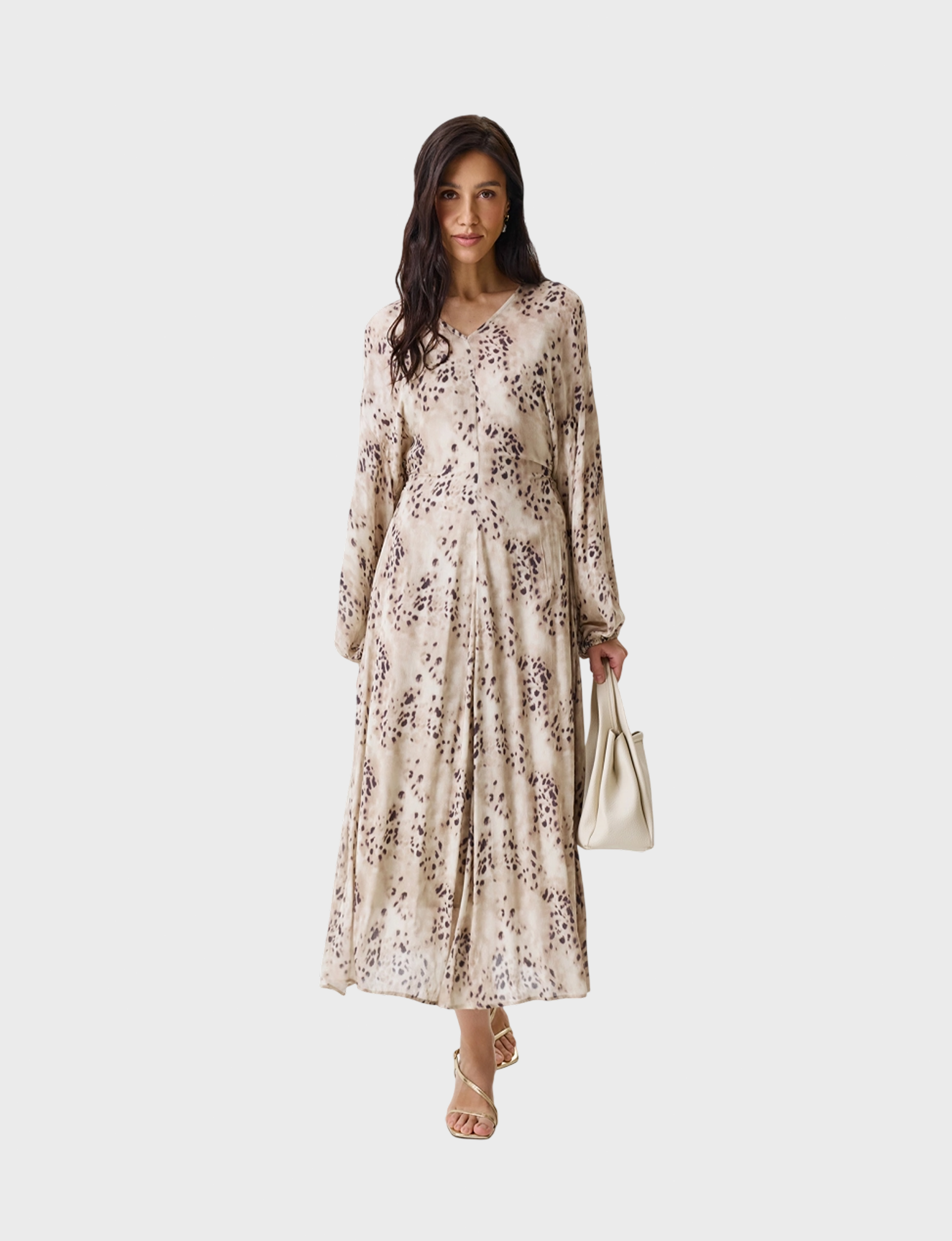 Летящее полупрозрачное платье-макси с нежным принтом. Полуприталенный силуэт. V-образный вырез. Спущенная линия плеч. Длинные объемные рукава с резинкой по низу. Дополнено драпировкой по линии талии. В составе 100% район.