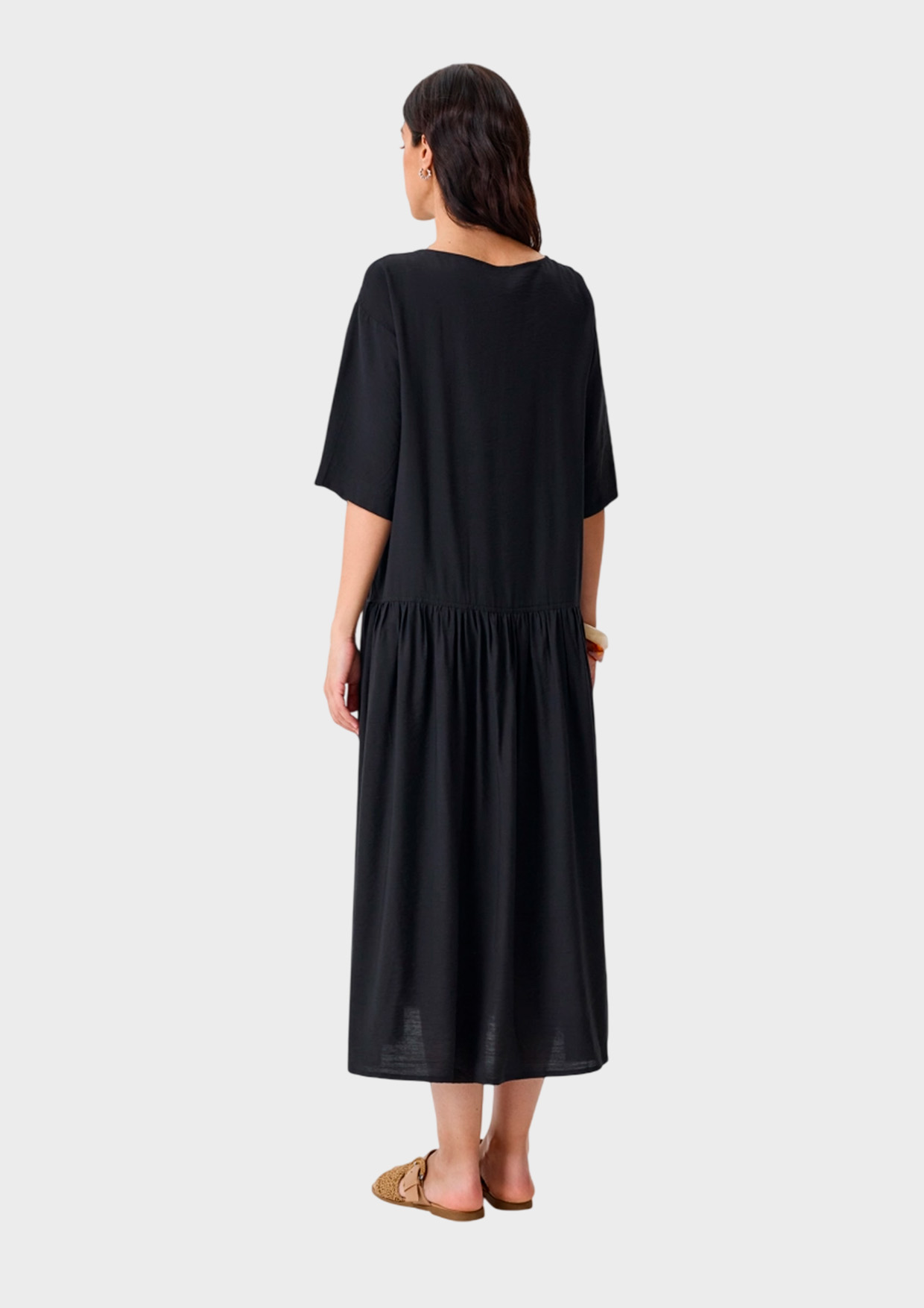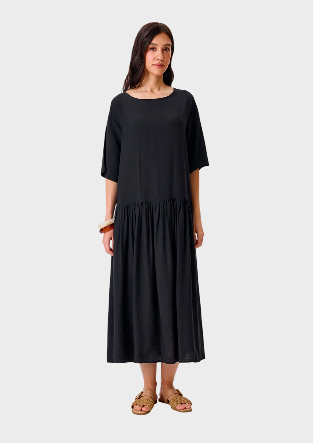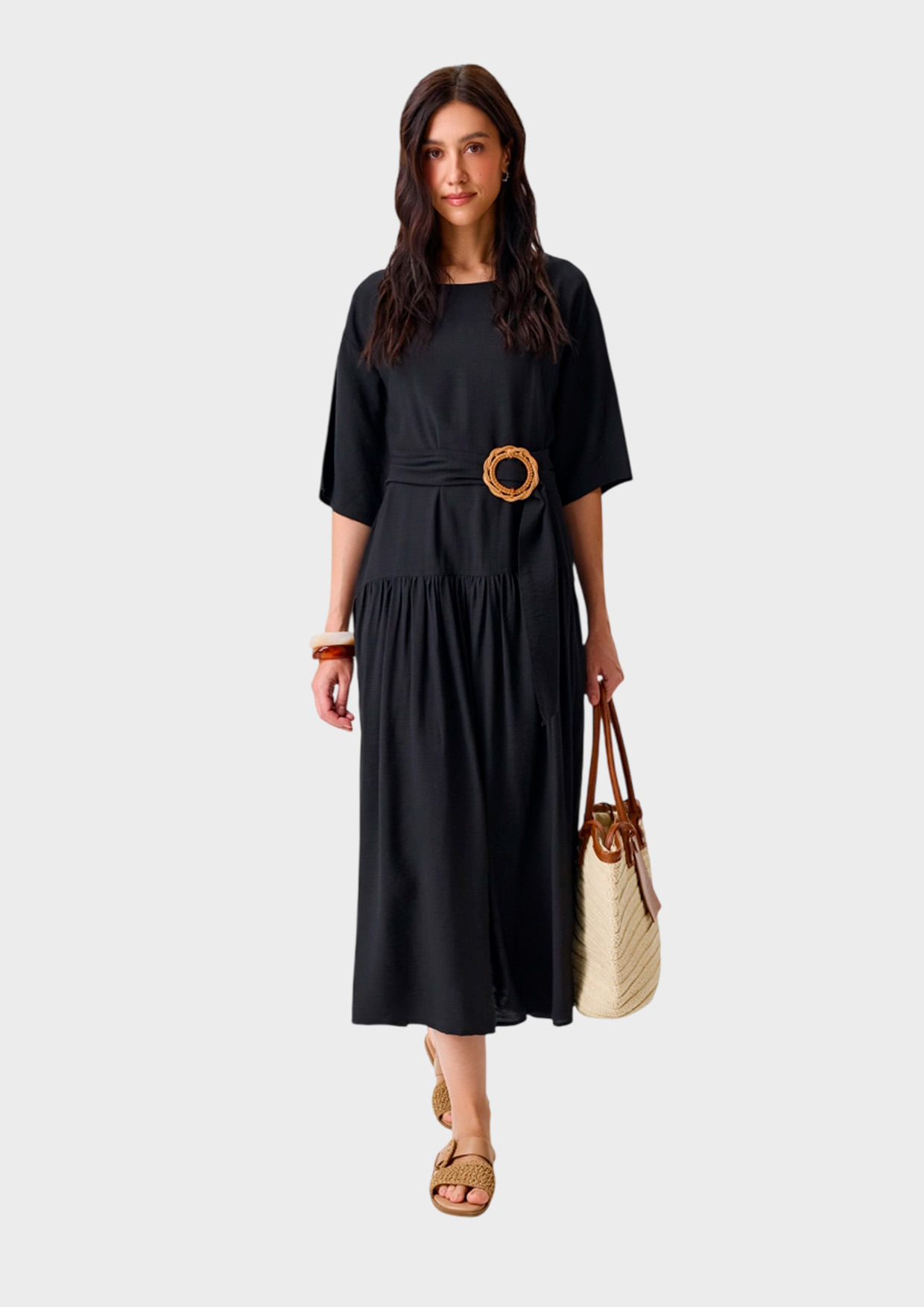 Платье-миди из хлопка и тенселя. Свободный силуэт можно приталить широким текстильным поясом с акцентной пряжкой. Глубокий круглый вырез. Дополнено широкими укороченными рукавами. Спущенная линия плеч. Юбка А-силуэта с подрезом и сборкой.