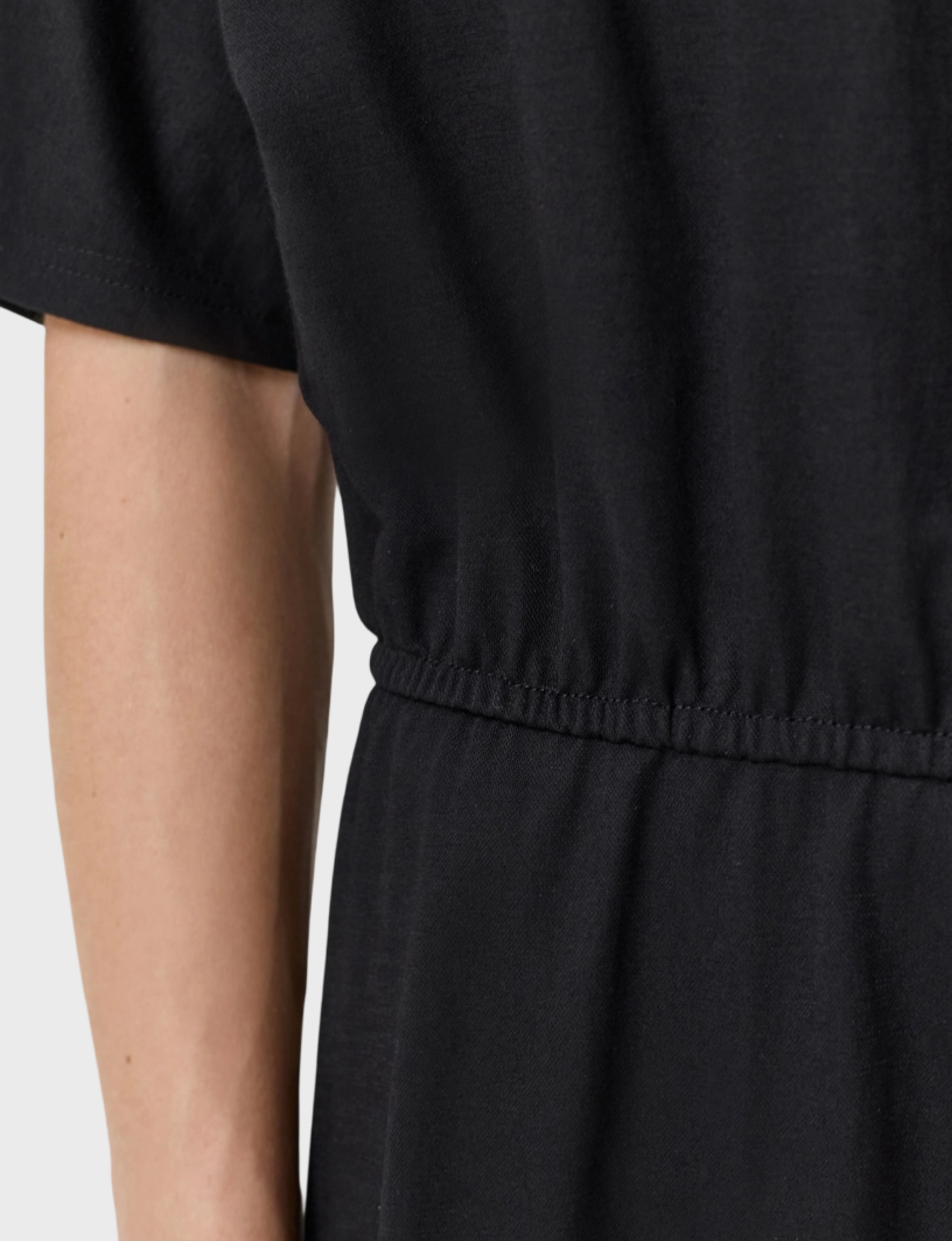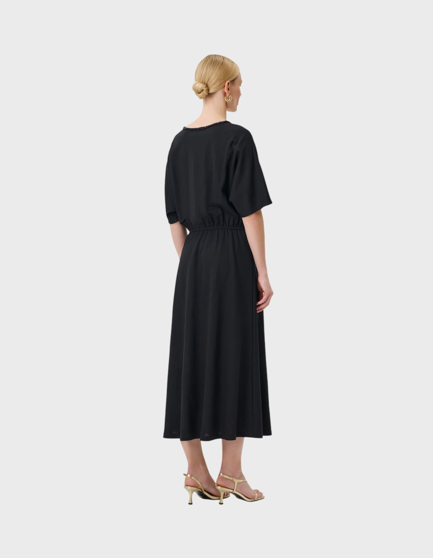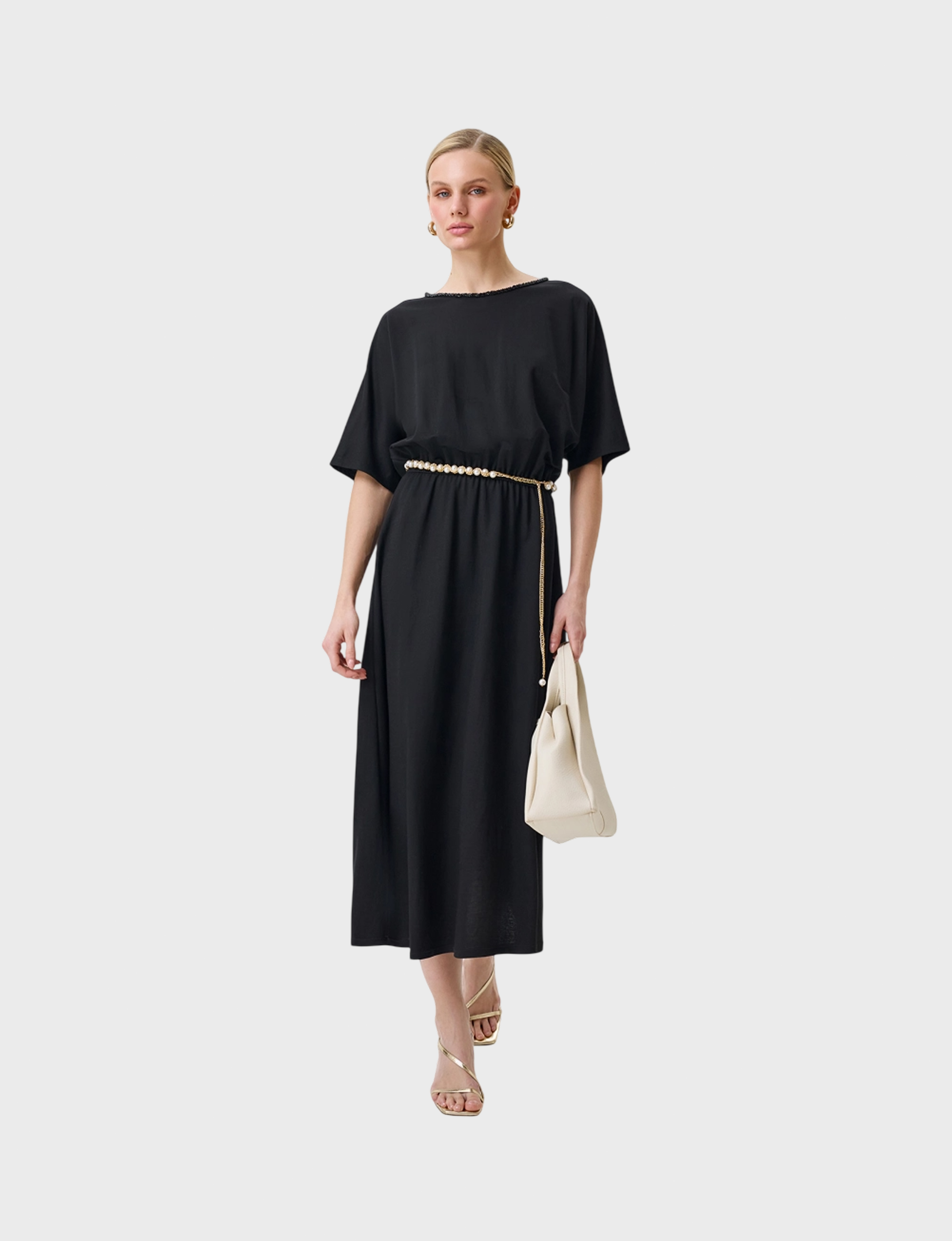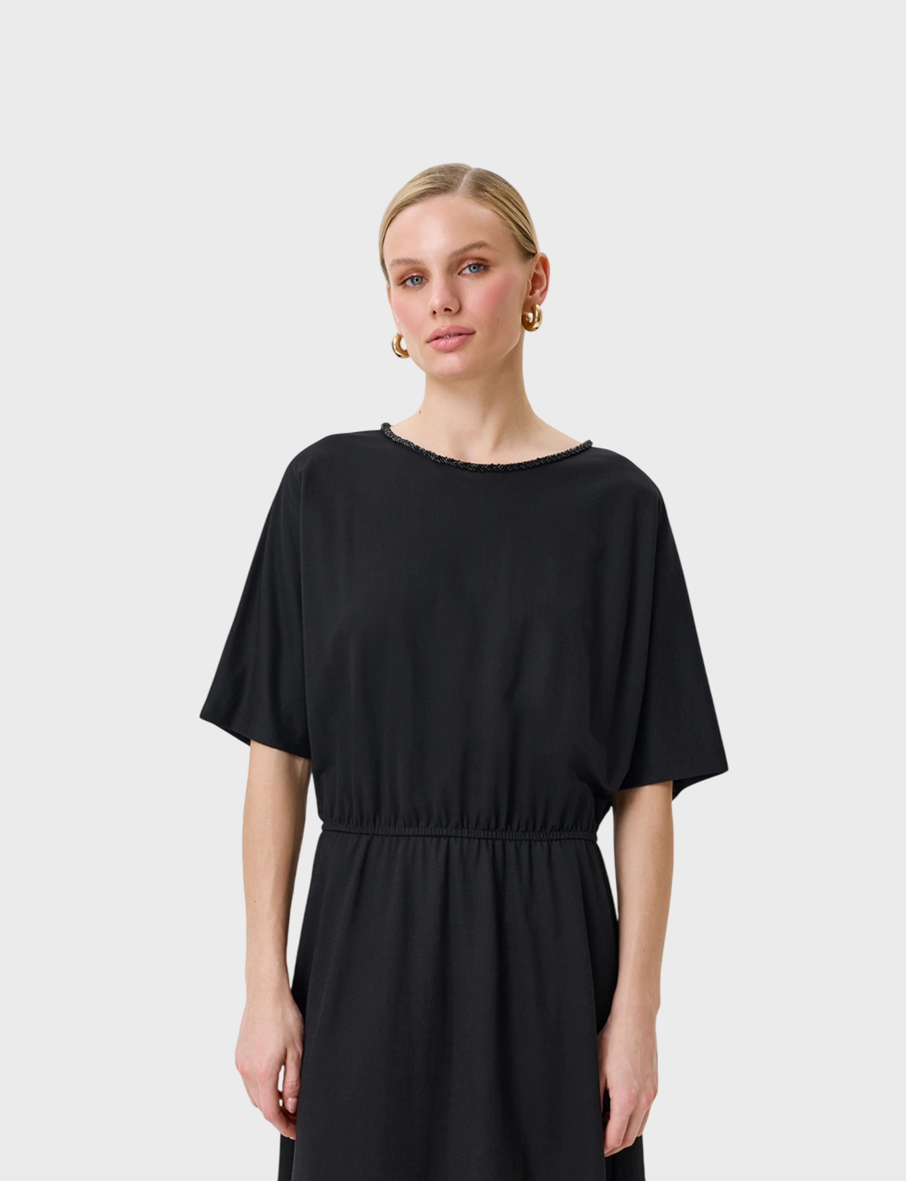 Свободное платье миди из смесового района. Вырез лодочка с отделкой сияющим бисером. Цельнокроеные укороченные рукава. Резинка по линии талии позволяет менять посадку. Линия плеч немного спущена.