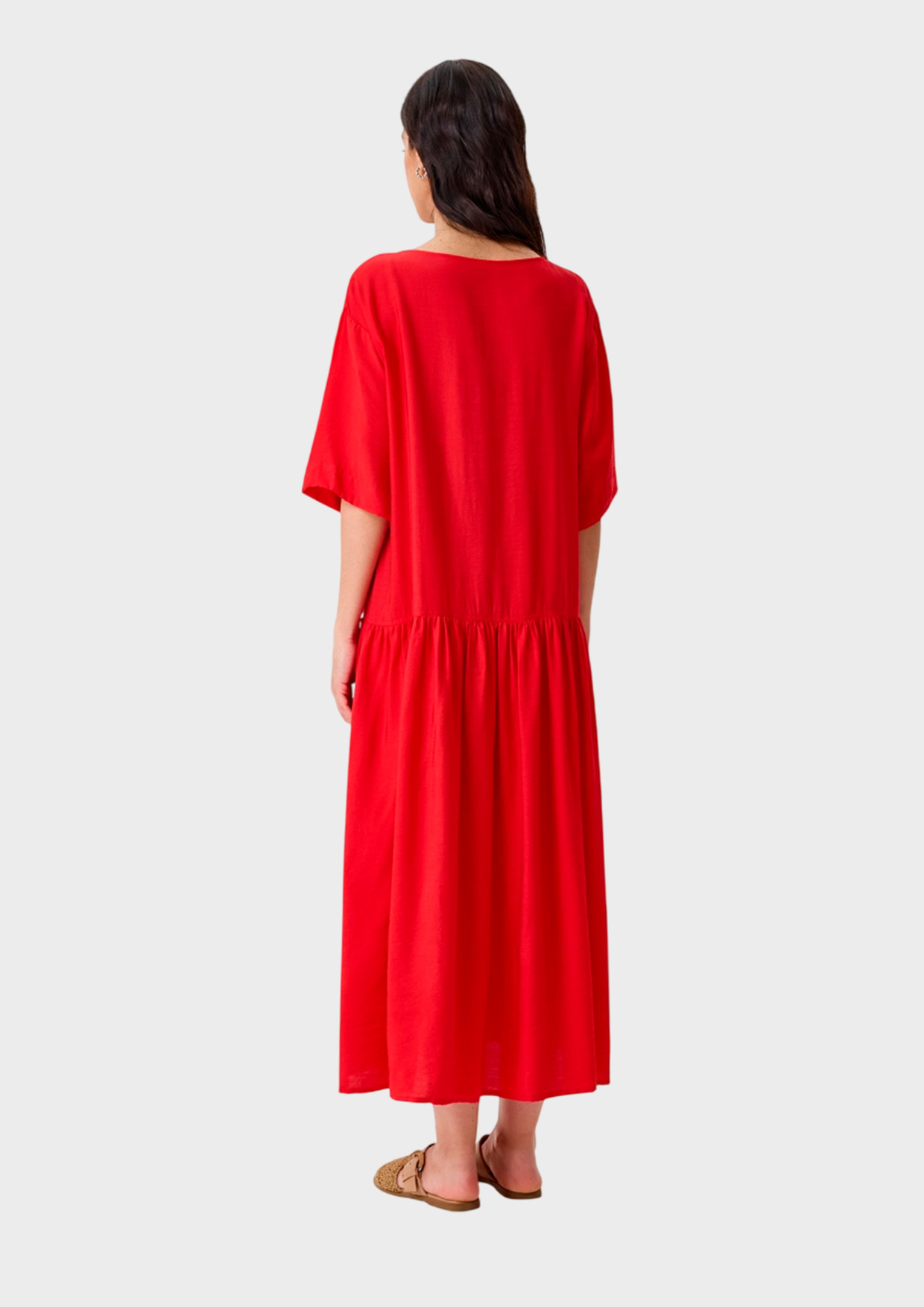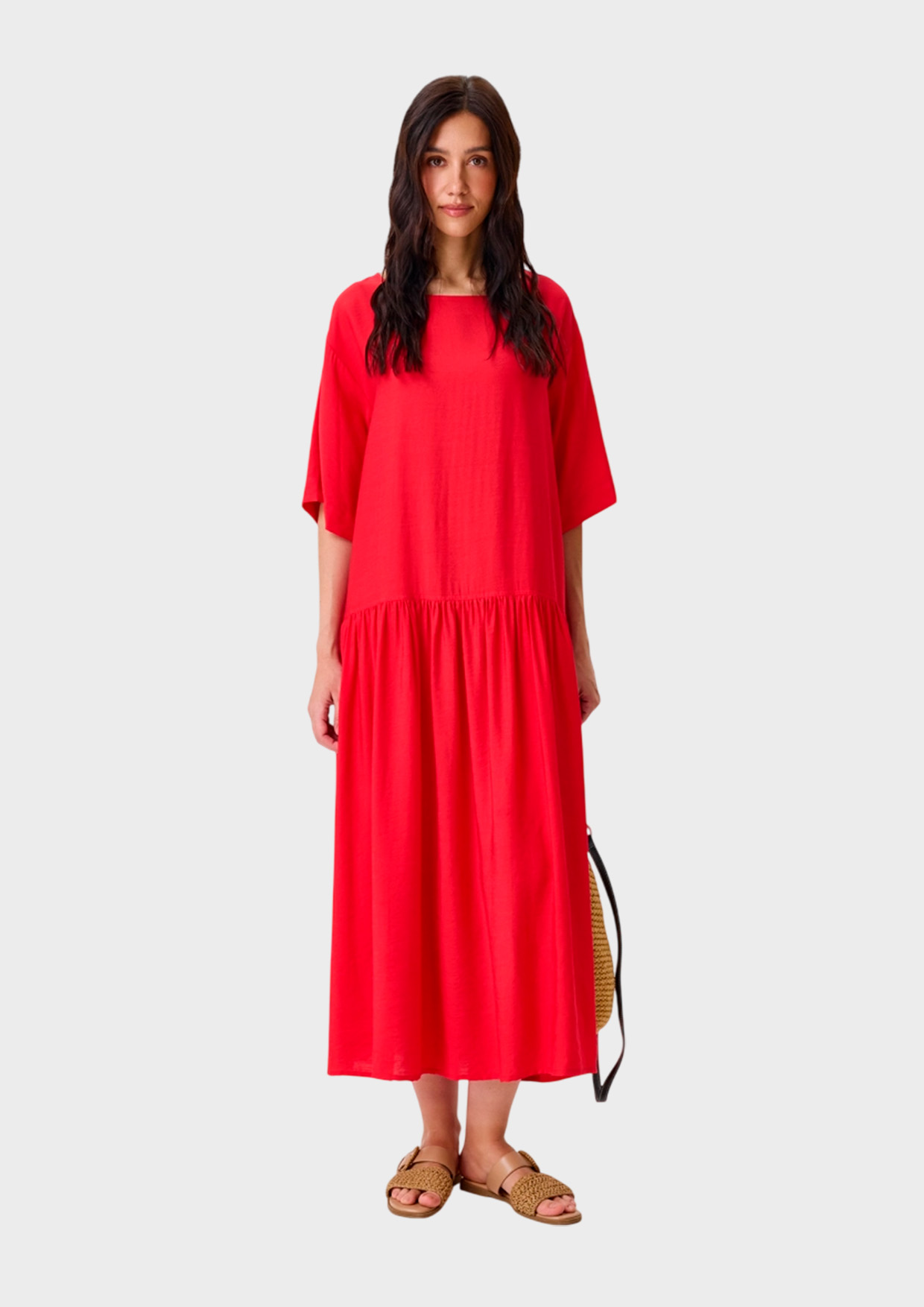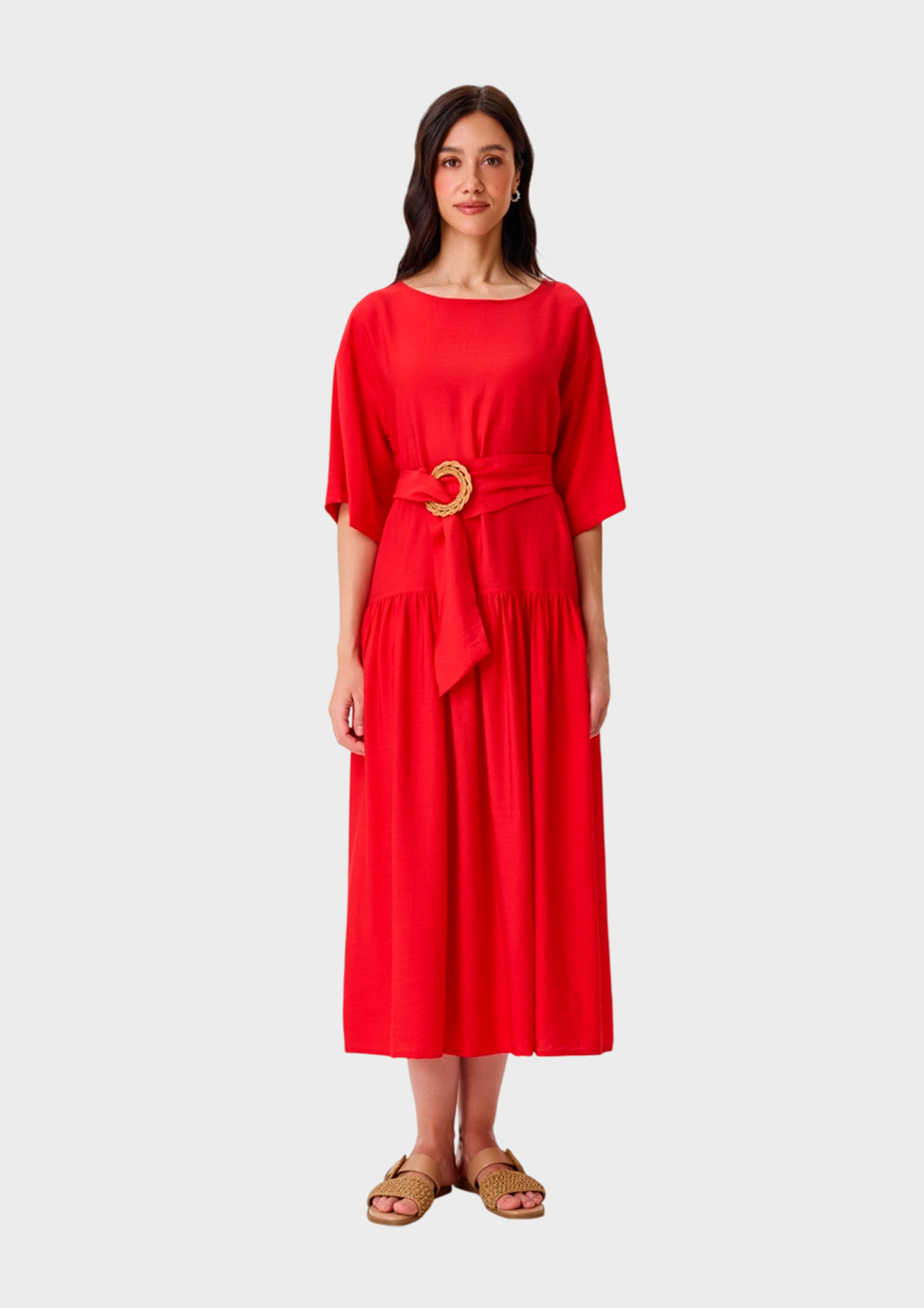 Платье-миди из хлопка и тенселя. Свободный силуэт можно приталить широким текстильным поясом с акцентной пряжкой. Глубокий круглый вырез. Дополнено широкими укороченными рукавами. Спущенная линия плеч. Юбка А-силуэта с подрезом и сборкой.