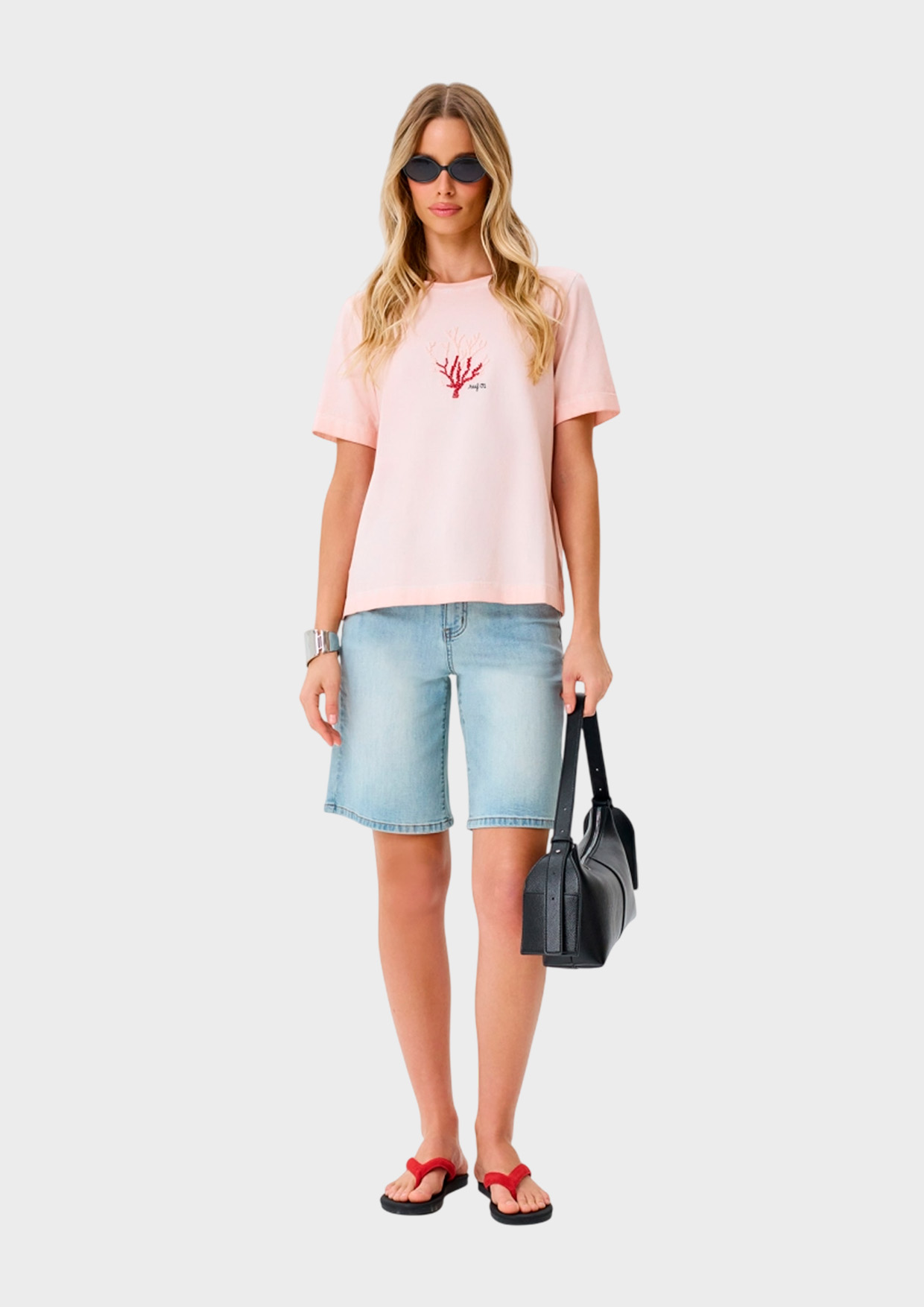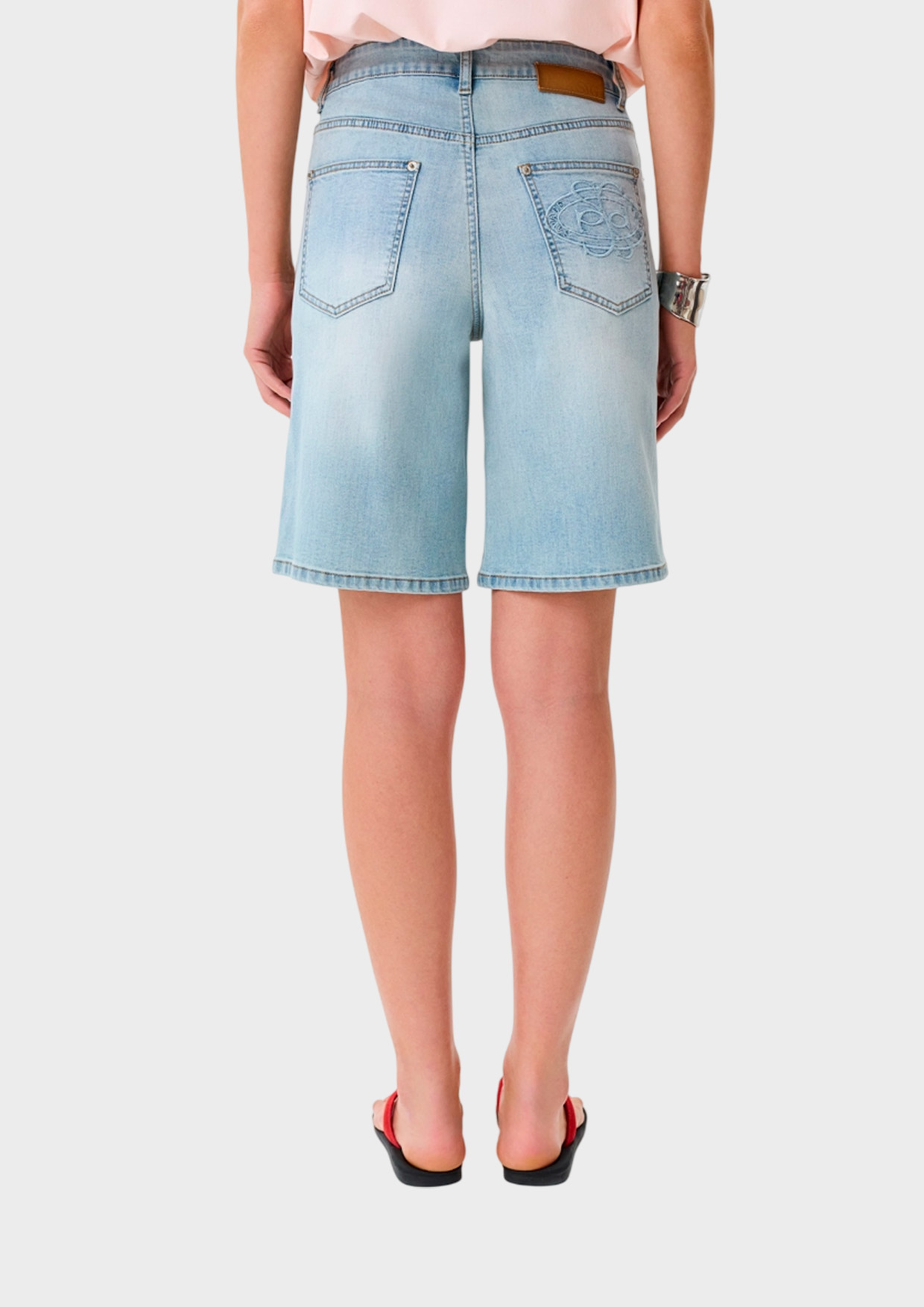 Джинсовые шорты бермуды прямого силуэта. Застежка на молнию и металлическую пуговицу. Дополнены вышивкой в цвет на заднем кармане. В составе спандекс.