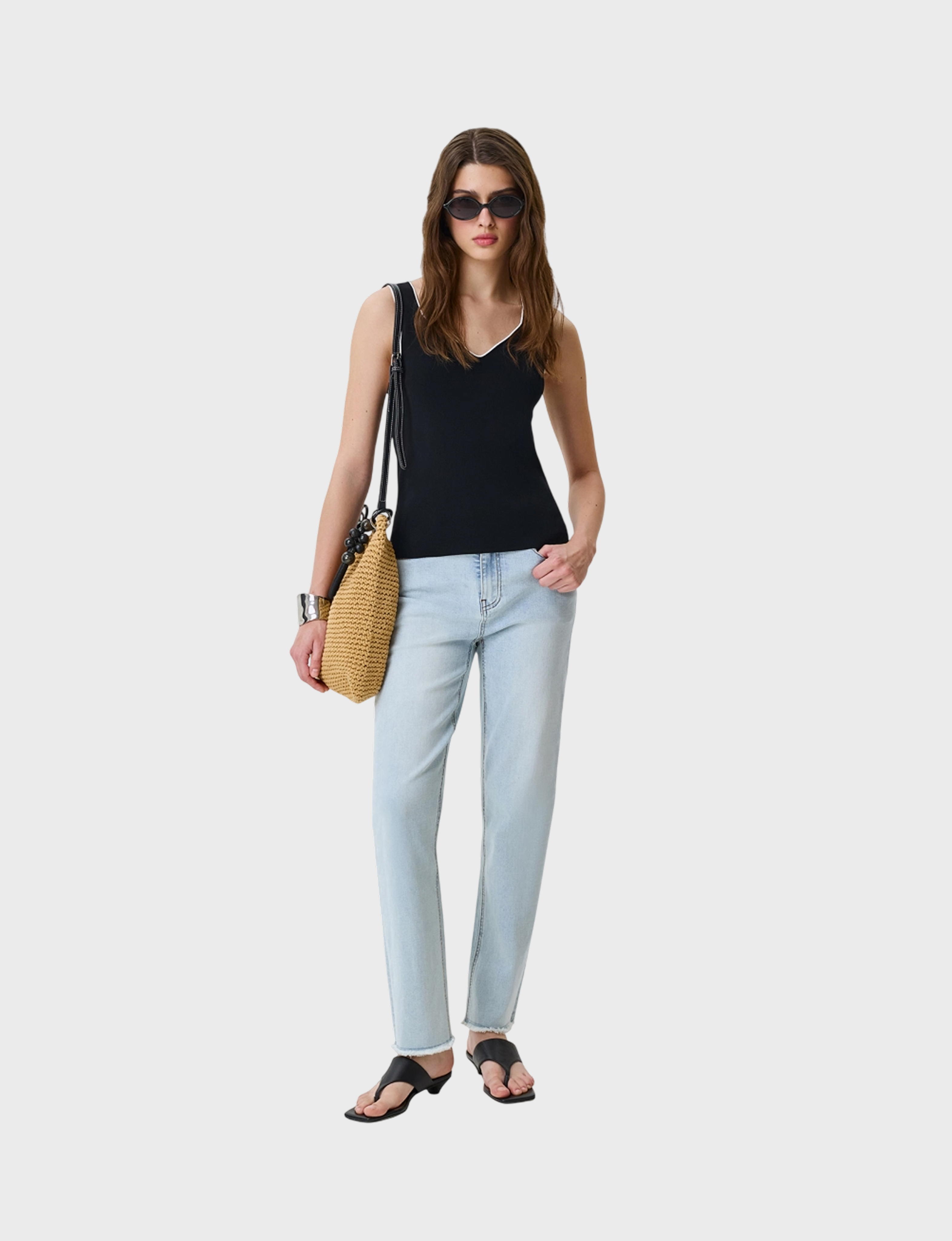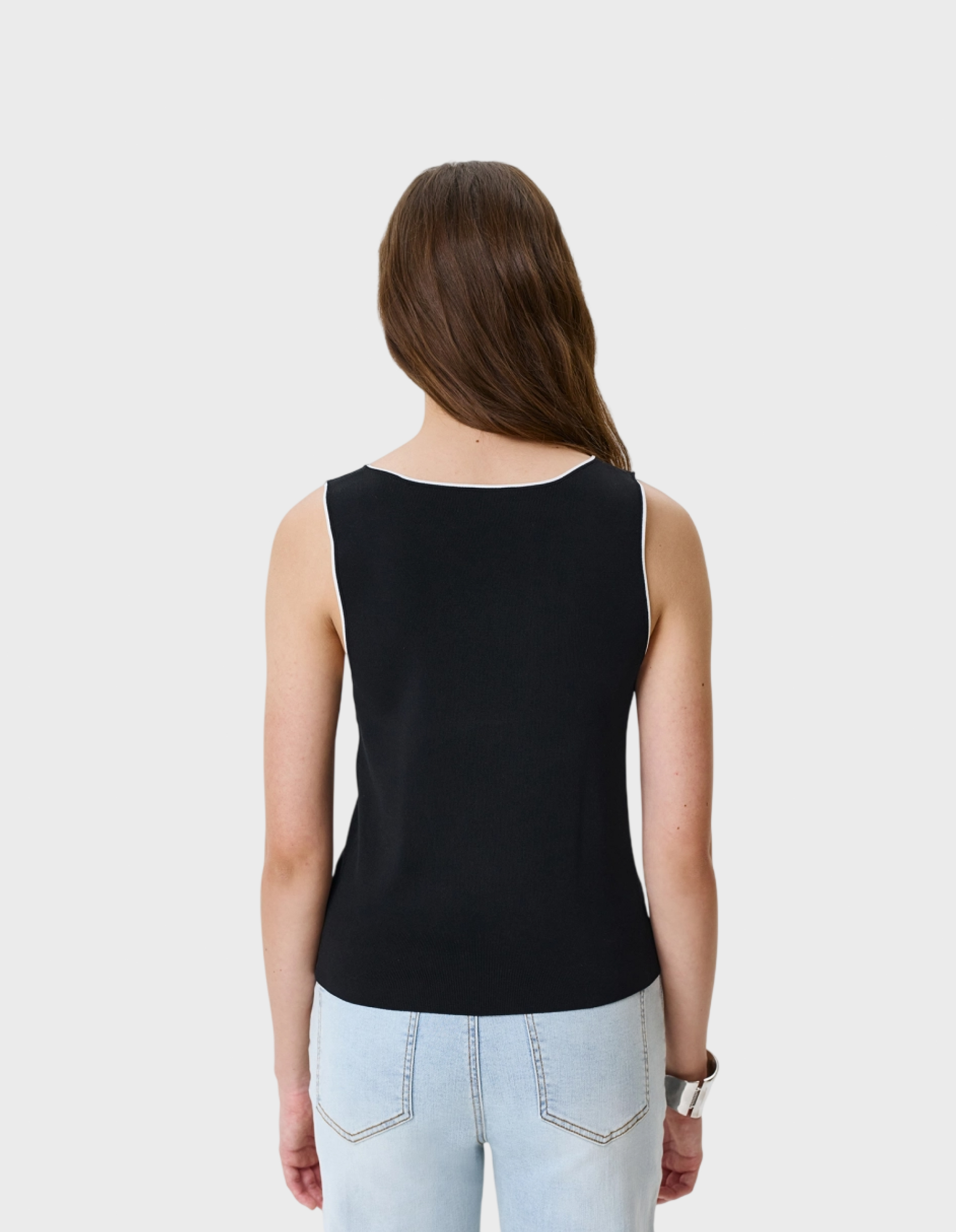 Вязаный топ из вискозы. Прямой силуэт. V-образный вырез с широкими бретелями. Дополнен контрастным кантом по линии горловины и проймы.