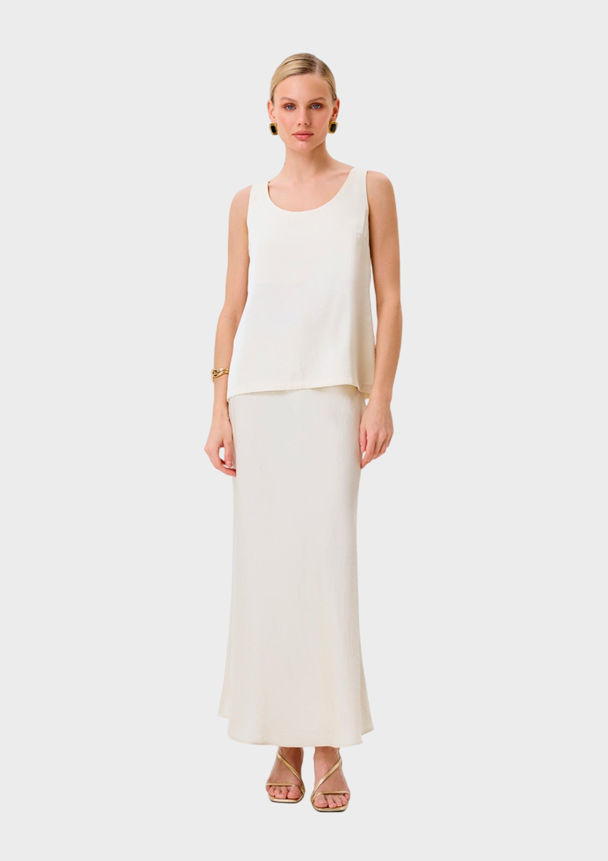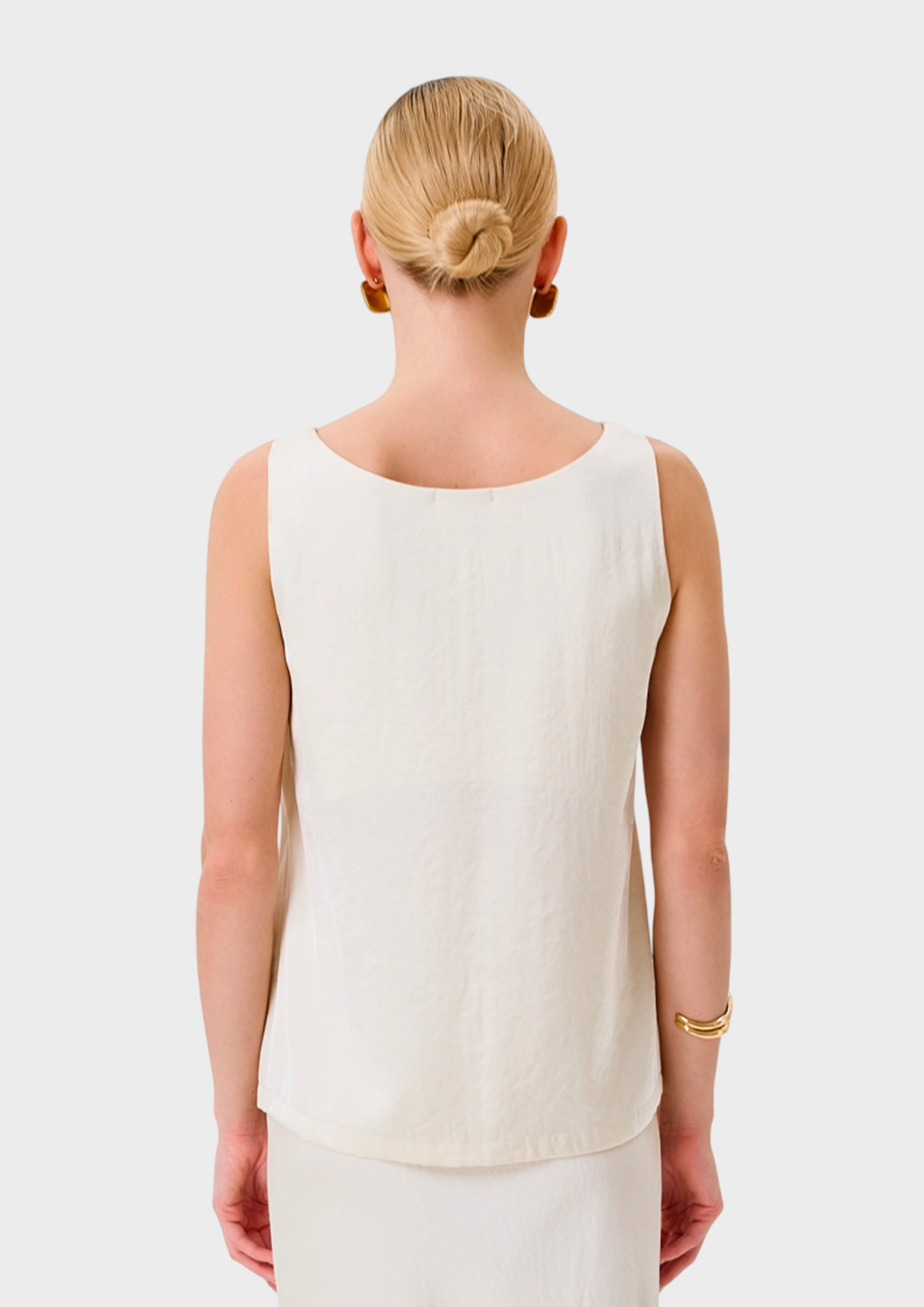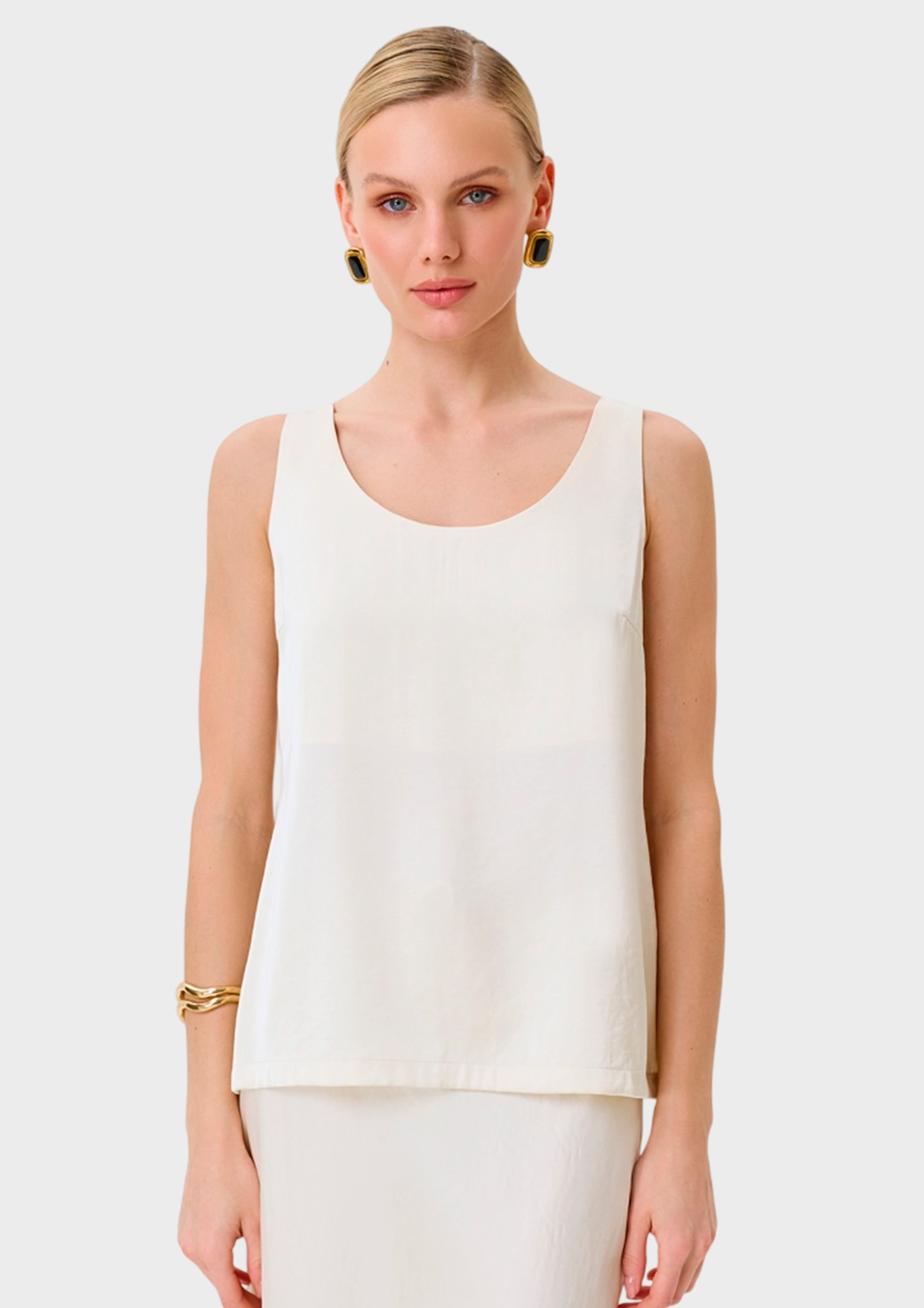 Свободный сатиновый топ из смесовой вискозы. Широкие бретели. Круглый вырез.