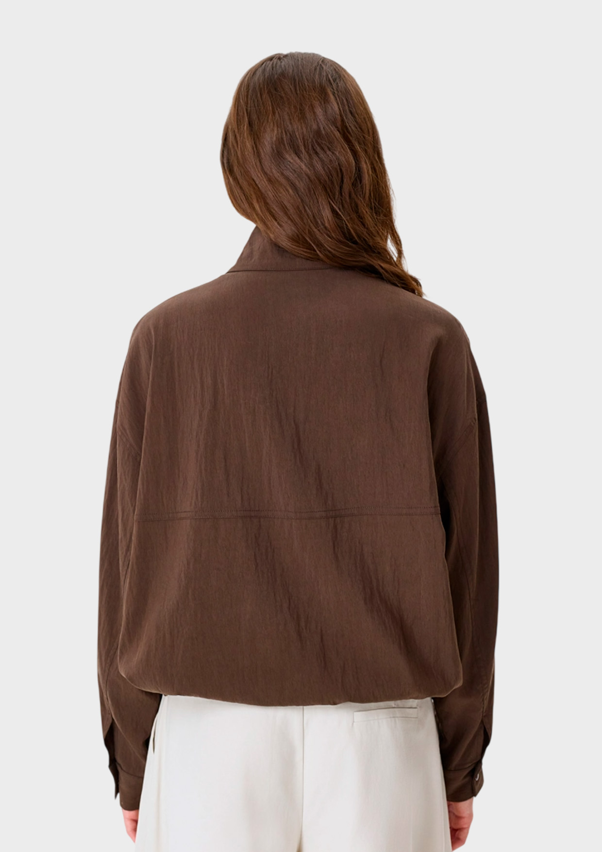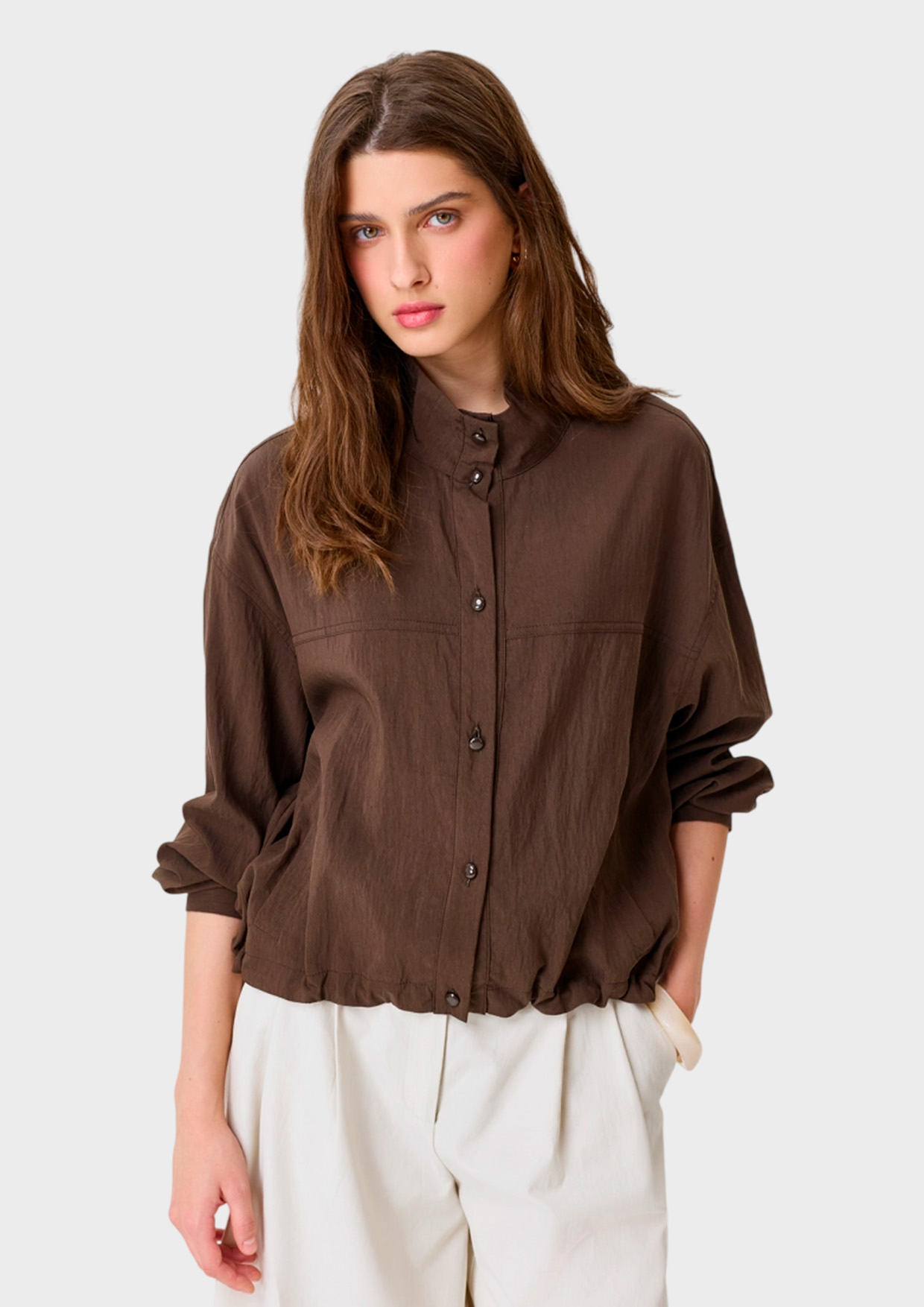 Жакет свободного силуэта из смесового тенселя с нейлоном. Воротник стойка. Спущенная линия плеч. Длинные рукава с манжетами на пуговицах по низу. Застежка на пуговицы. Боковые карманы с листочками. Кулиса по низу изделия.