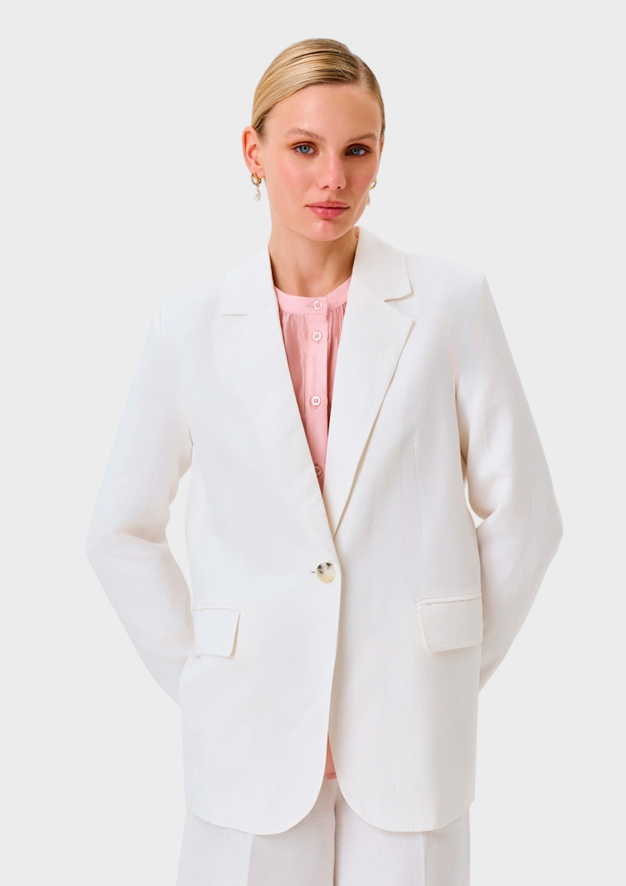 Однобортный жакет из смесового льна. Полуприталенный силуэт. Классический английский воротник. Боковые карманы с клапанами. Подкладка из смесовой вискозы.
