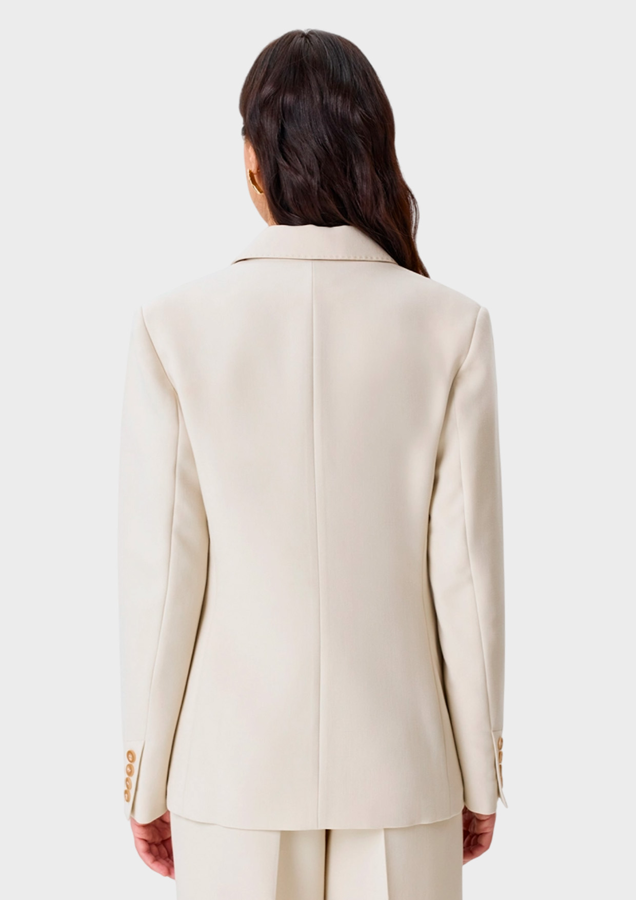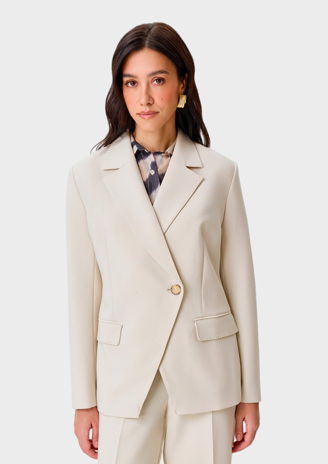 Асимметричный однобортный жакет полуприталенного силуэта. Классический английский воротник. Боковые карманы с клапанами. Дополнен имитацией ручного стежка. Застежка на пуговицу. В составе вискоза.