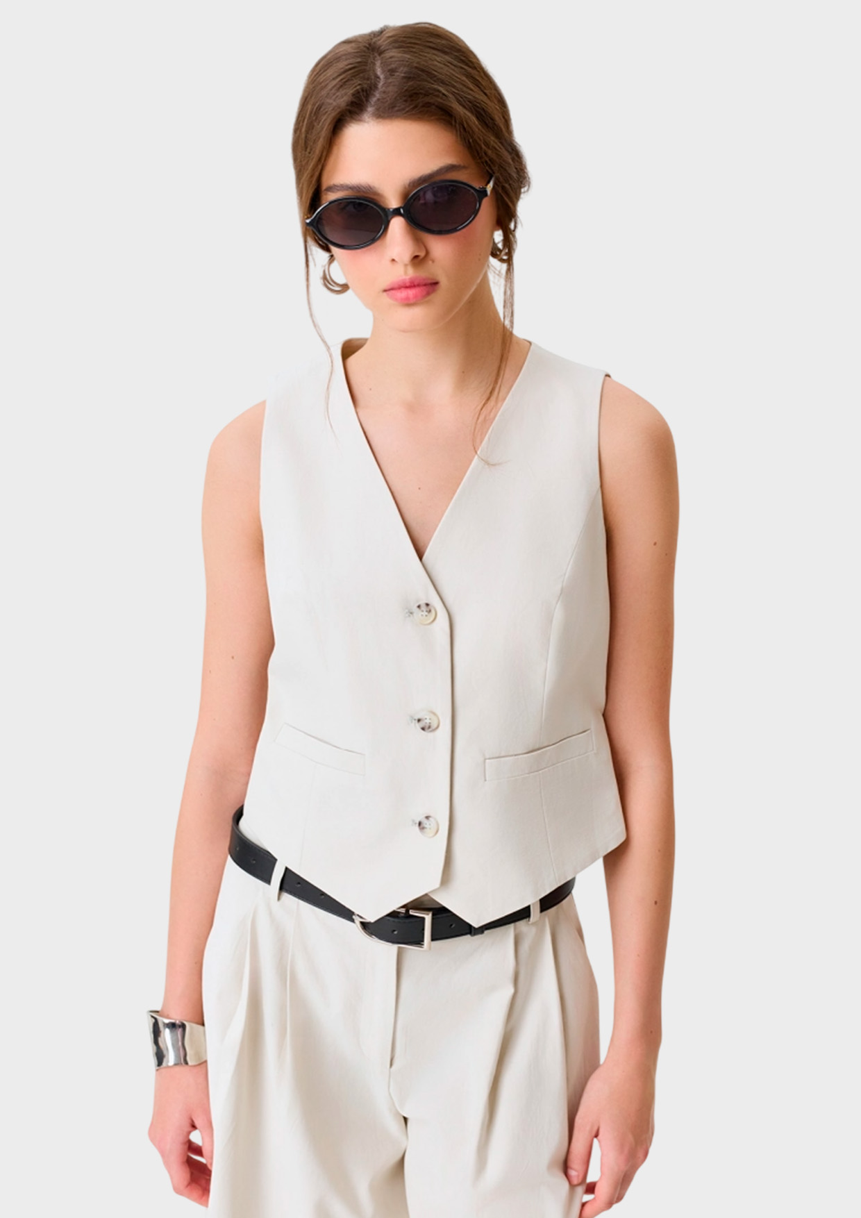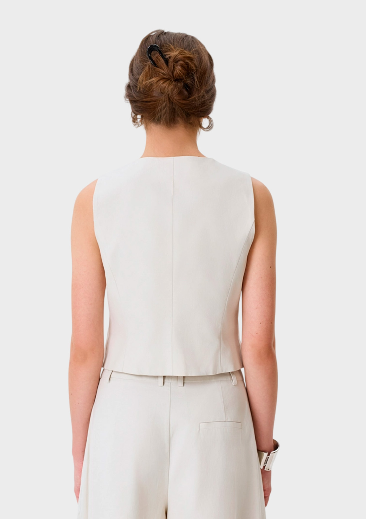 Классический жилет из лиоцелла и хлопка. Полуприталенный силуэт. V-образный вырез. Застежка на роговые пуговицы. Имитация боковых карманов с листочками.