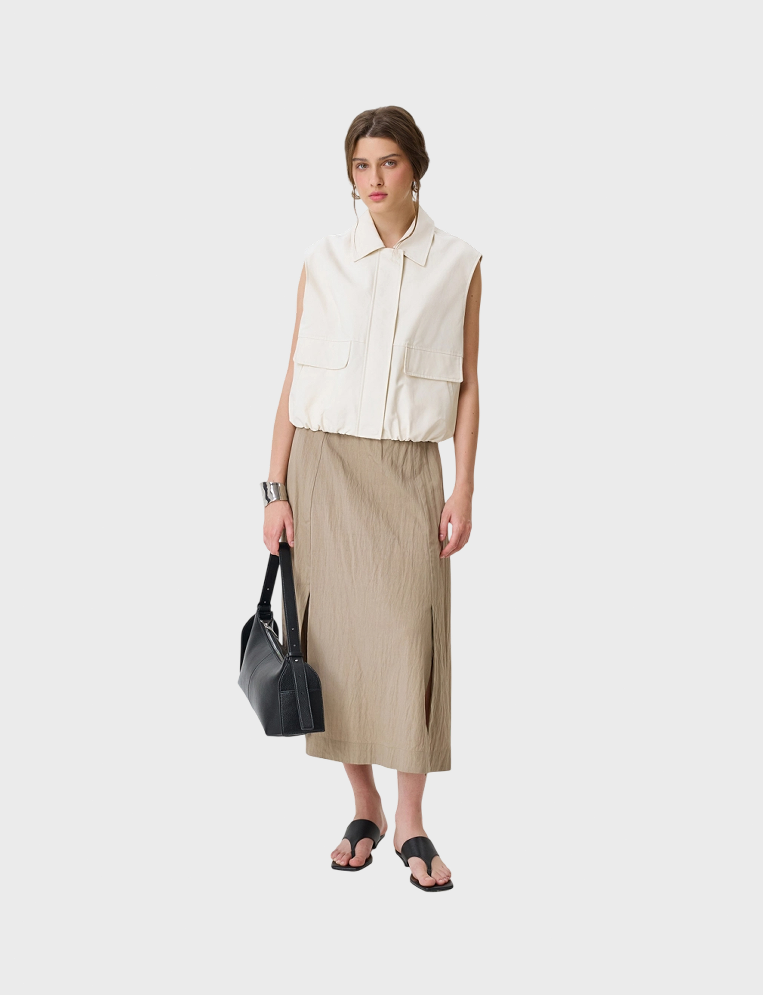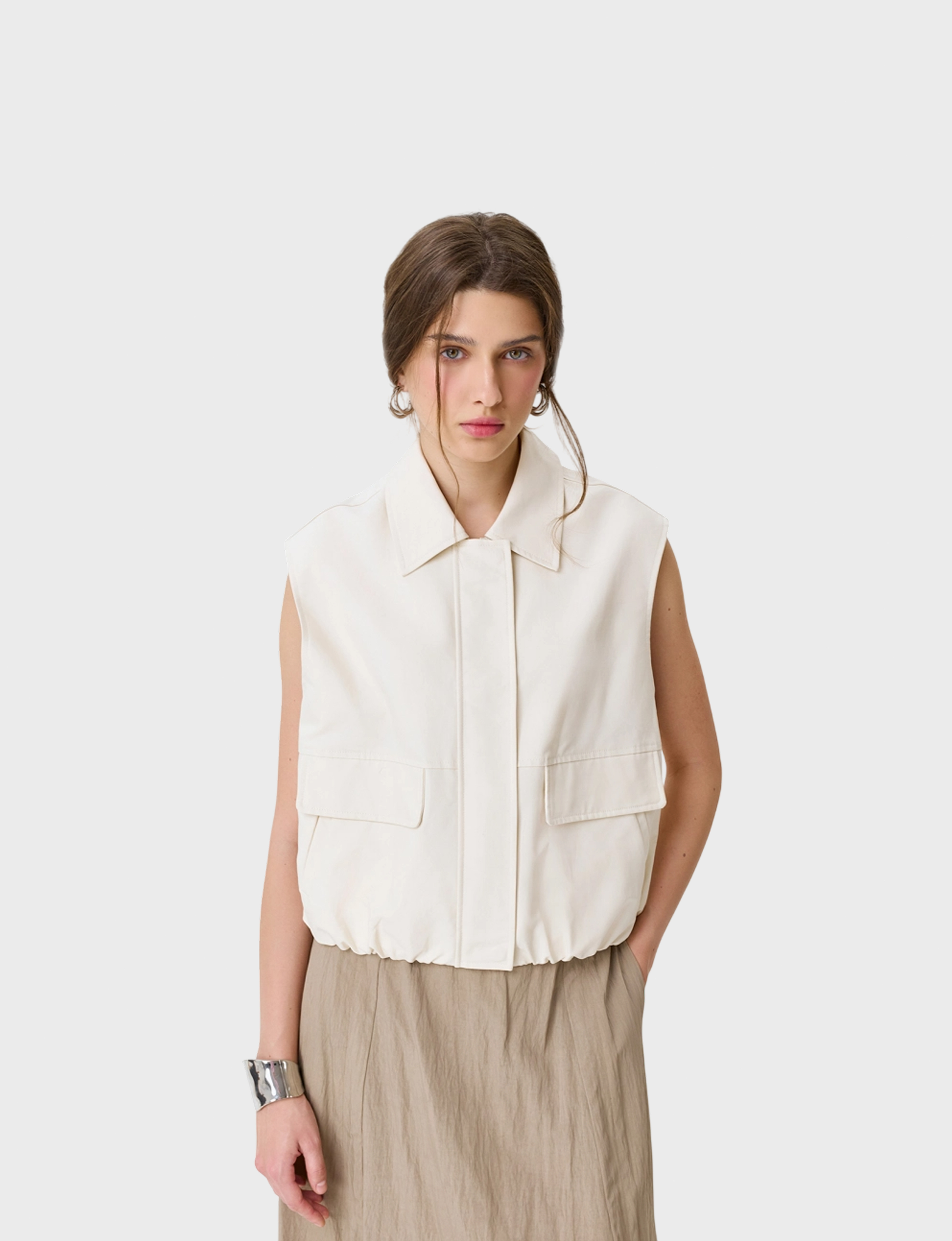 Свободный жилет из 100% хлопка. Отложной воротник. Застежка на кнопки. Боковые карманы с клапанами и боковым входом. Дополнен резинкой по низу изделия.