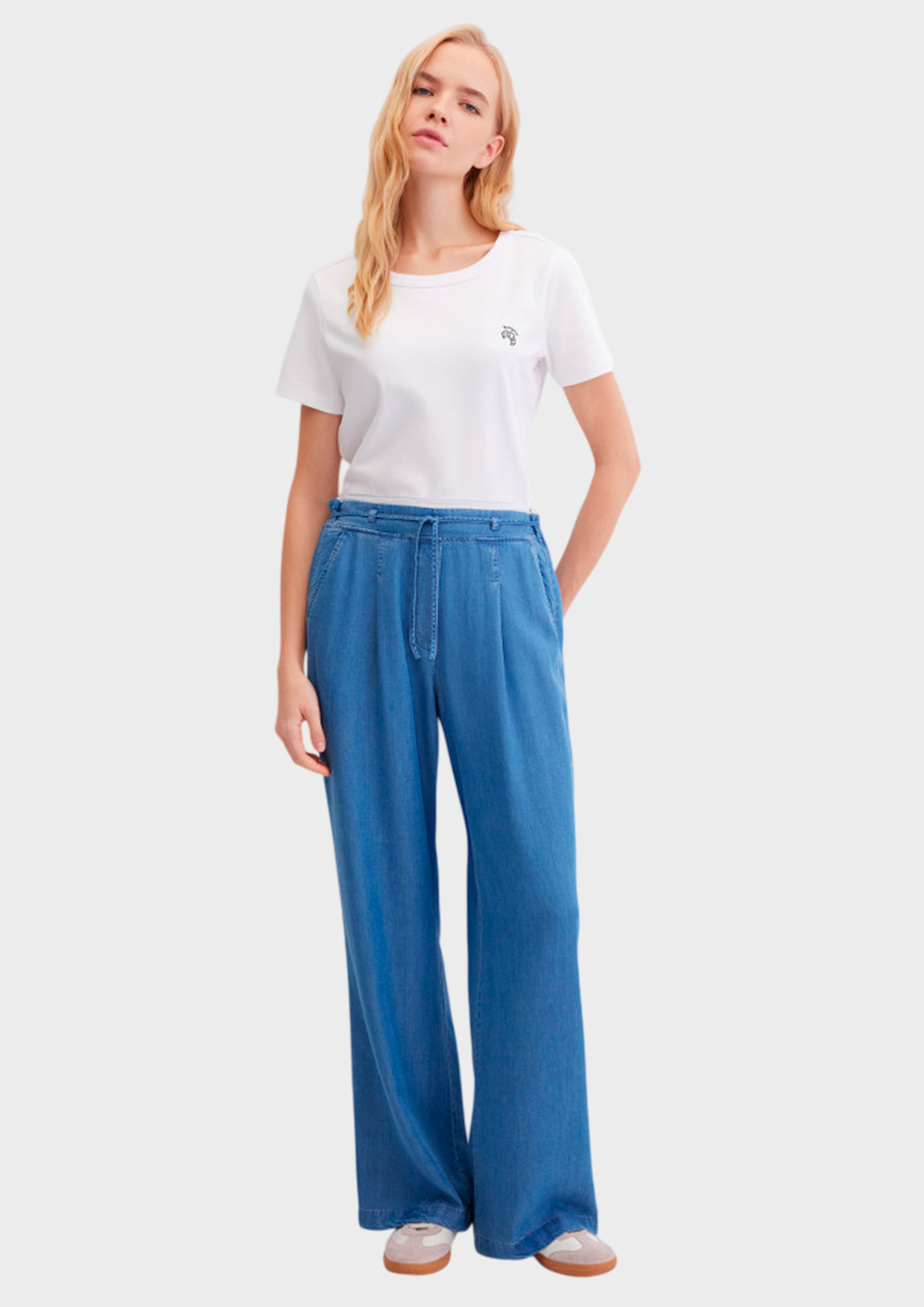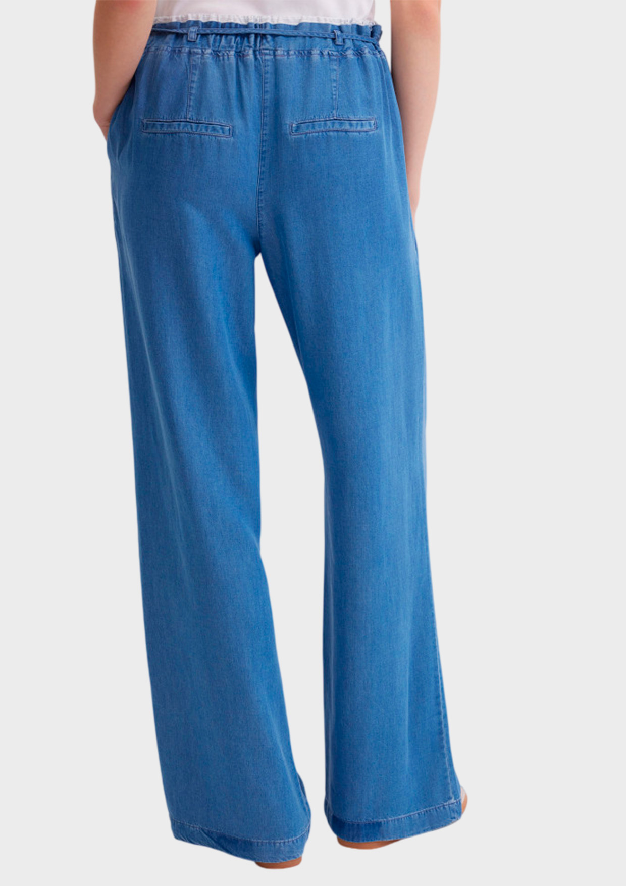 Широкие свободные брюки из стопроцентного лиоцелла под деним создают лёгкий струящийся силуэт. Лиоцелл тактильно приятный, гладкий, дышащий, красиво драпируется. Средняя посадка, двойной эластичный пояс с контрастной отделкой и застроченные сверху защипы обеспечивают удобное прилегание по талии и бедрам. Дополнительный тонкий пояс-завязка подчёркивает линию талии и позволяет регулировать посадку.