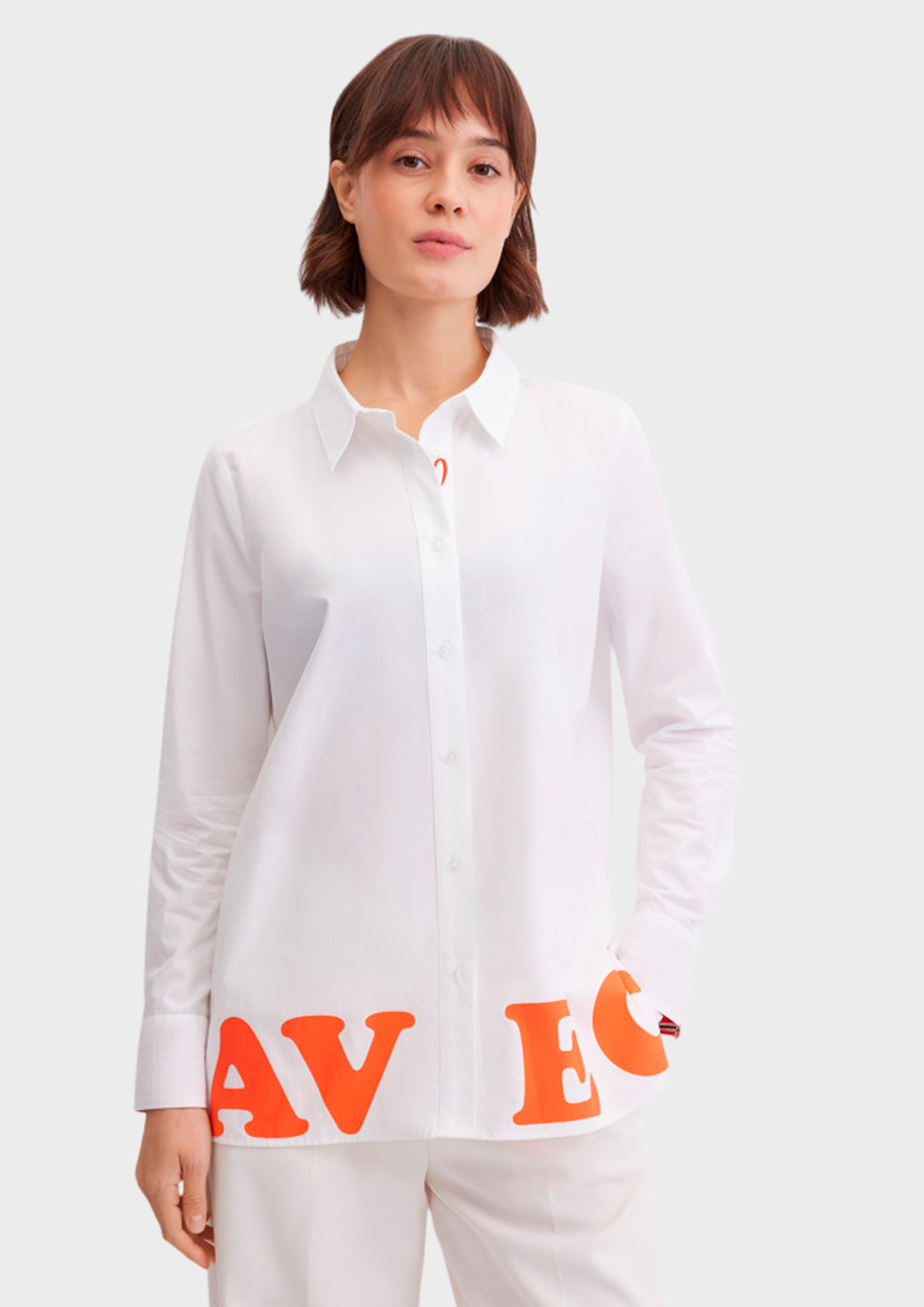 Удлинённая блузка прямого кроя из стопроцентного хлопка. Модель на пуговицах с аккуратным отложным воротником и длинным втачным рукавом с манжетами на пуговицах. Манжеты оформлены контрастной полоской с изнанки, что создаёт деликатный декоративный акцент. На планке пуговиц — миниатюрная вышивка-сердечко. Нижняя часть дополнена крупной акцентной надписью.