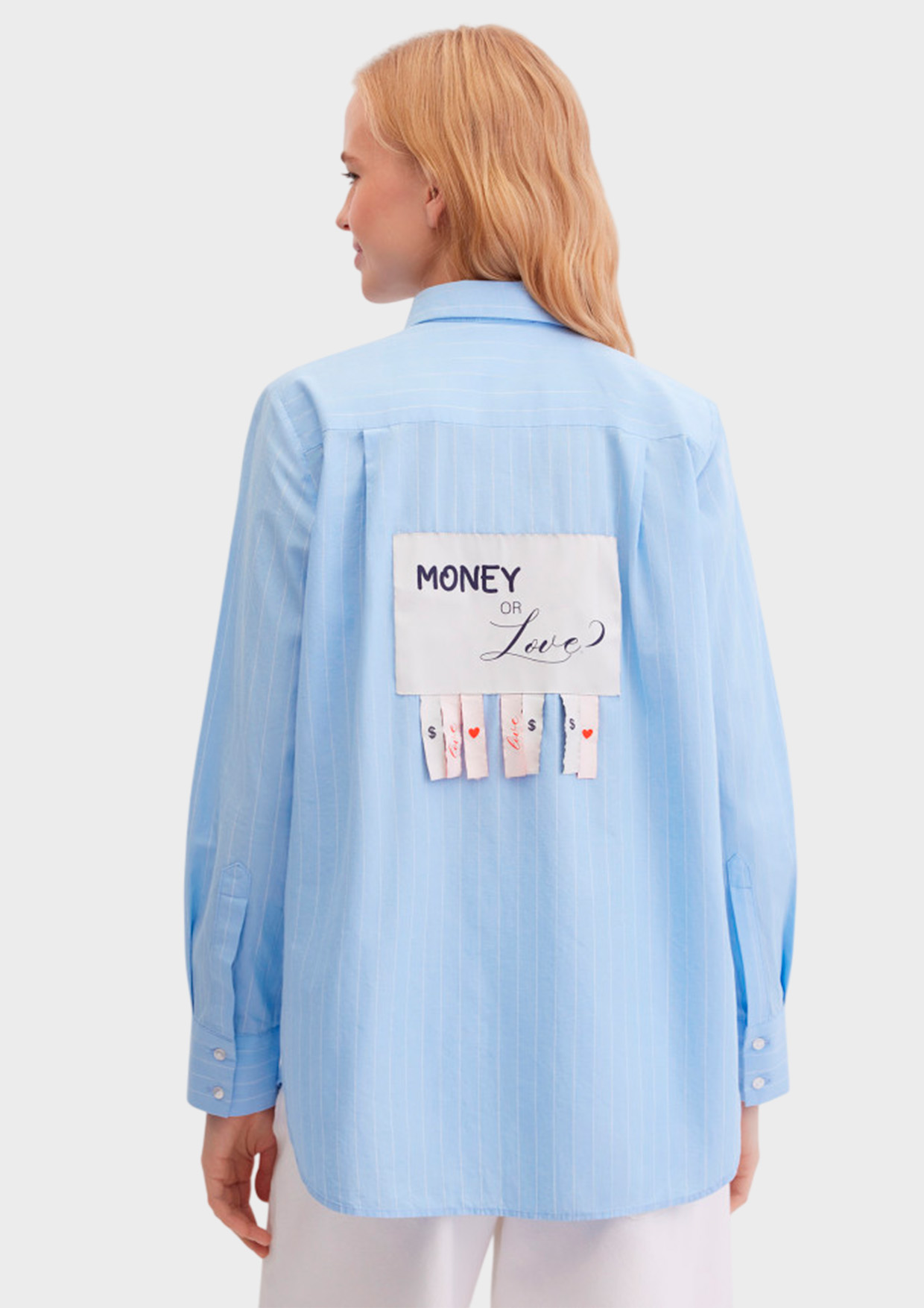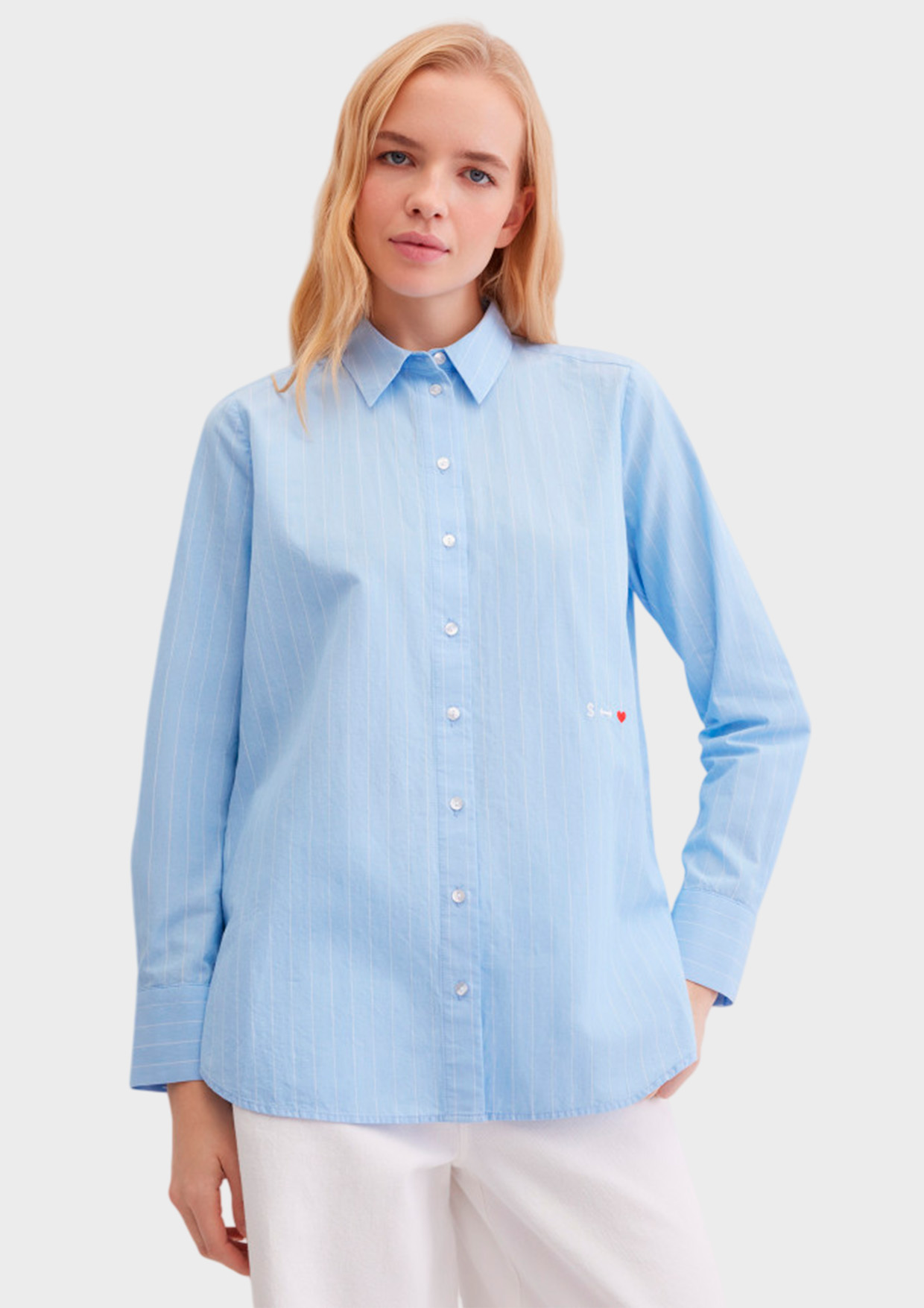 Свободная рубашка прямого кроя из тонкого натурального хлопка в полоску. Выполнена на пуговицах, с длинным втачным рукавом с манжетами на пуговицах, с отложным воротником. Акцентыми деталями изделия являются деликатная вышивка спереди и оригинальные нашивки на спинке.
