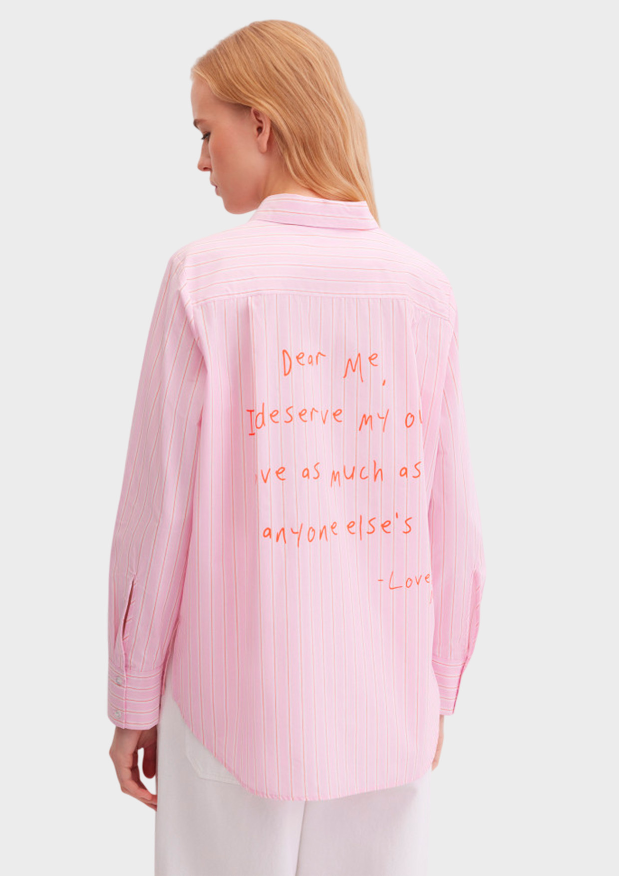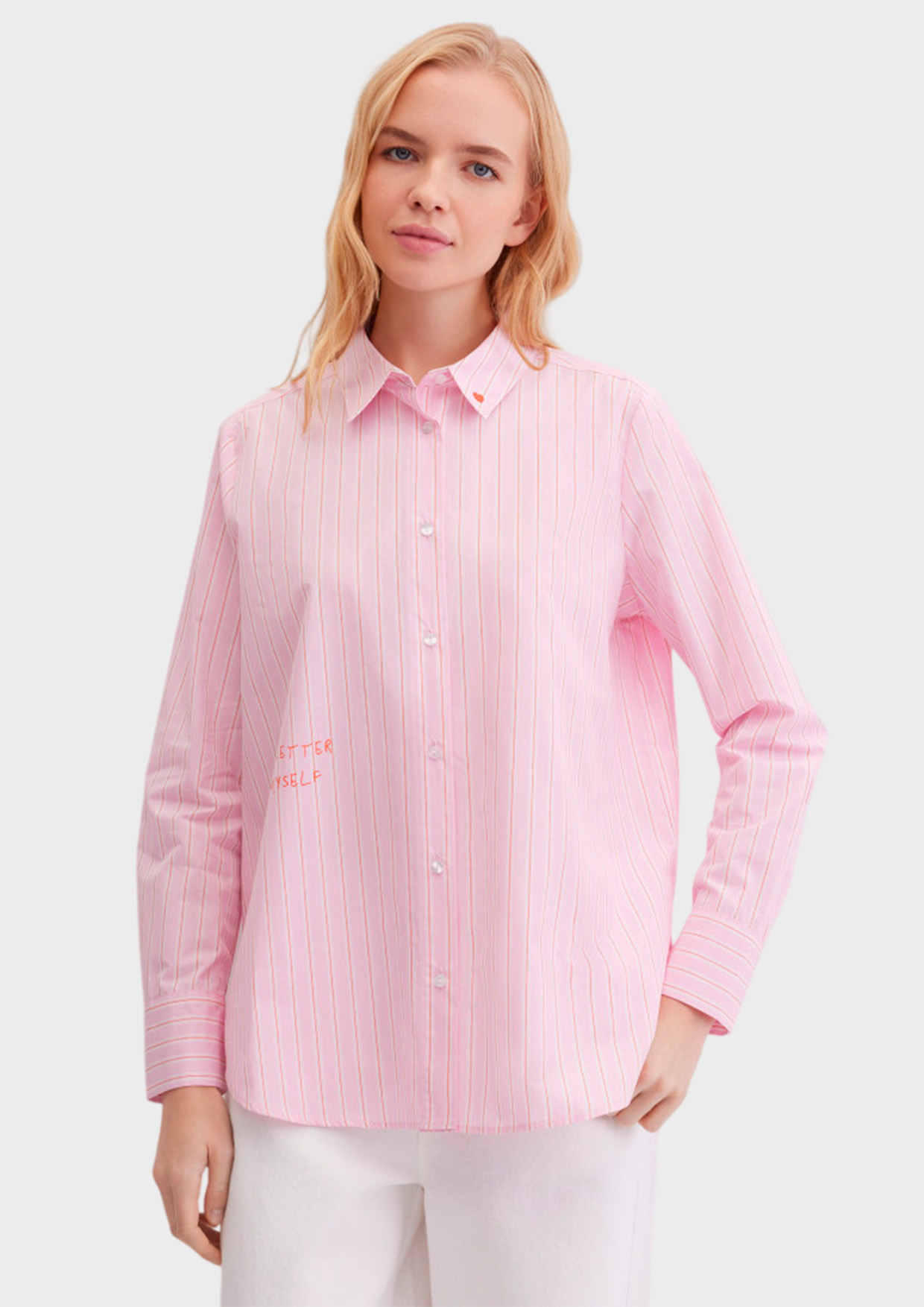 Свободная рубашка прямого кроя из тонкого натурального хлопка в полоску. Выполнена на пуговицах, с длинным втачным рукавом с манжетами на пуговицах, с отложным воротником. Акцентыми деталями изделия являются деликатная вышивка сердечком на воротнике, надписи спереди и на спинке.