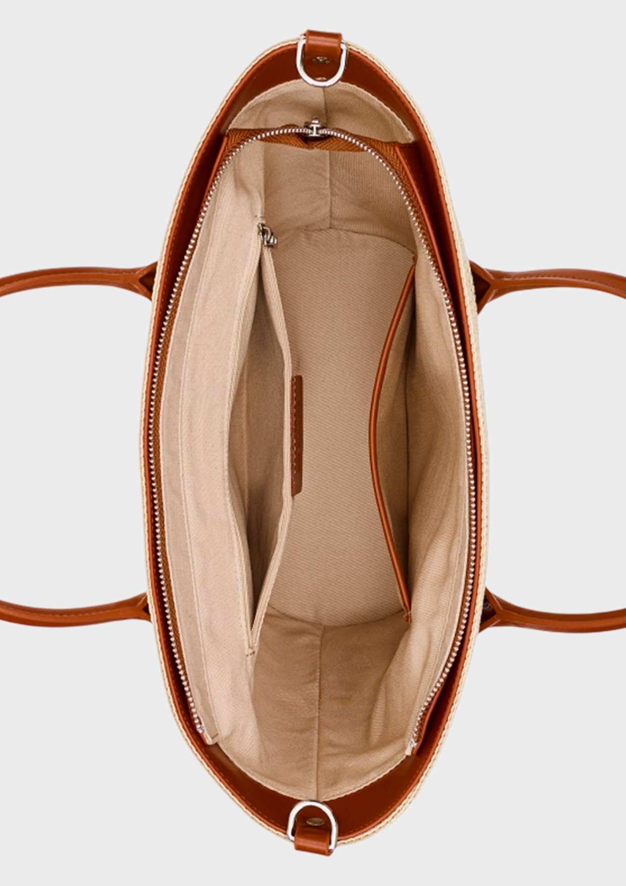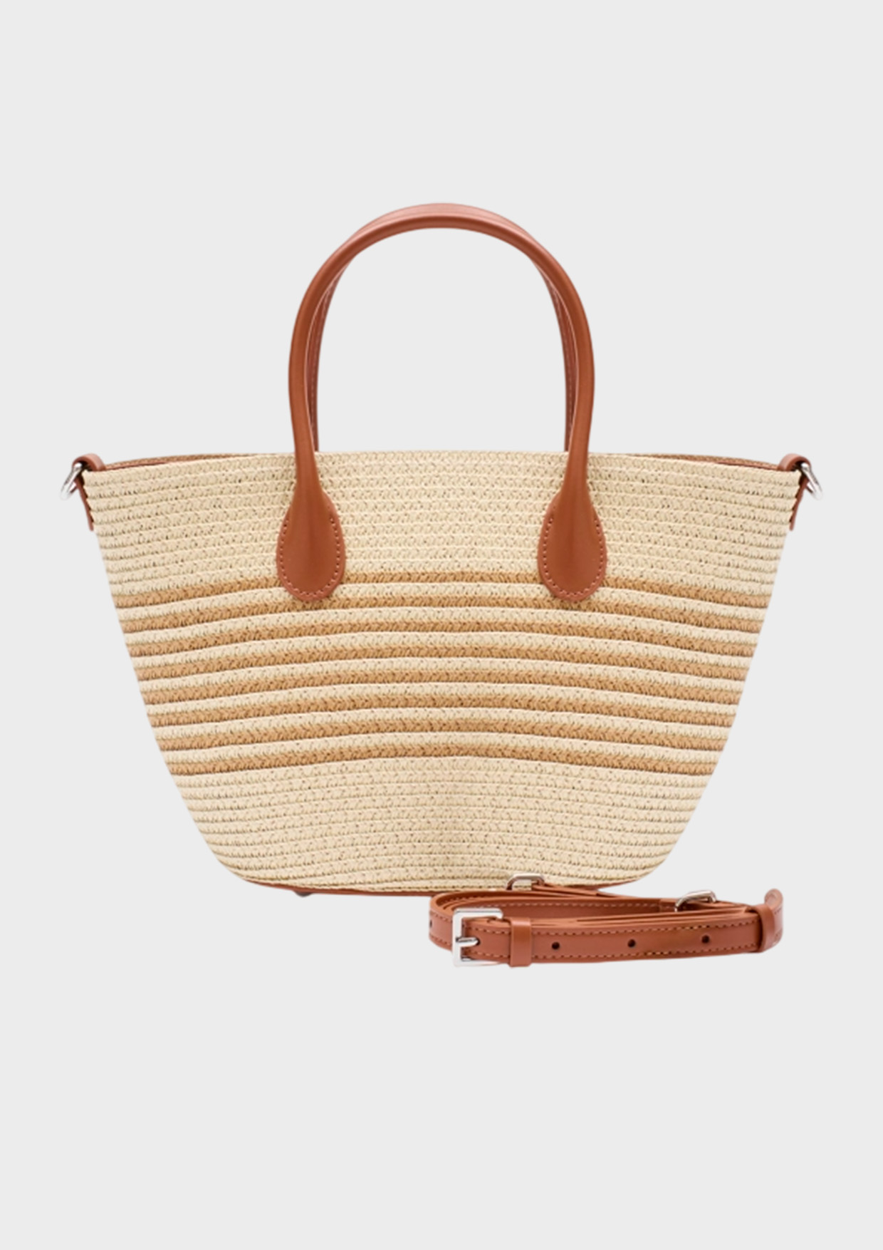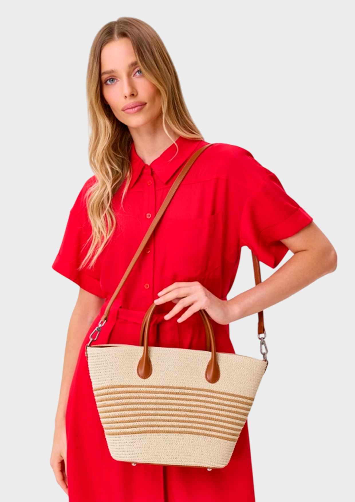 Соломенная сумка в контрастную полоску. Одно вместительное отделение. Застежка на молнию. Две короткие ручки и длинный регулируемый ремень в комплекте.