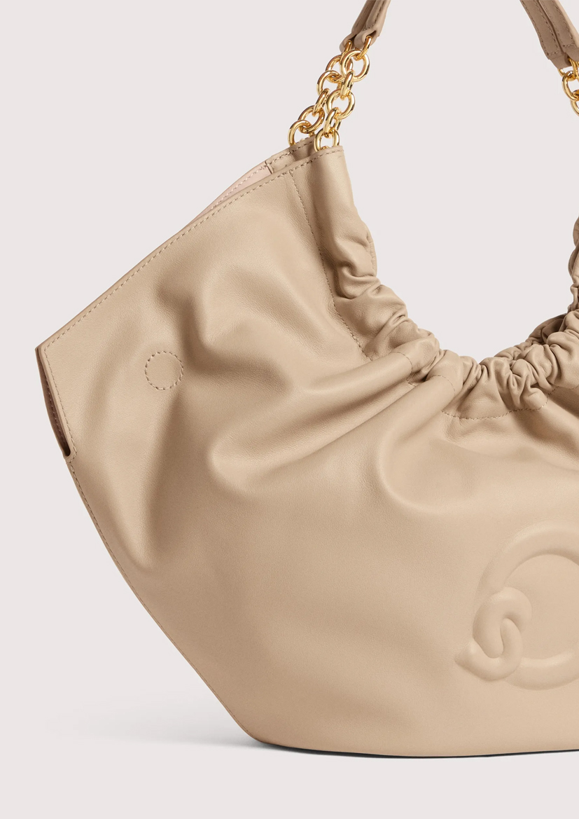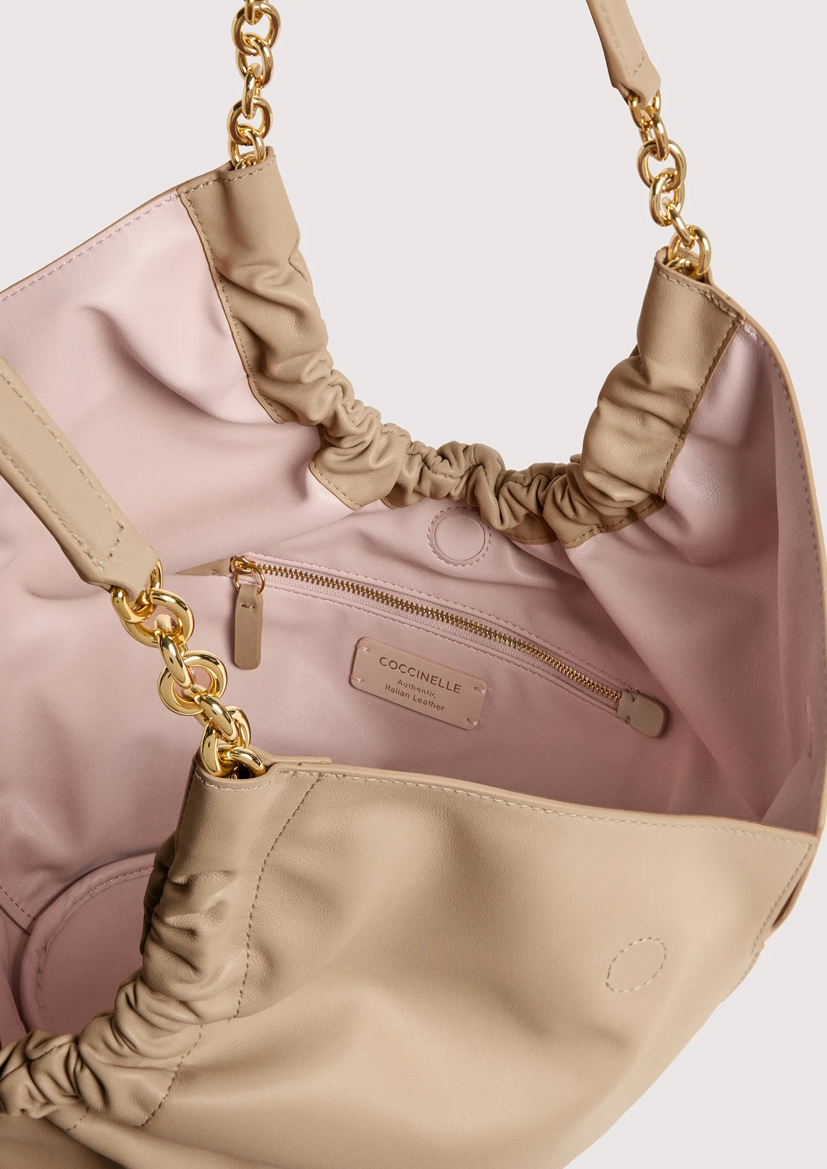 Коллекция Coccinelle Smash воплощает современный женственный стиль бренда. Легкая гладкая кожа собрана с помощью металлической цепочки, образуя мягкие складки, которые придают сумке изящный вид. Логотип C-Me украшает эту вместительную сумку и придает ей индивидуальность. Для дополнительного комфорта к цепочкам прикреплена кожаная вставка для ношения на плече. Эта модель выполнена из гладкой кожи, обработанной специальными маслами, которые делают ее мягкой на ощупь. Несмотря на шелковистый внешний вид, кожа устойчива к атмосферным воздействиям благодаря использованию смол, которые делают ее слегка водонепроницаемой, сохраняя при этом естественный вид.