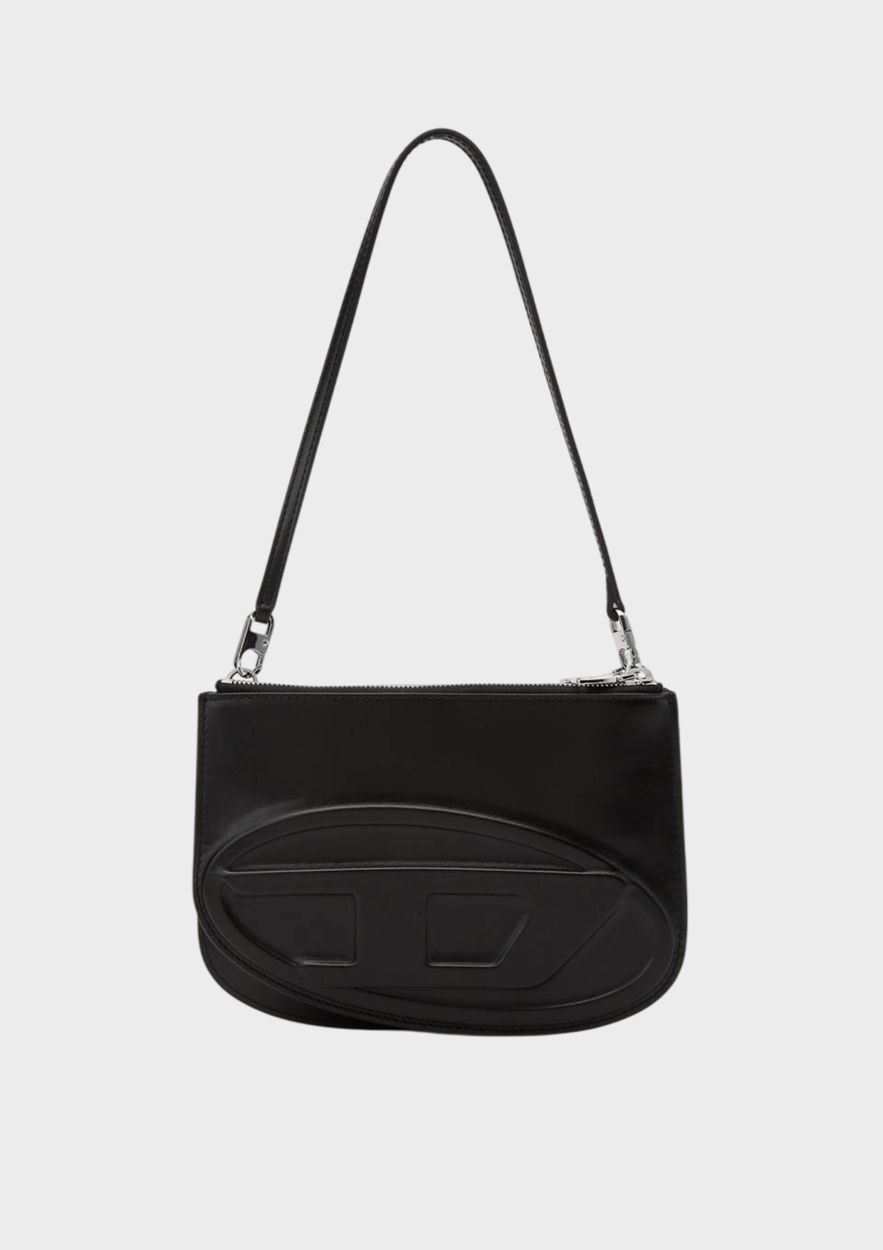 Сумку 1DR Twin с взаимозаменяемыми удлиненной ручкой и плечевым ремнем сшили из гладкой наппы, сертифицированной LWG. Модель с крупным тисненым логотипом спереди дополнили плоским карманом в одном из двух отделений на молниях.