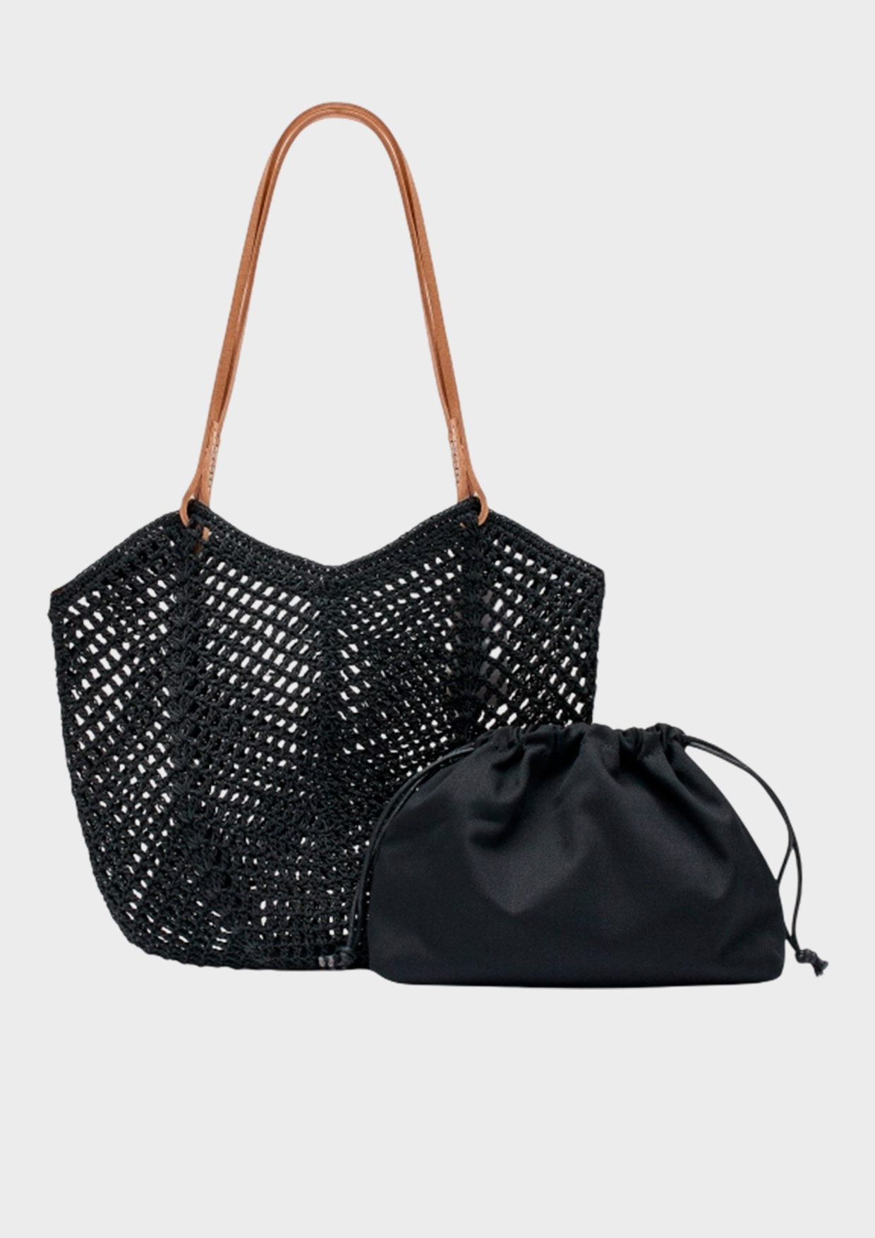 Комплект: ажурная сумка из 100% хлопка и косметичка. Одно вместительное отделение. Две длинные ручки из натуральной кожи. Текстильная косметичка с одним вместительным отделением на кулисе.