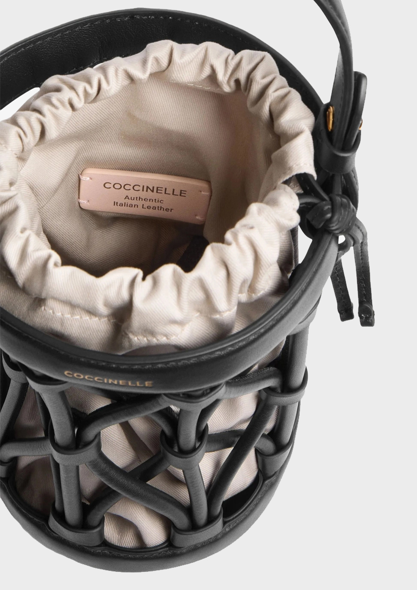 Черная кожаная сумка-ведро со съемной верхней ручкой и затягивающимся шнуром. Изготовлена из телячьей кожи с хлопковой подкладкой.