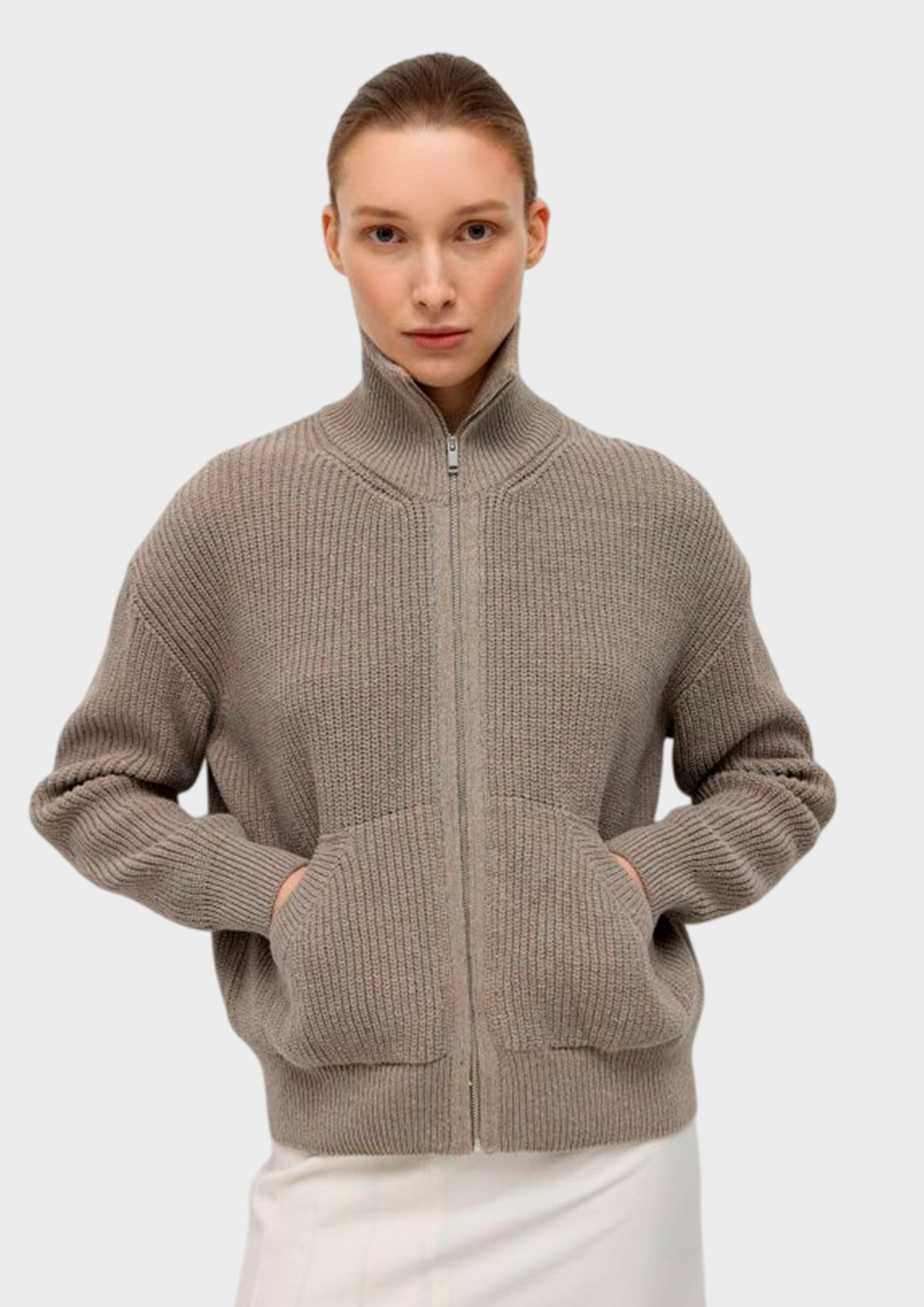 Женский кардиган бренда AROUND серо-бежевого цвета. Изготовлен из экологичного материала, что делает его комфортным при носке и безопасным для окружающей среды. Молния обеспечивает удобство использования и стильный внешний вид.