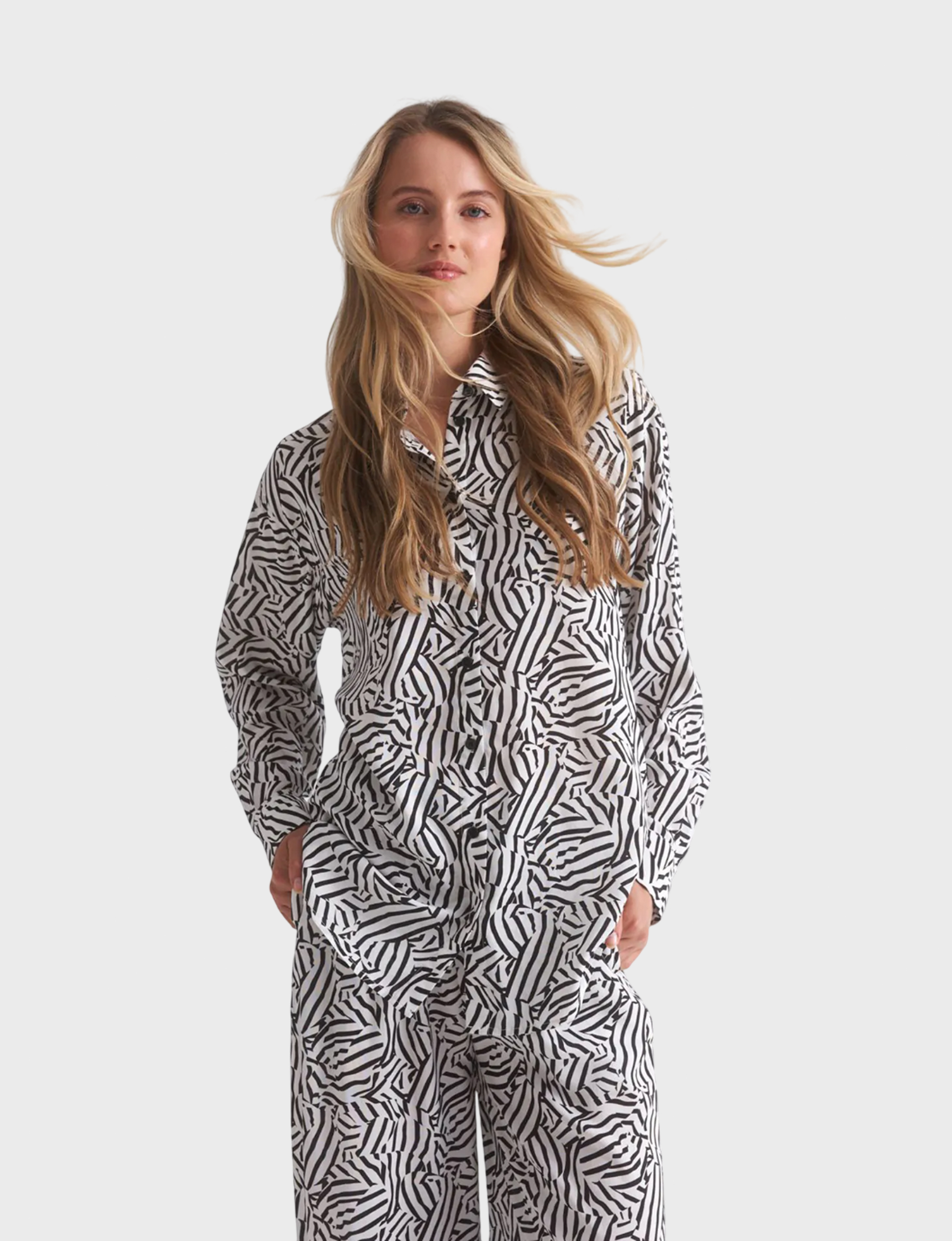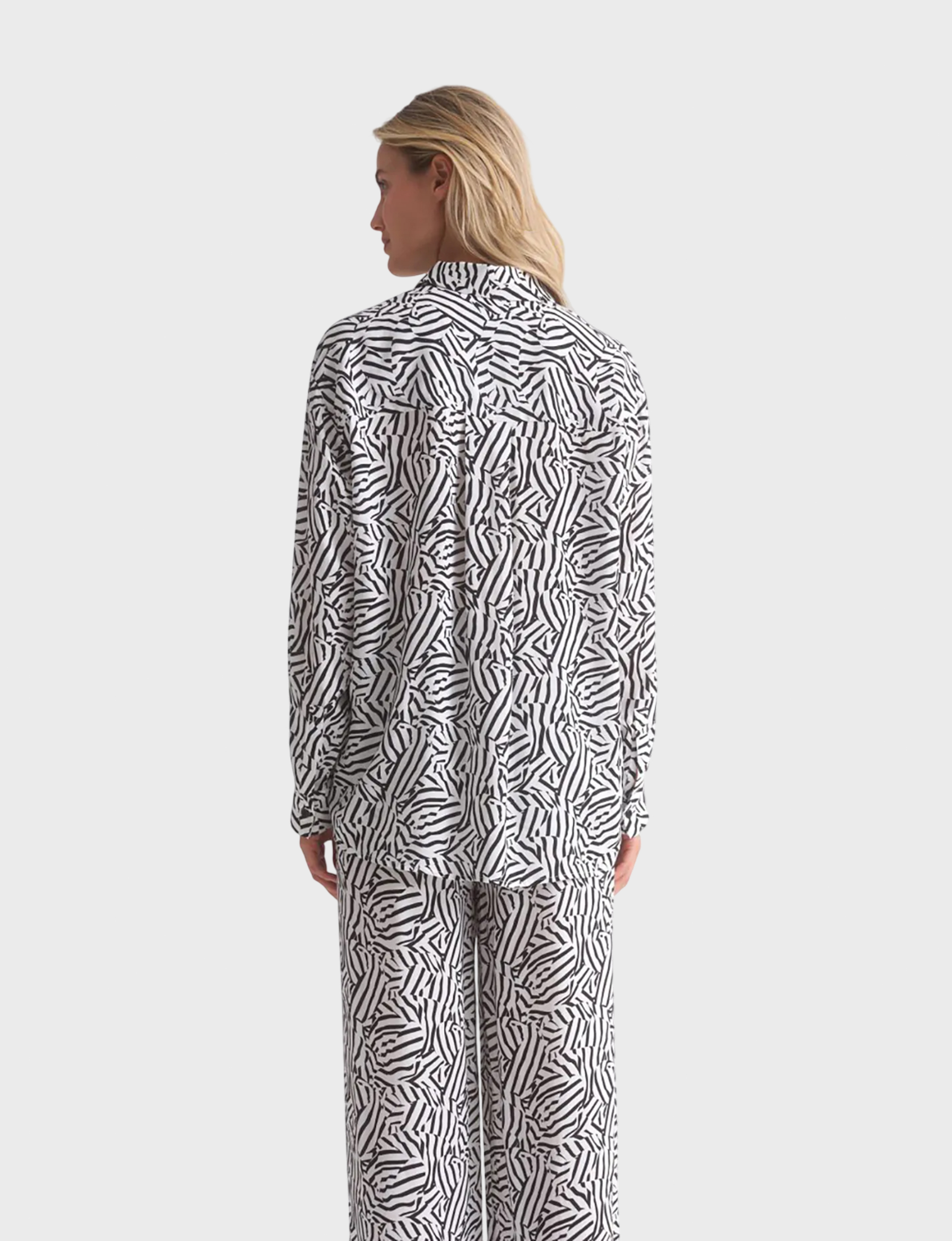 Свободная блуза UNQ бело-черного цвета в абстрактный рисунок. Модель с отложным воротником, застежка на пуговицы в тон, длинные рукава. Блузу можно сочетать с жилетом, жакетом, кардиганом, джемпером, юбкой и брюками.