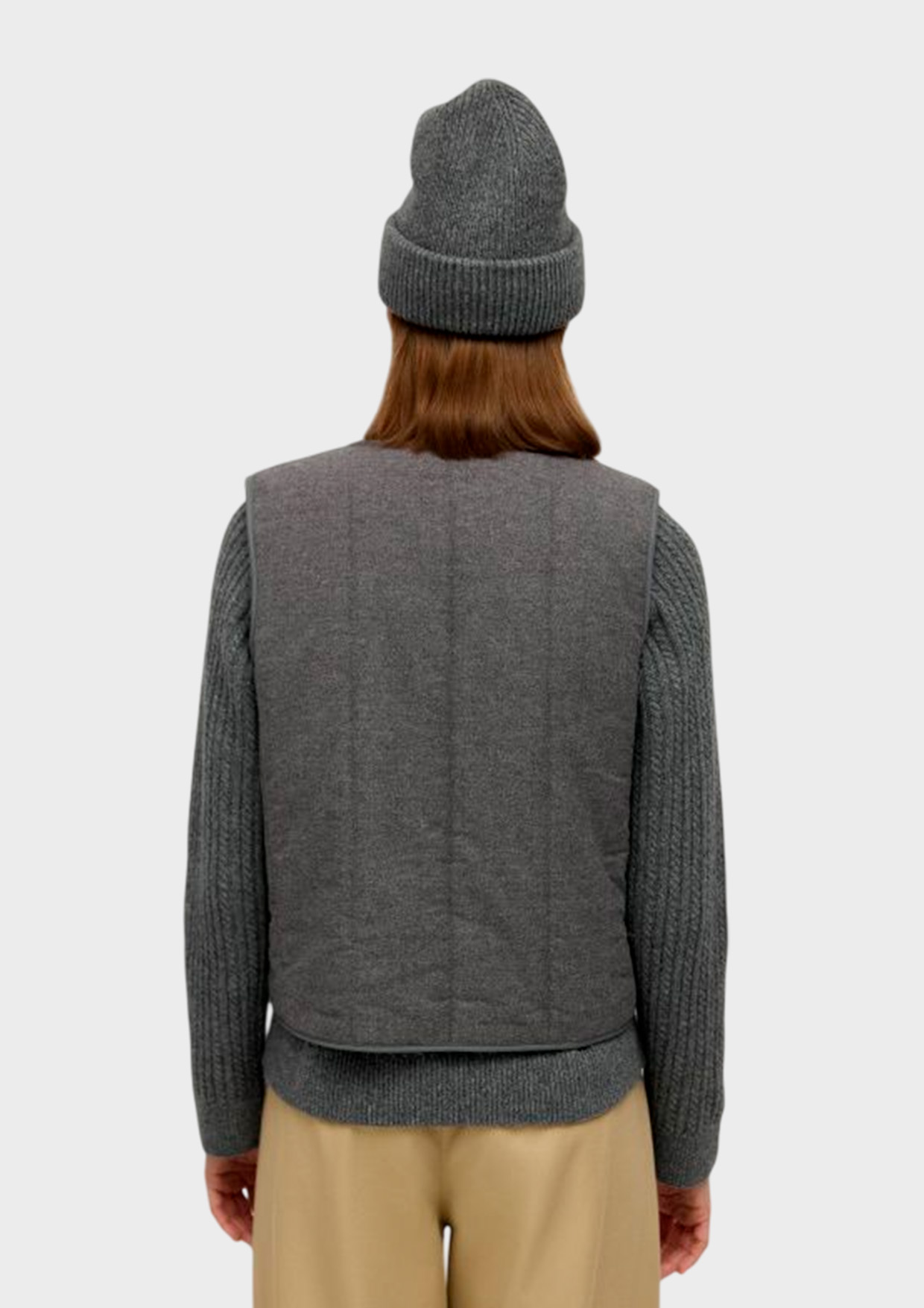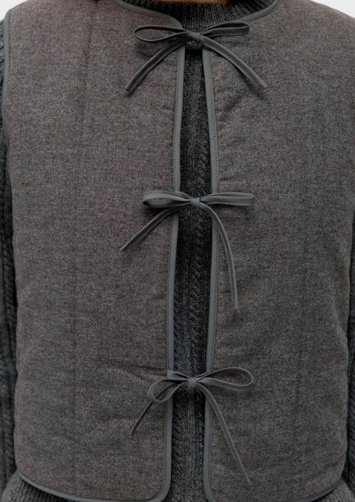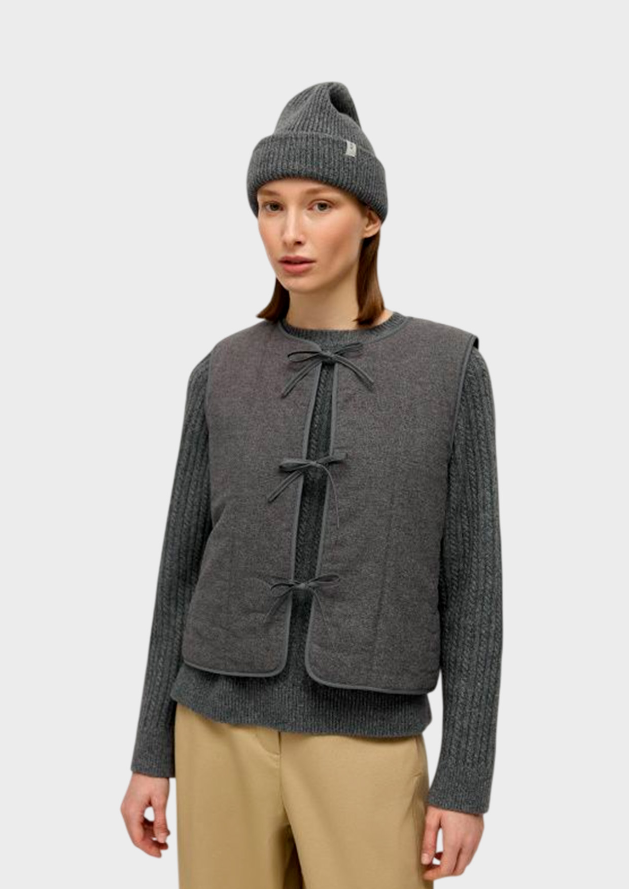 Жилет сшит из фланели, внутри — высокотехнологичный утеплитель, обладающий свойствами эко-пуха. Застежка на завязки в несколько рядов, минималистичная вертикальная стежка.