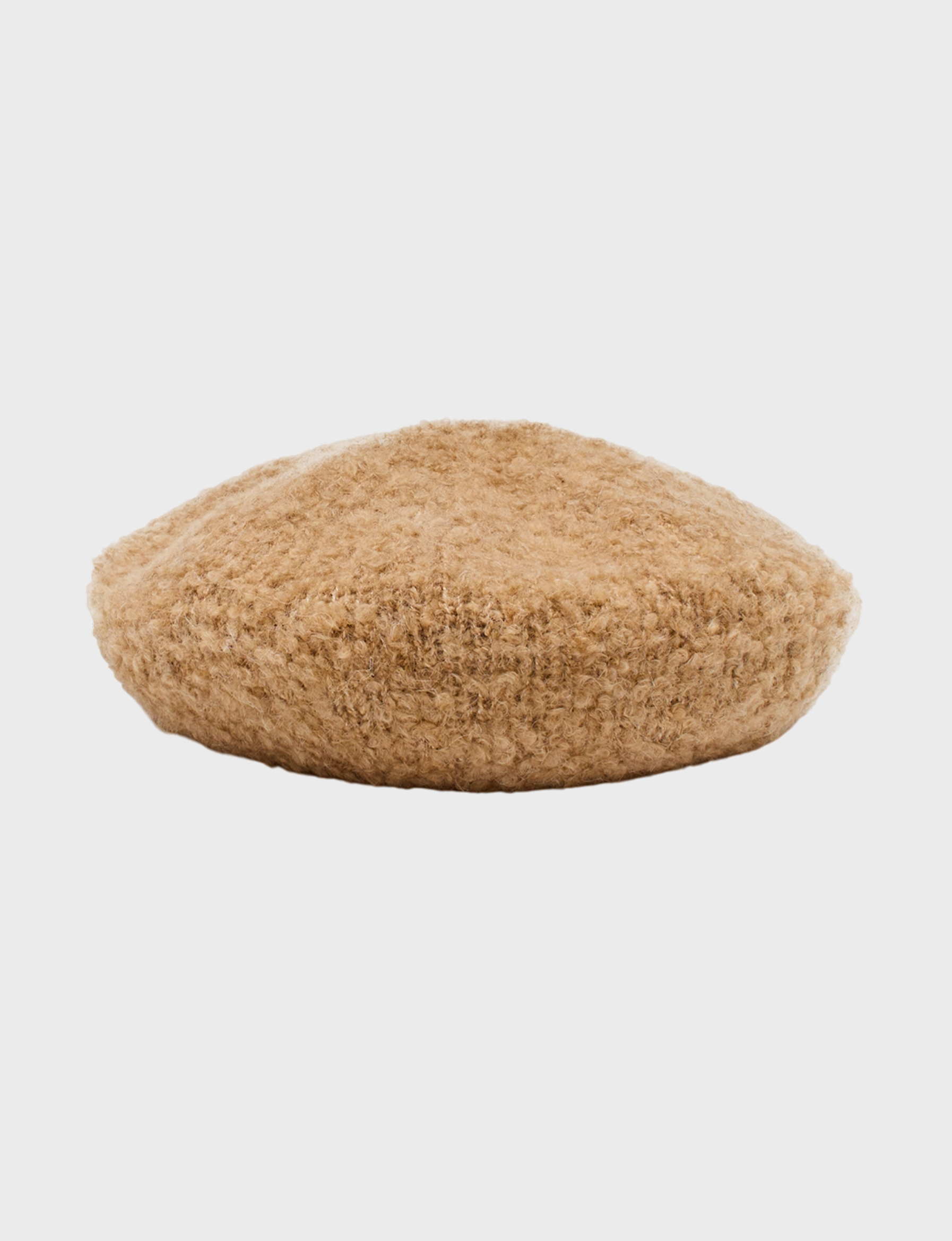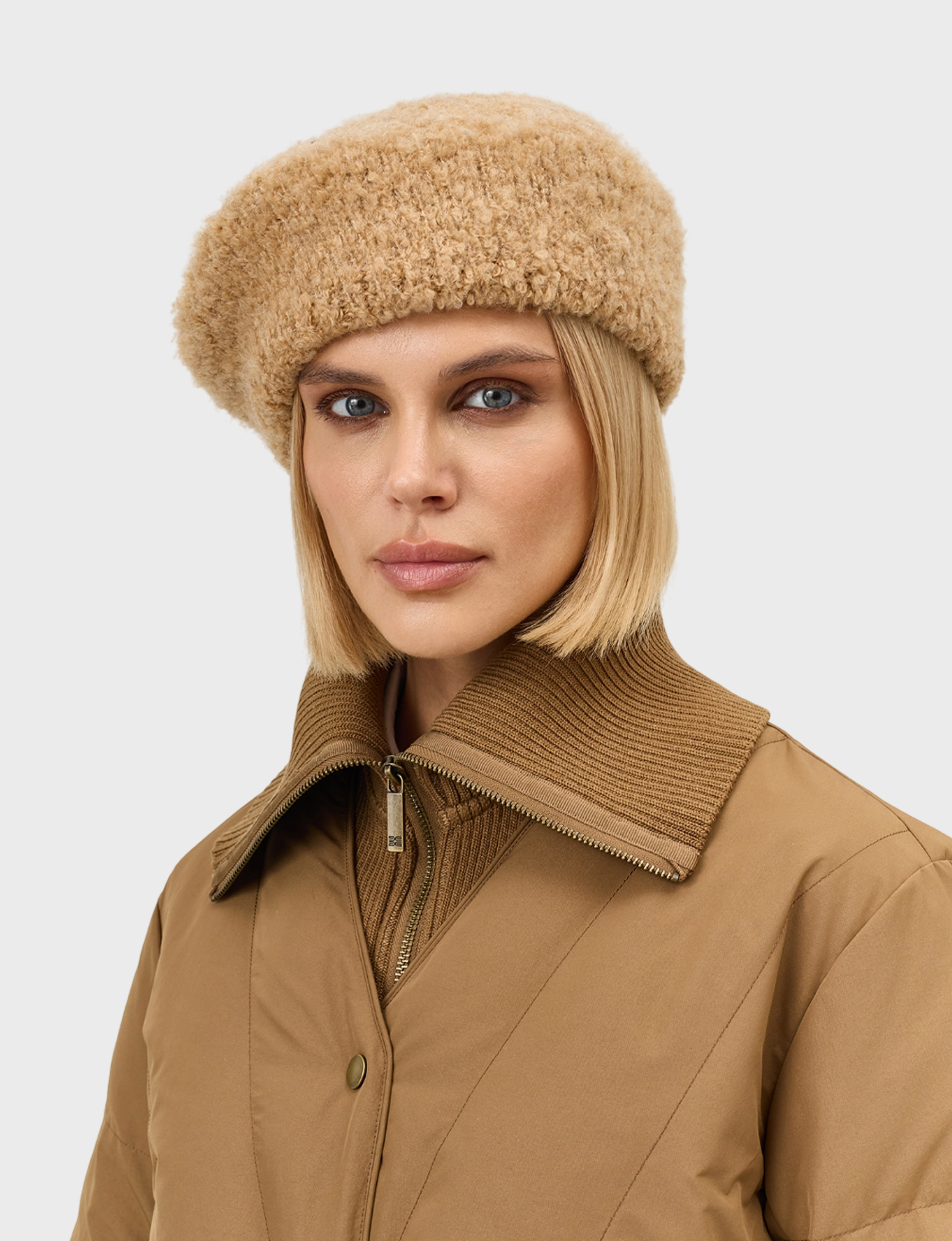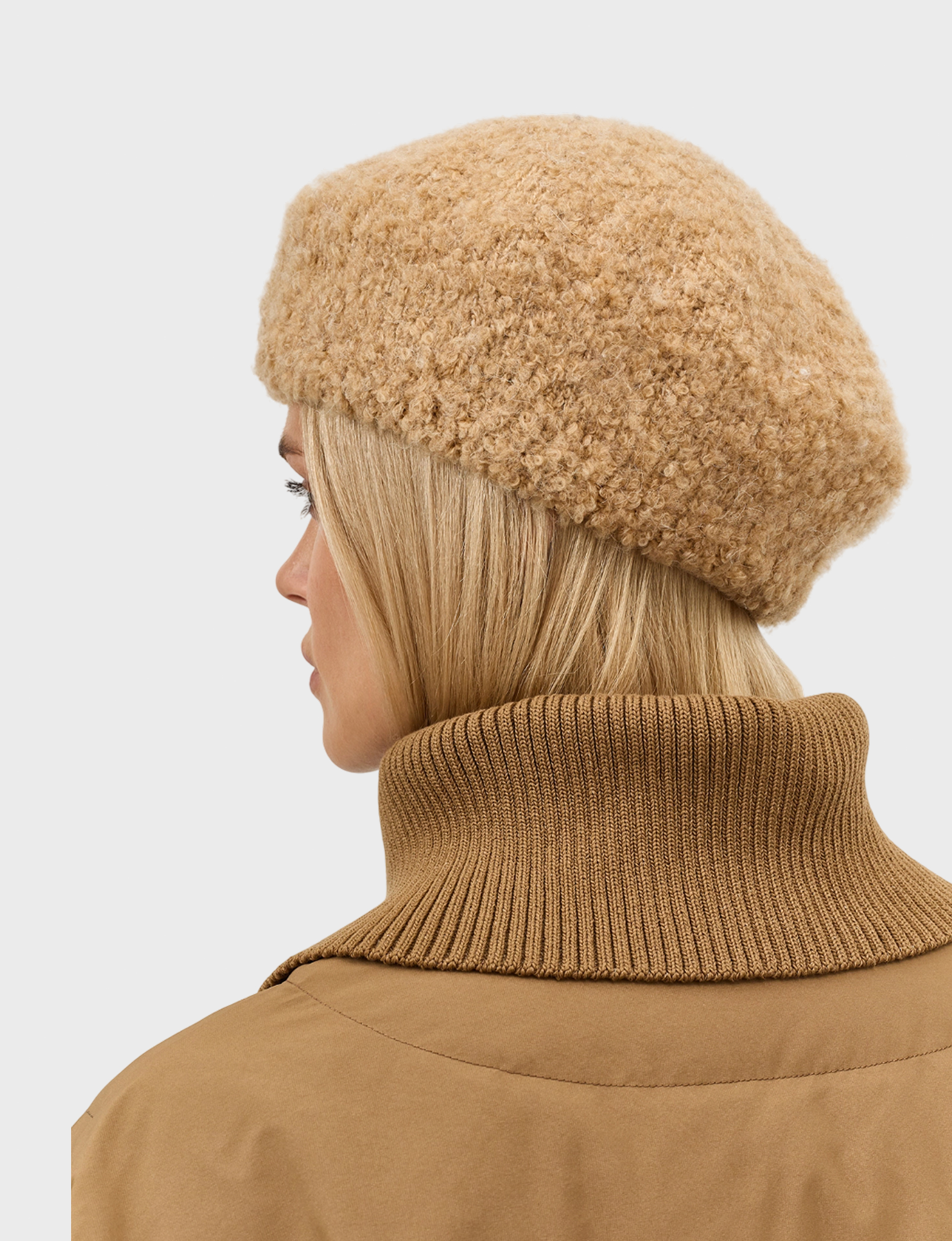 Мягкий вязаный берет из буклированной пряжи с шерстью в составе. Дополнен рибом по внутренней стороне для лучшей фиксации и регулировки размера.
