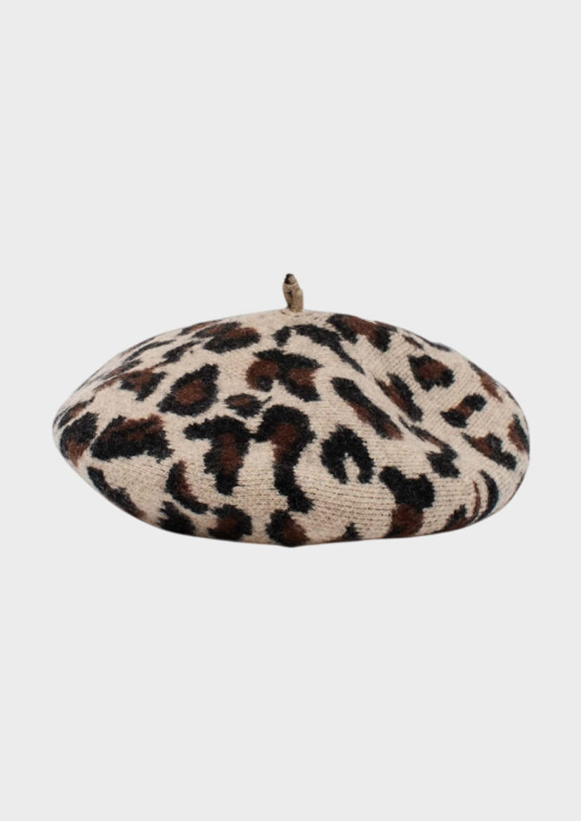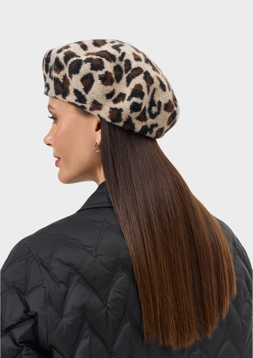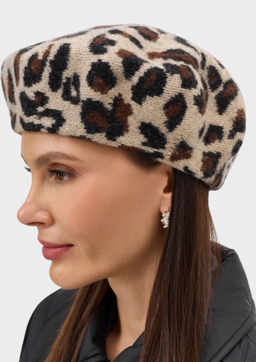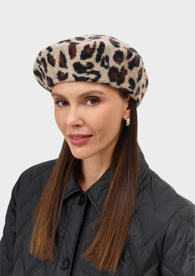 Вязаный берет из 100% шерсти с анималистичным принтом. Дополнен рибом по внутренней стороне для комфортной посадки.