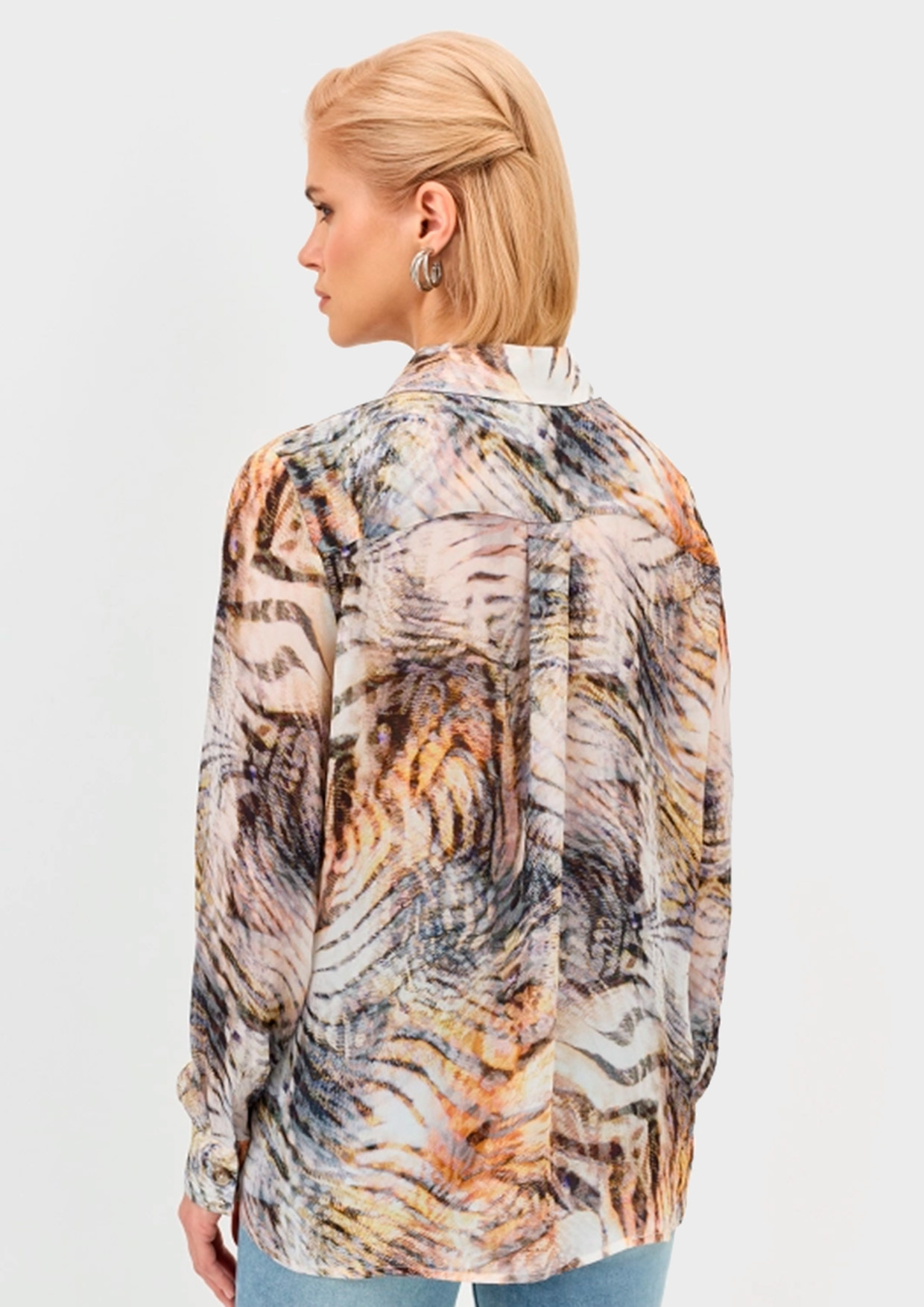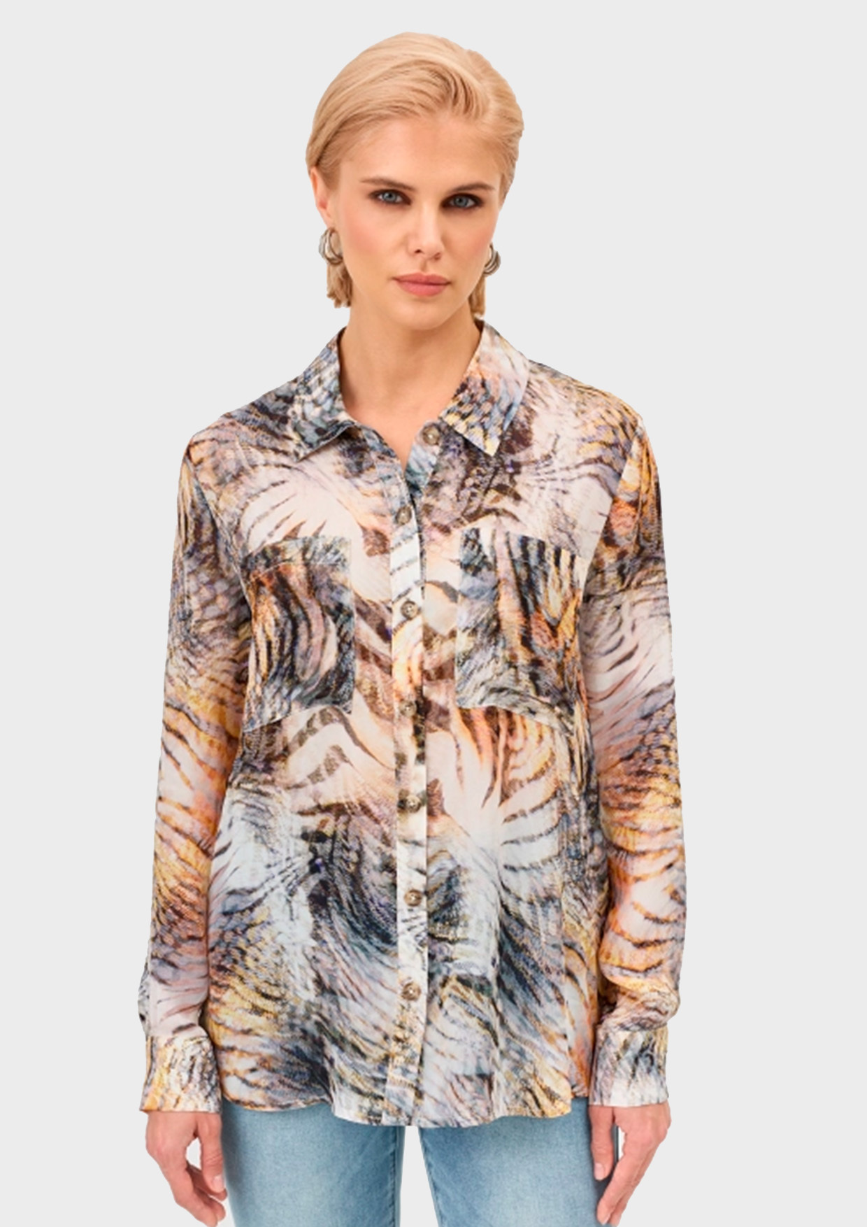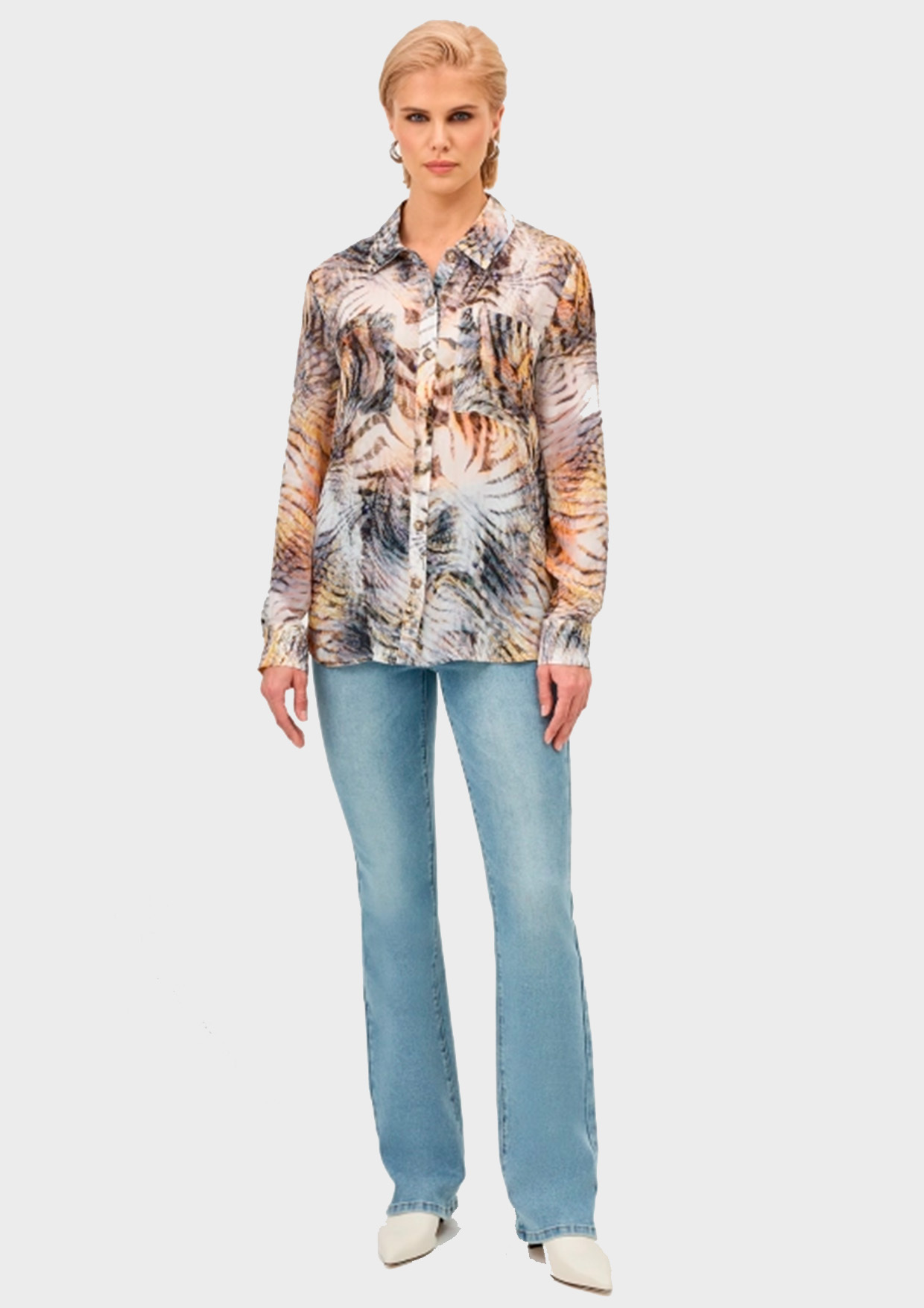 Блузка с анималистичным принтом из 100% вискозы. Прямой силуэт. Отложной воротник. Застежка на пуговицы. Длинные свободные рукава с манжетами. Накладные нагрудные карманы.