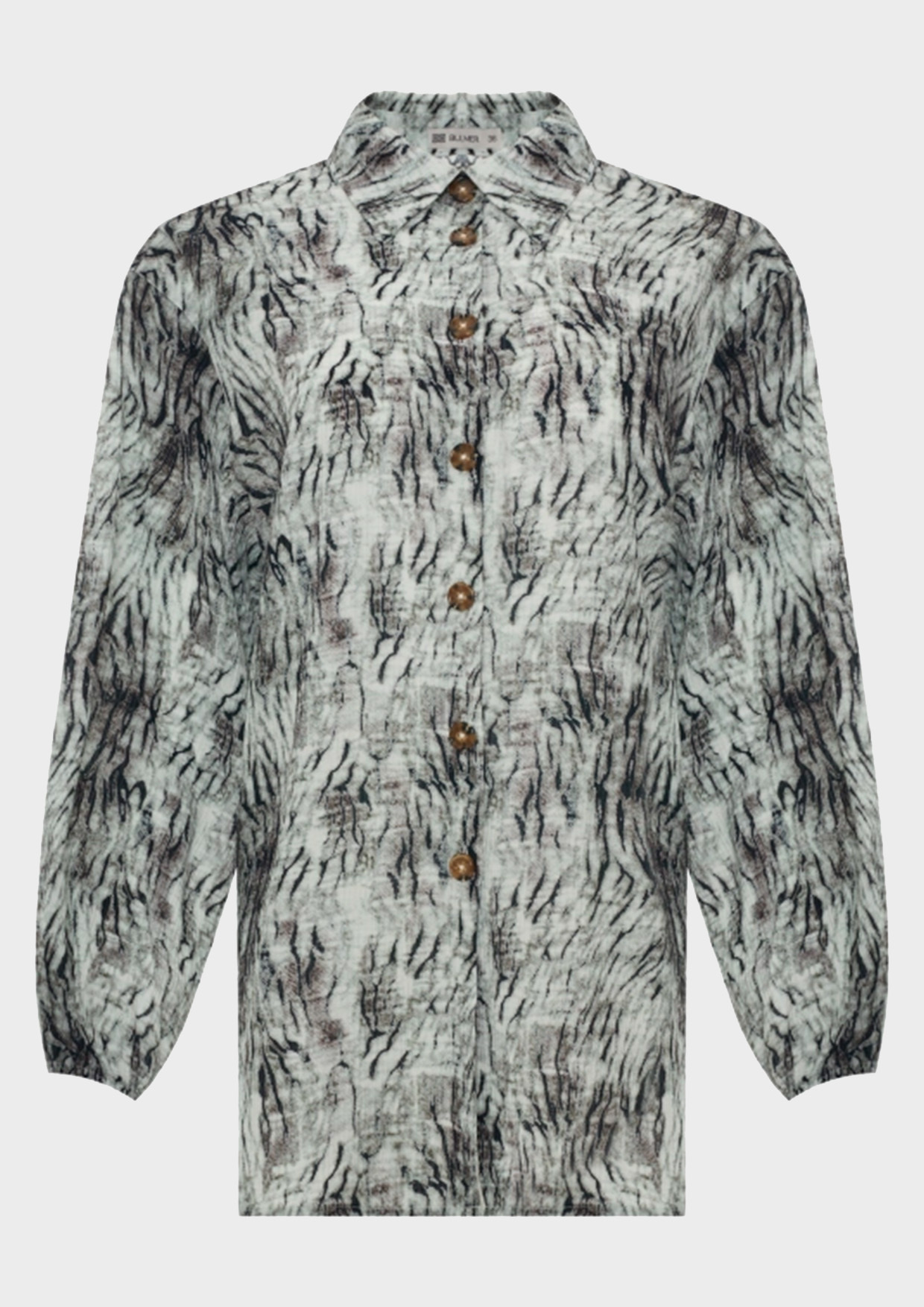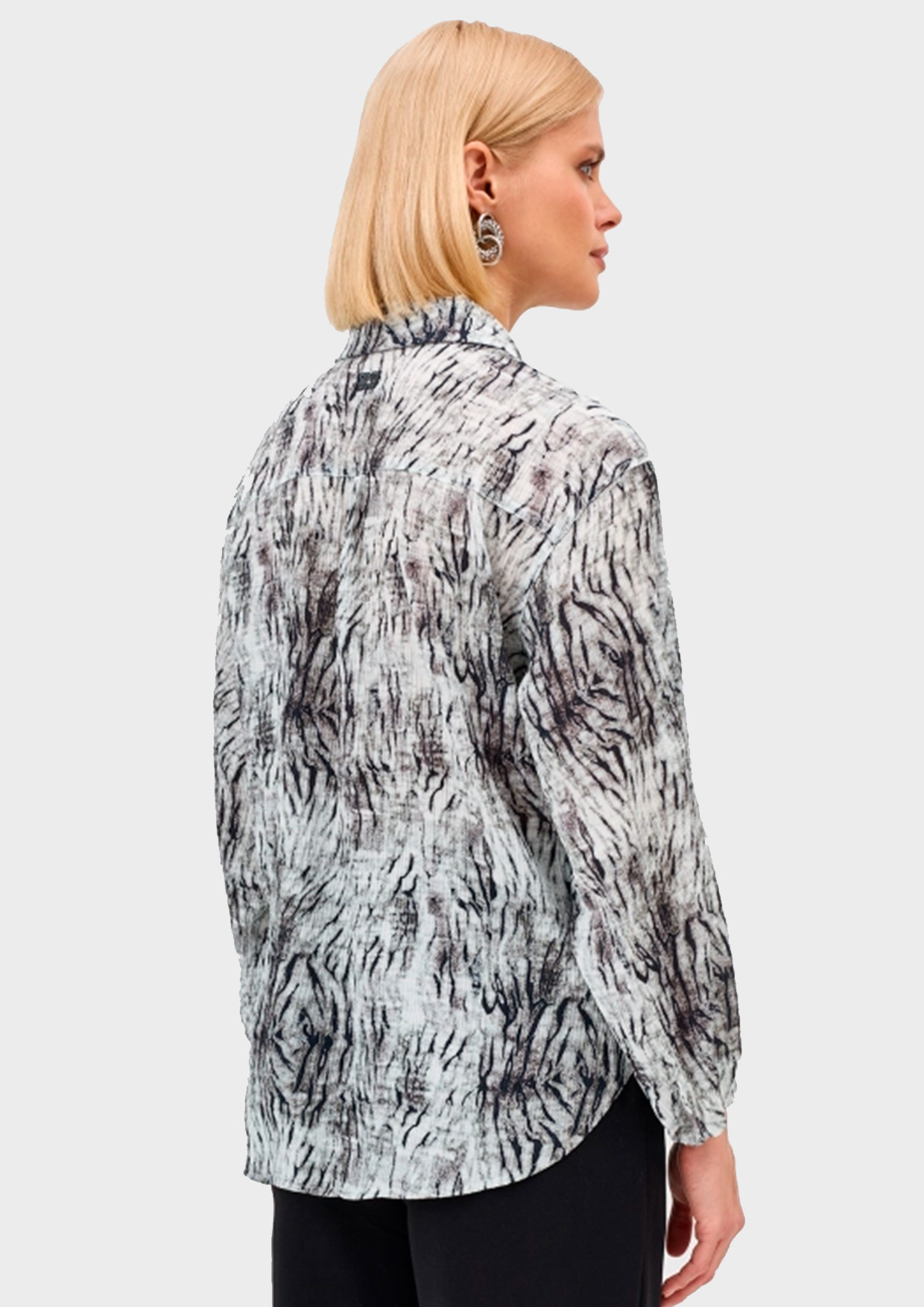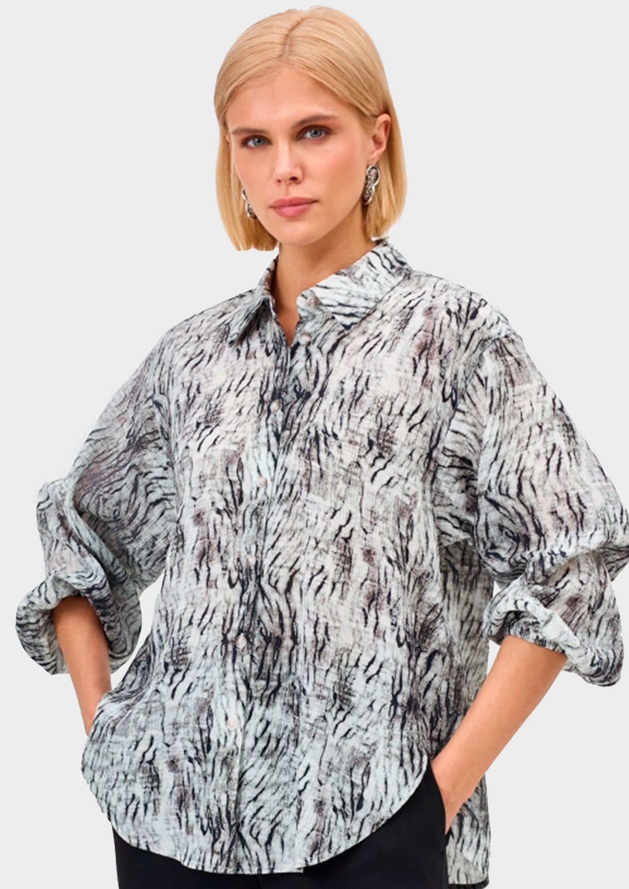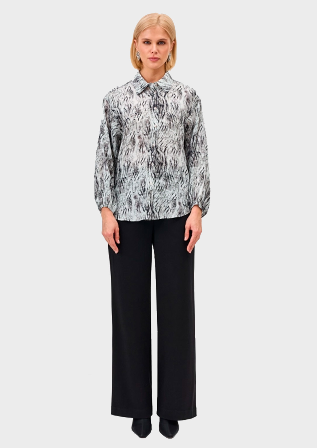 Блузка из вискозы с фантазийным принтом. Свободный силуэт. Рукава 3/4 с резинокой по низу. Отложной воротник. Застежка на роговые пуговицы. Деликатная вышивка на спинке.