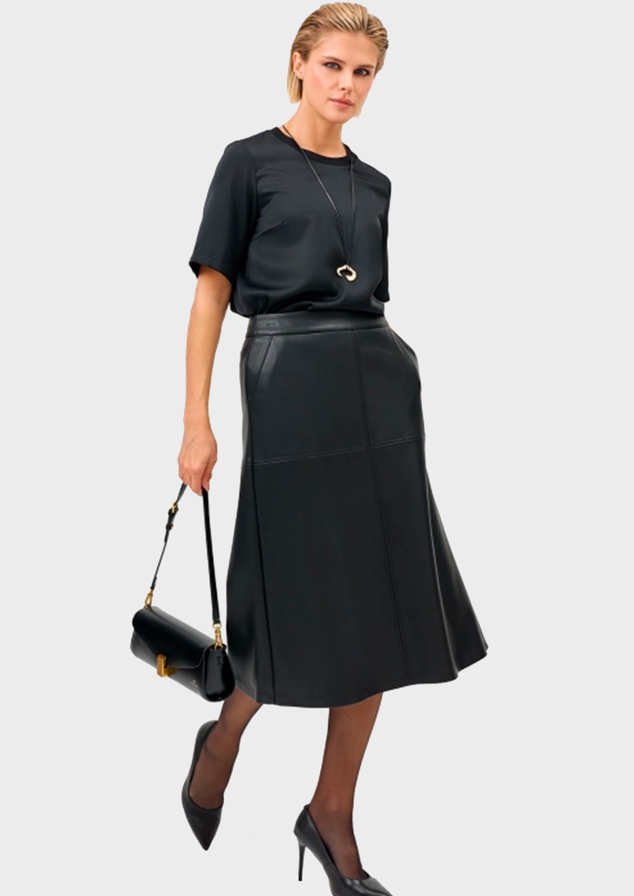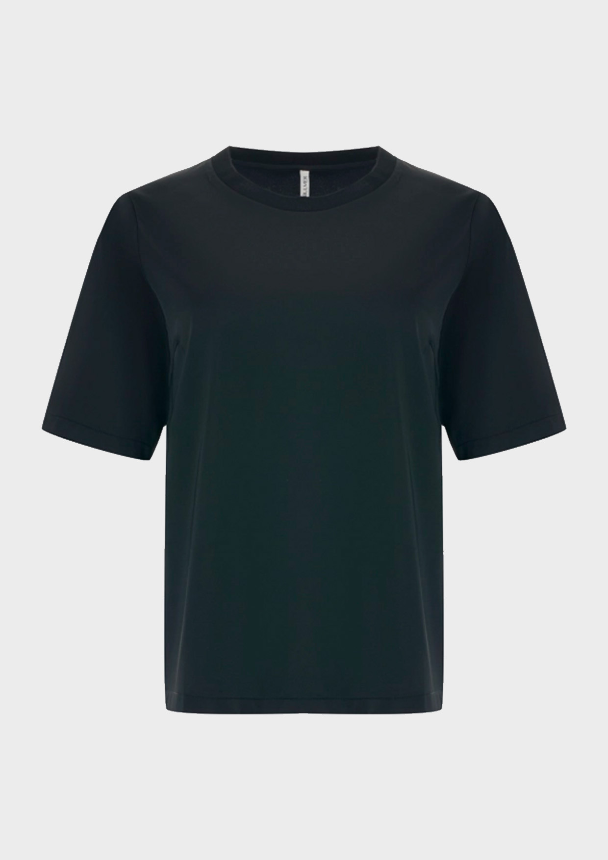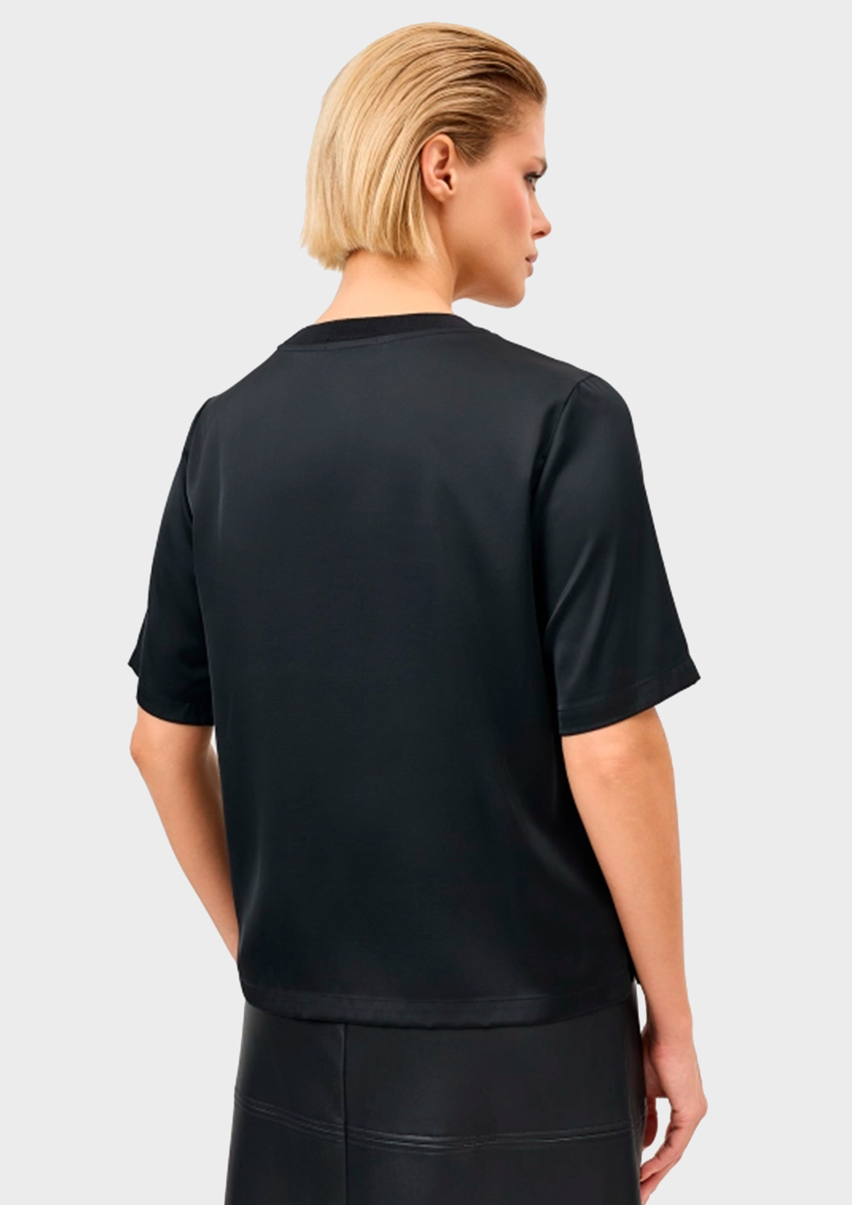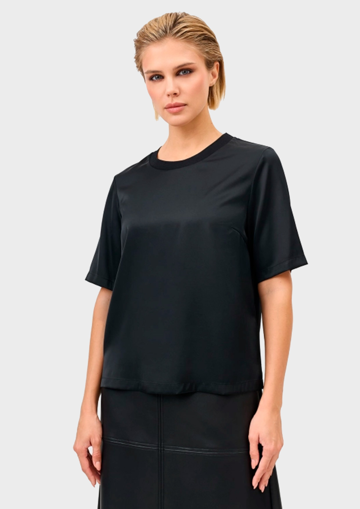 Блузка из шелковистой вискозы с коротким рукавом. Свободный силуэт. Круглый вырез. Риб по горловине. В составе район.