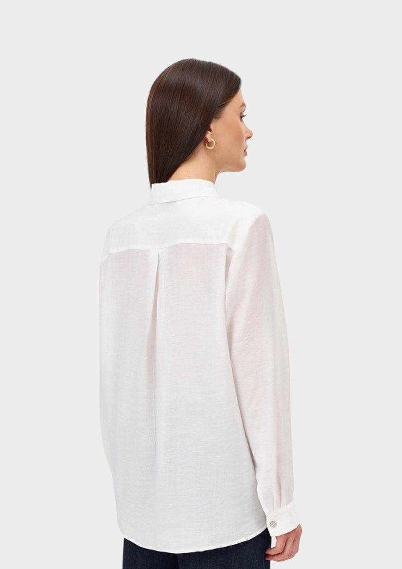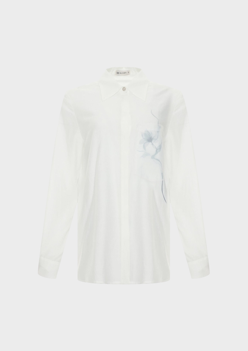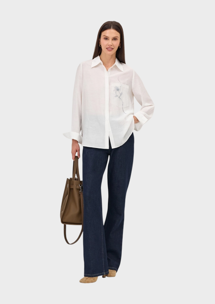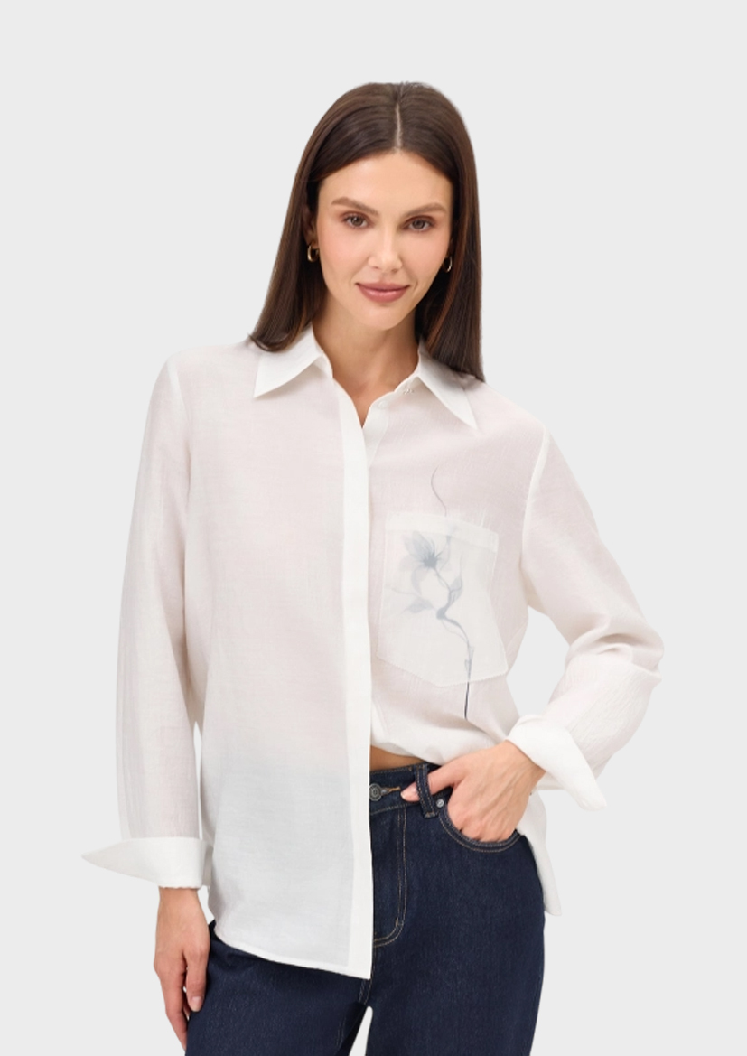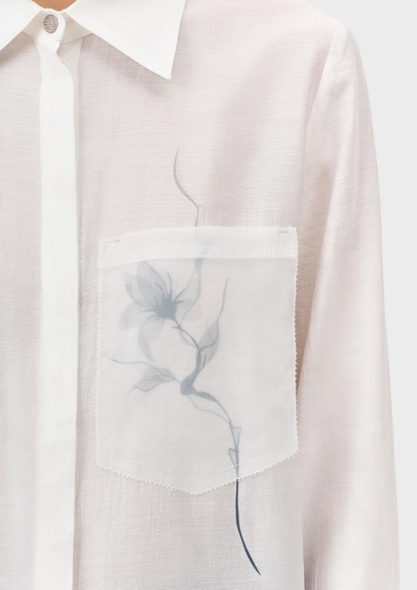 Блузка из вискозы с нежным цветочным принтом. Прямой силуэт. Отложной воротник. Застежка на пуговицы. Накладной нагрудный карман из органзы. Манжеты по низу рукавов. В составе район и нейлон.