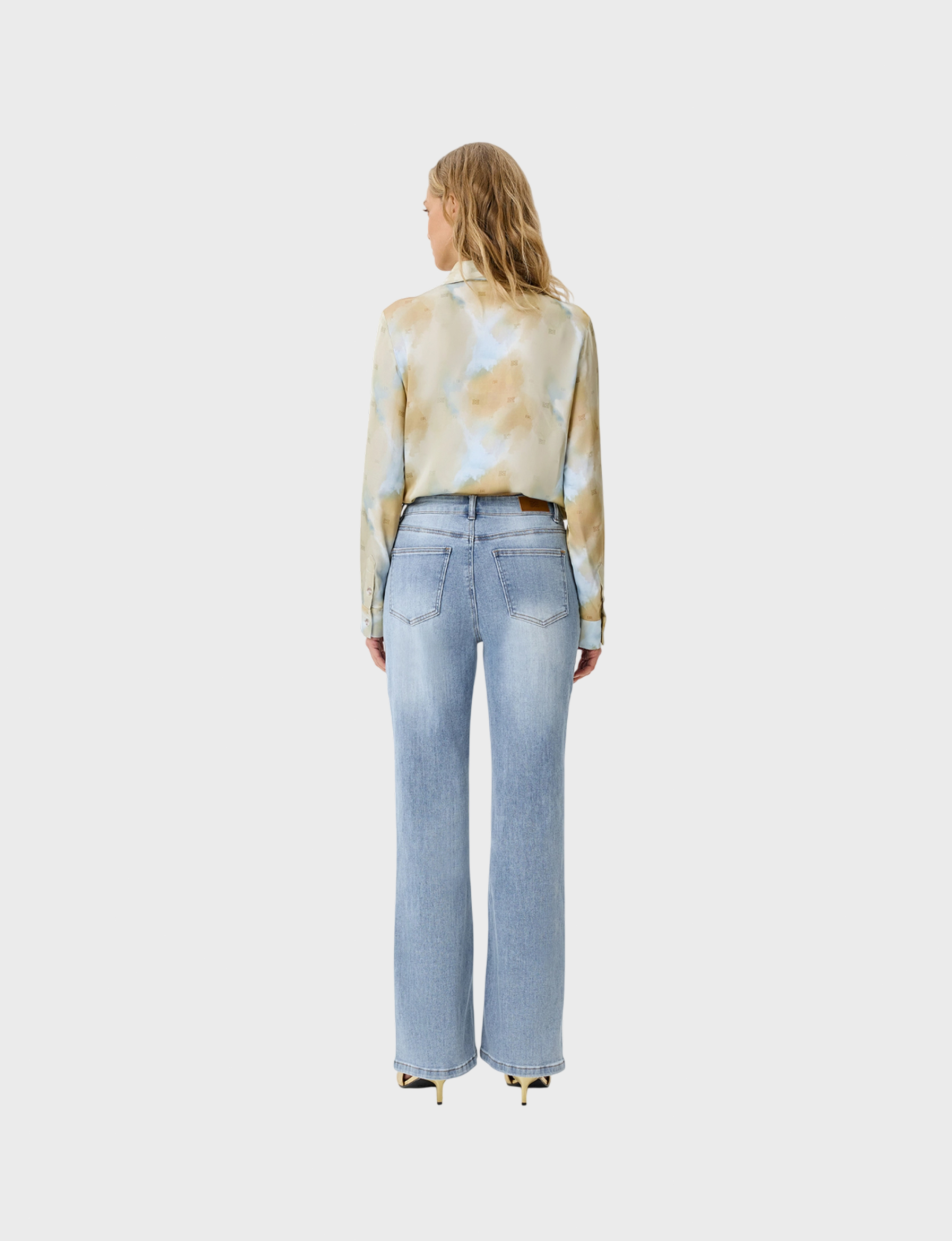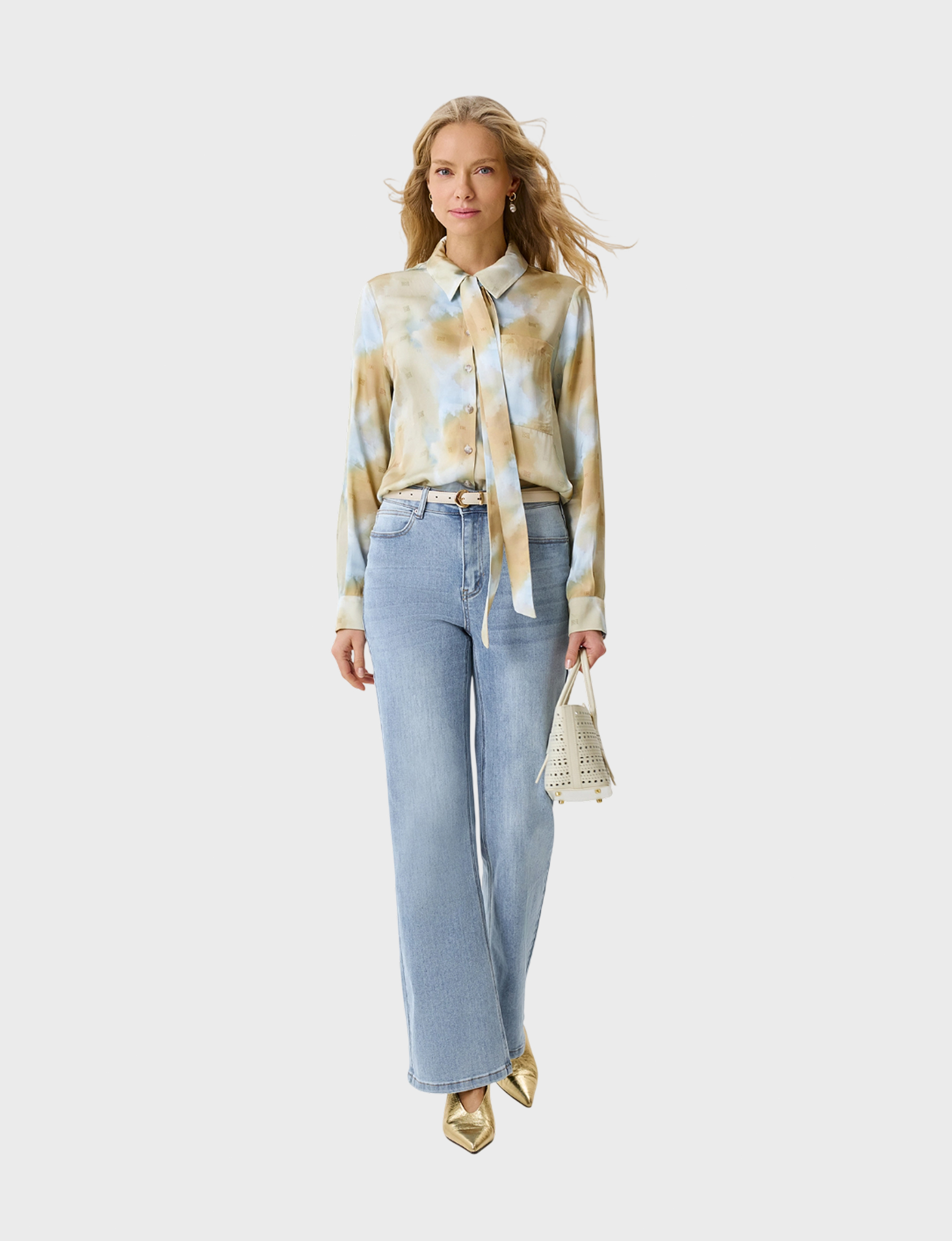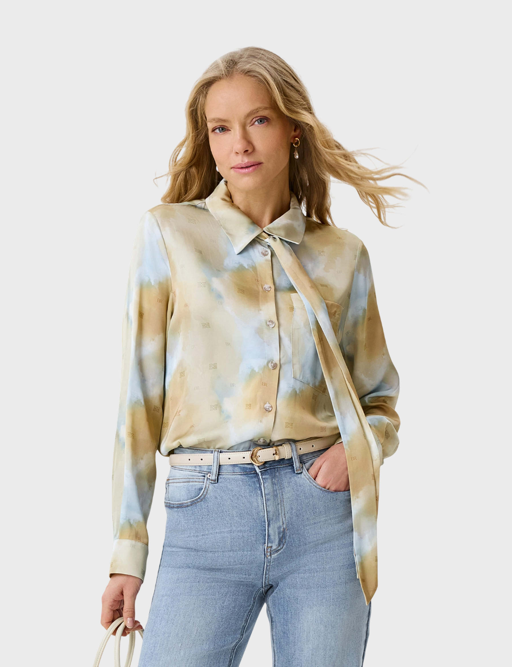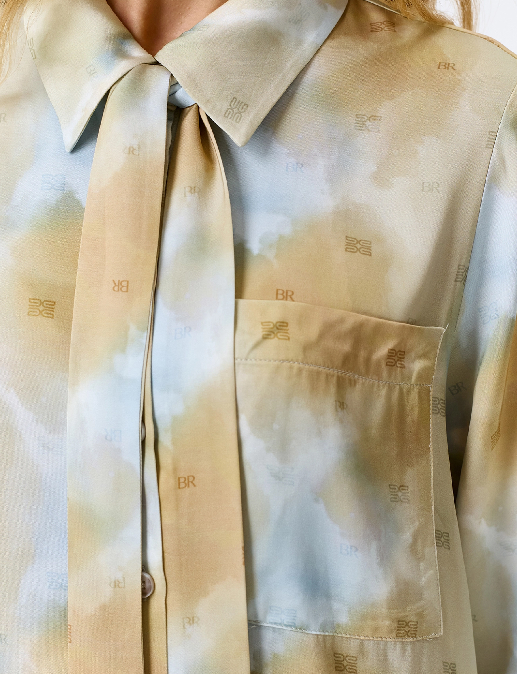 Блузка с абстрактным принтом из 100% вискозы. Свободный силуэт. Длинные втачные рукава. Отложной воротник. Застежка на пуговицы. Дополнена тонким шарфом-твилли в цвет.