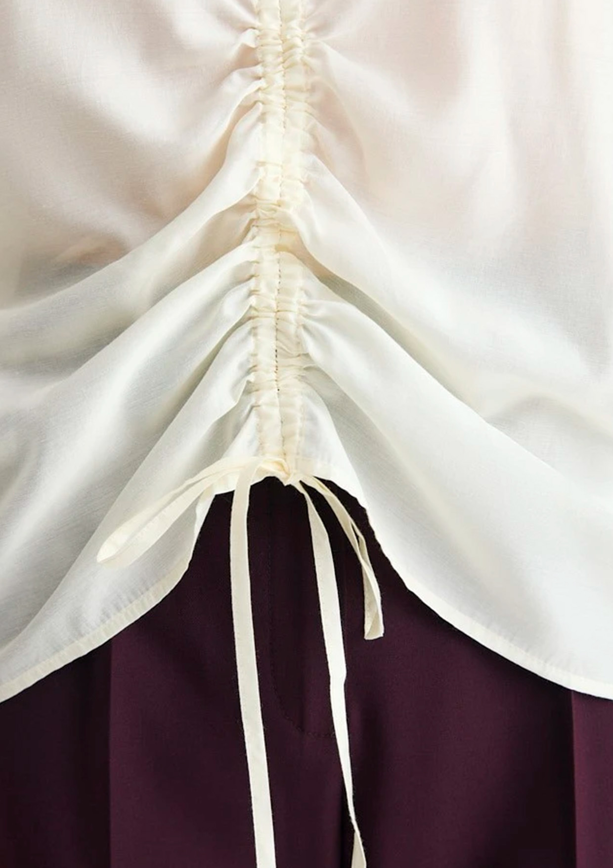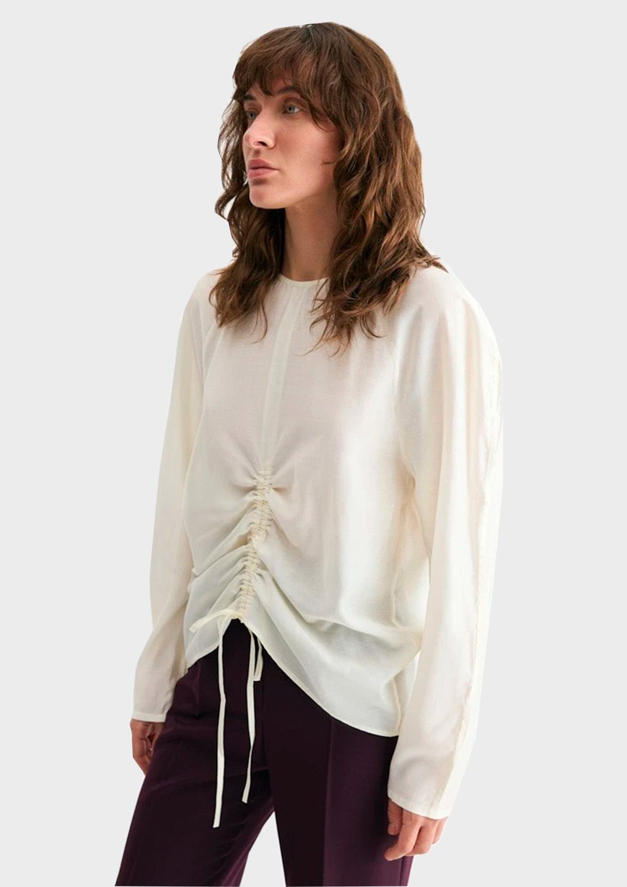 Прямая блуза с расширенным плечом и длинным рукавом реглан. Вертикальная кулиса с двумя шнурками по передней части блузы позволяет регулировать объем.