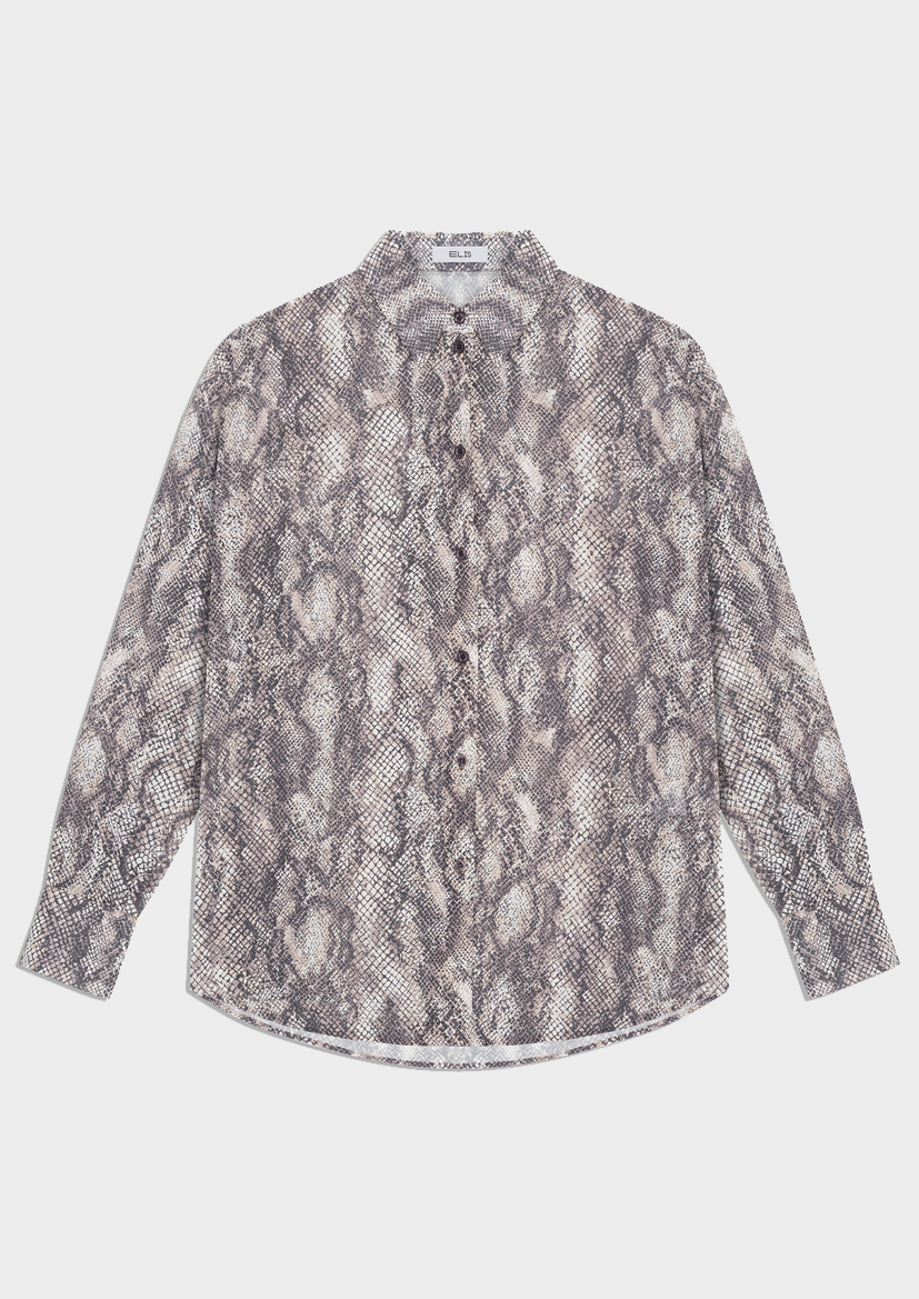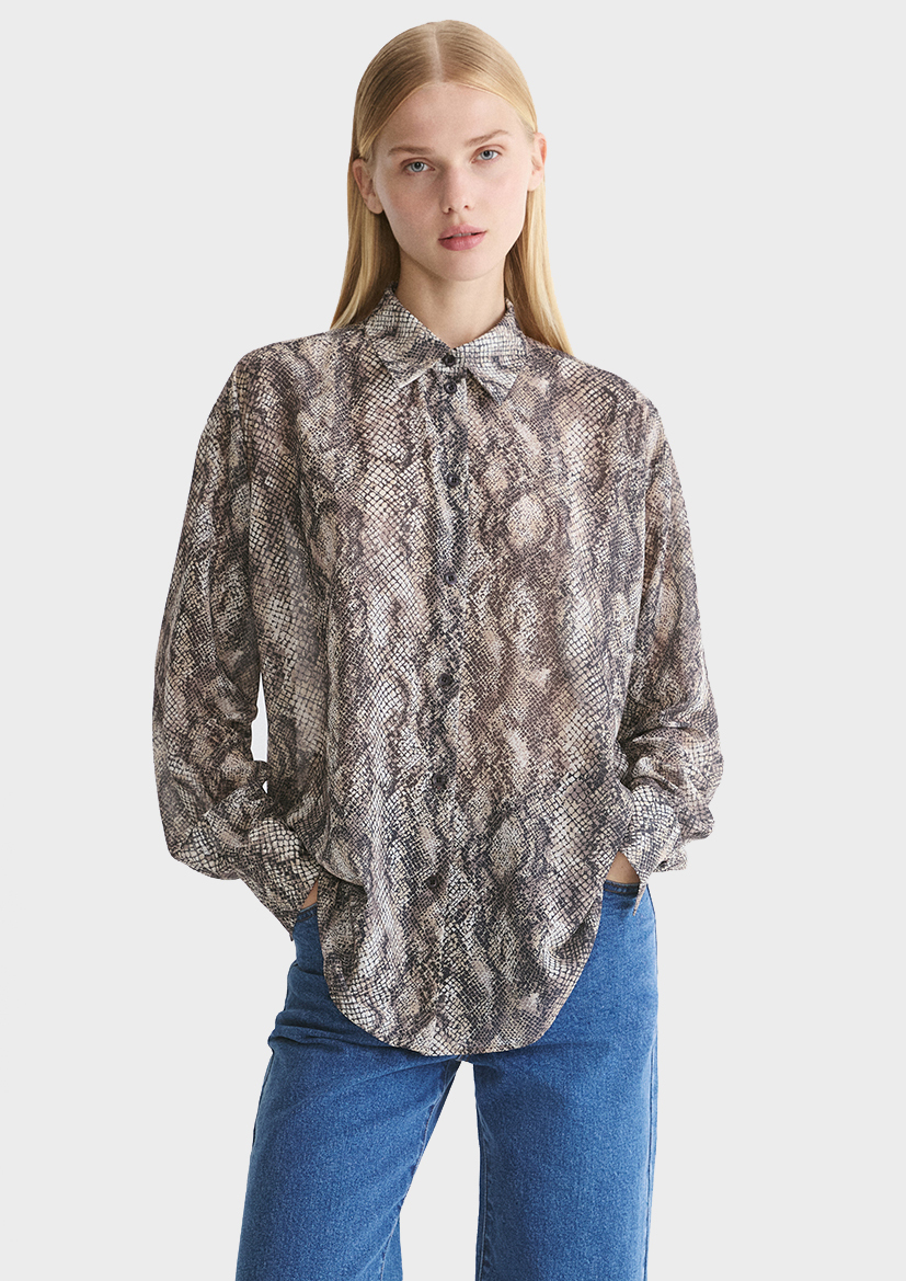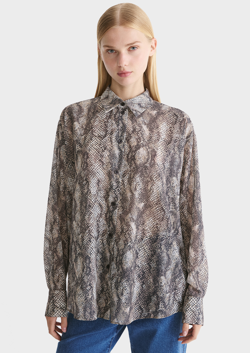 Блуза с серо-коричневым анималистичным узором "рептилия" - утонченная вещь с характером. Классический рубашечный крой с отложным воротником и центральной застежкой на пуговицы выглядит строго, а деликатный блеск ткани добавляет образу изысканности.