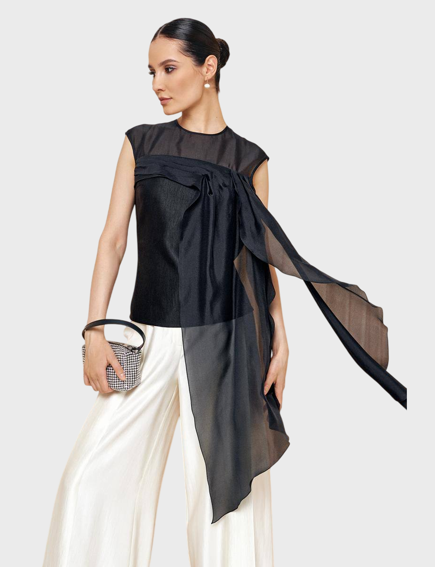 Позвольте чёрной блузе "NOCHE MIO" стать вашим секретным оружием стильного образа! Элегантные линии, безупречный крой – всё это поможет создать неповторимый шарм и подчеркнуть достоинства фигуры. Удобная молния спереди делает надевание лёгким и быстрым.
