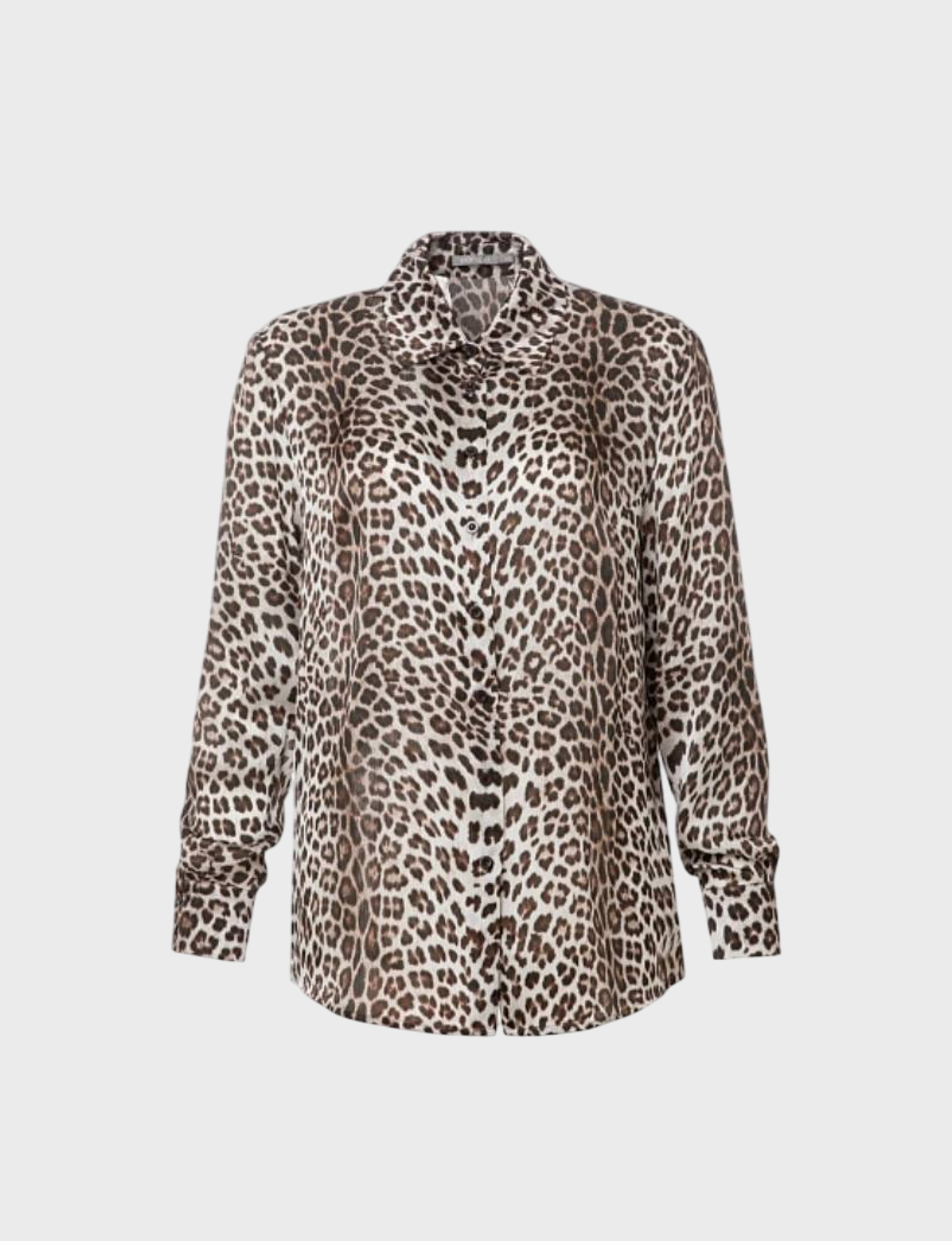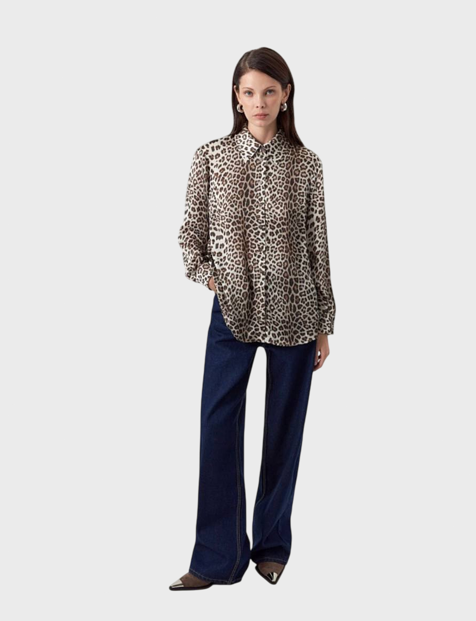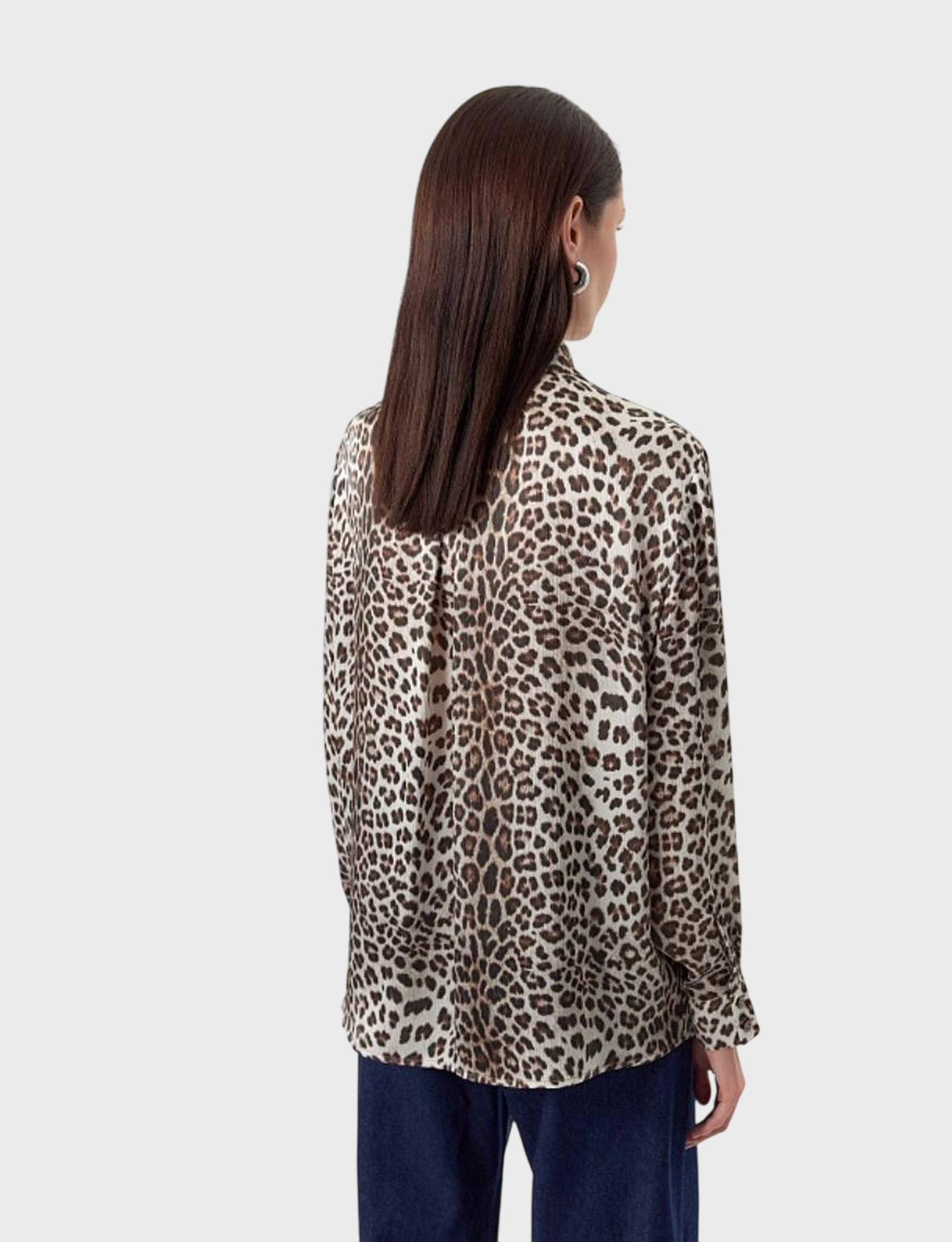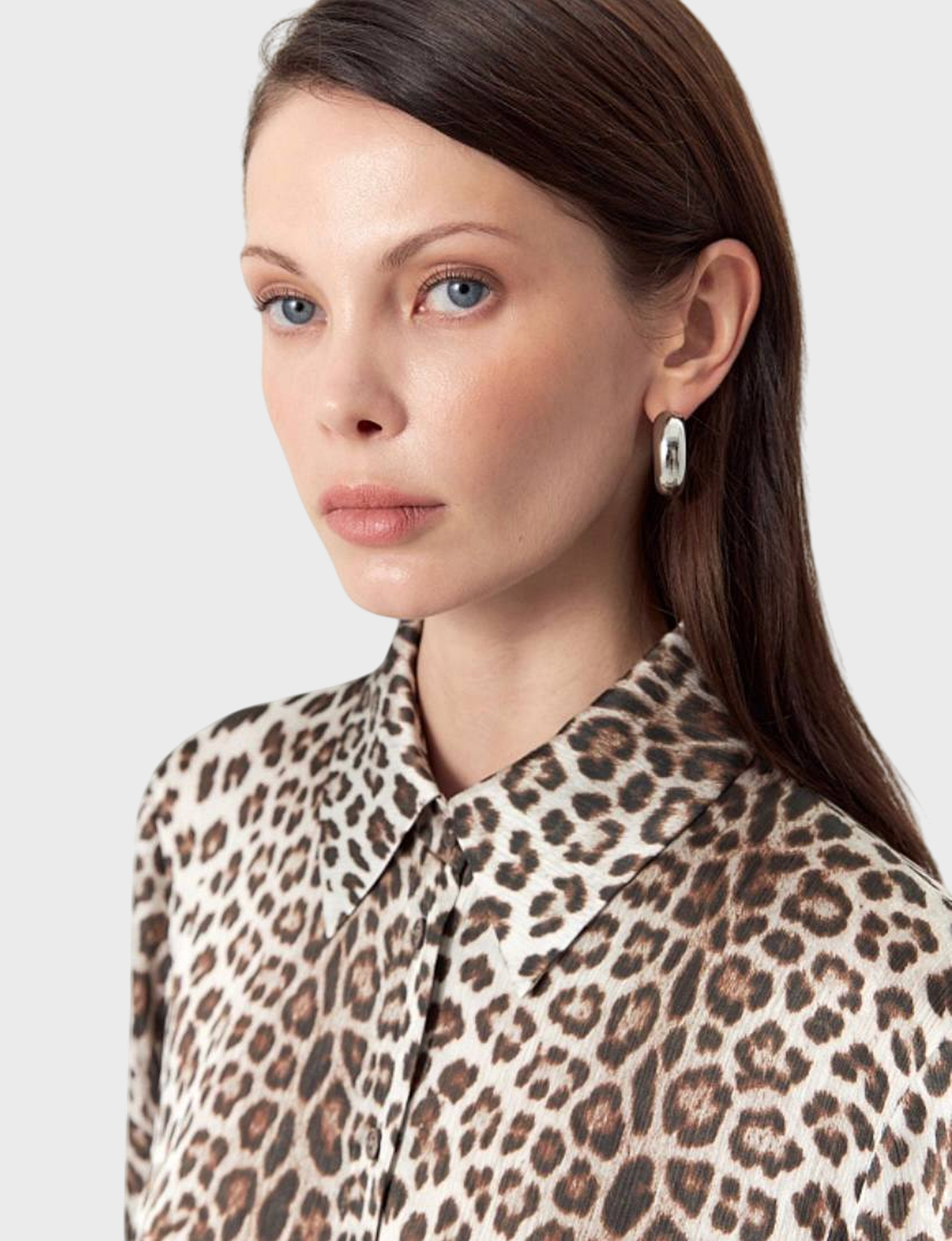 Романтичная прямая блуза с отложным воротником, планкой с пуговицами из крешированного атласа с анималистичным принтом.
